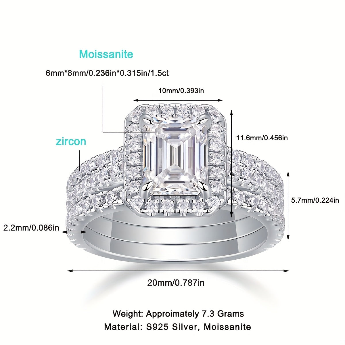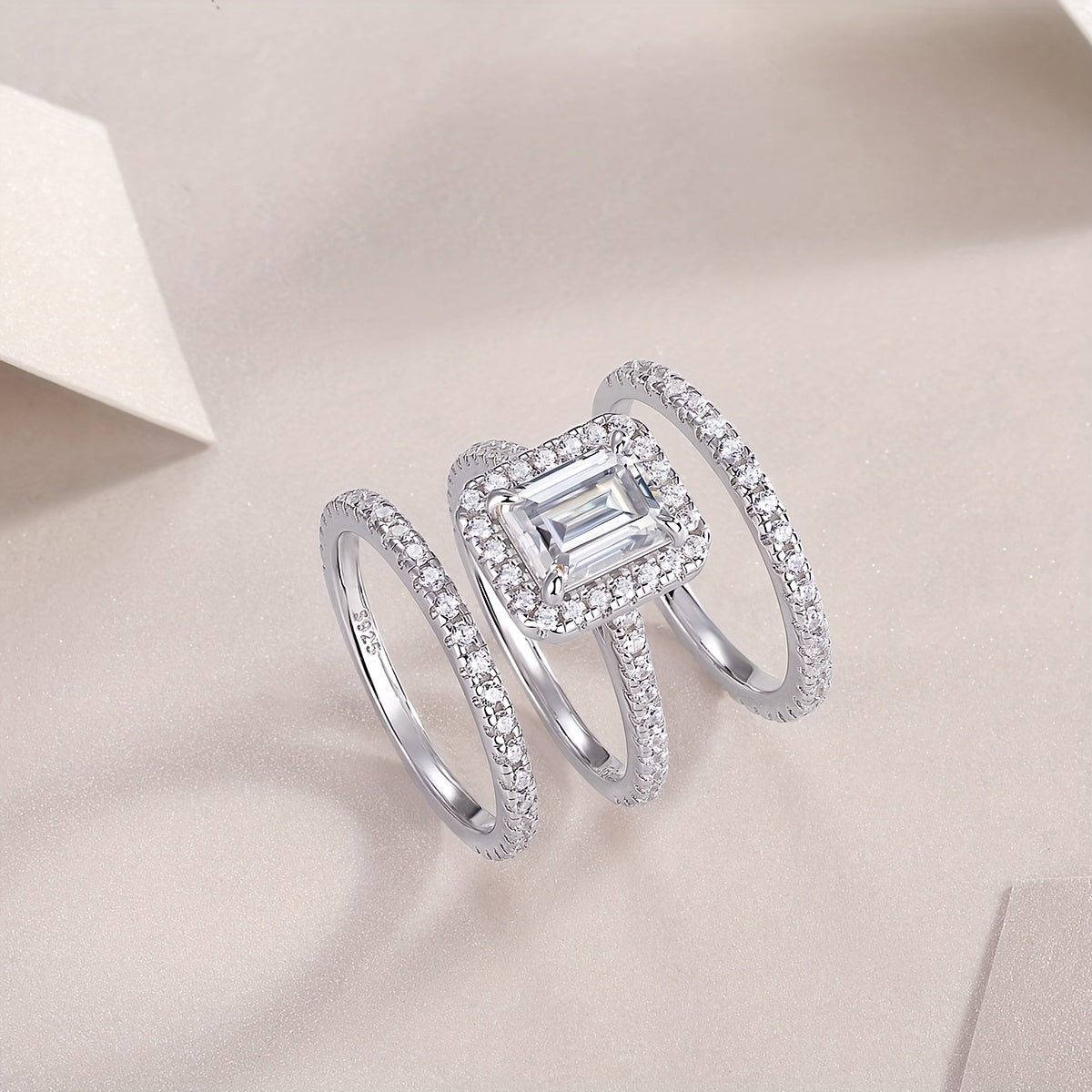 This elegant set includes an engagement ring and wedding band made of 925 silver with sparkling moissanite stones. Perfect for proposals or special occasions.