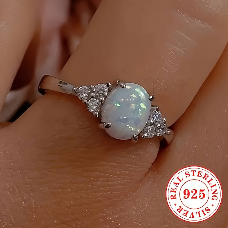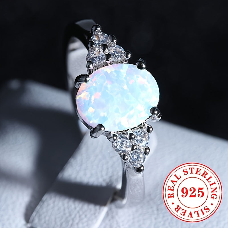 Stunning synthetic opal ring with four prong setting, ideal for wedding, banquet, or vacation. October birthstone design.