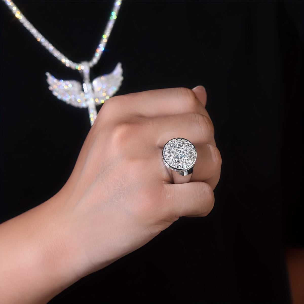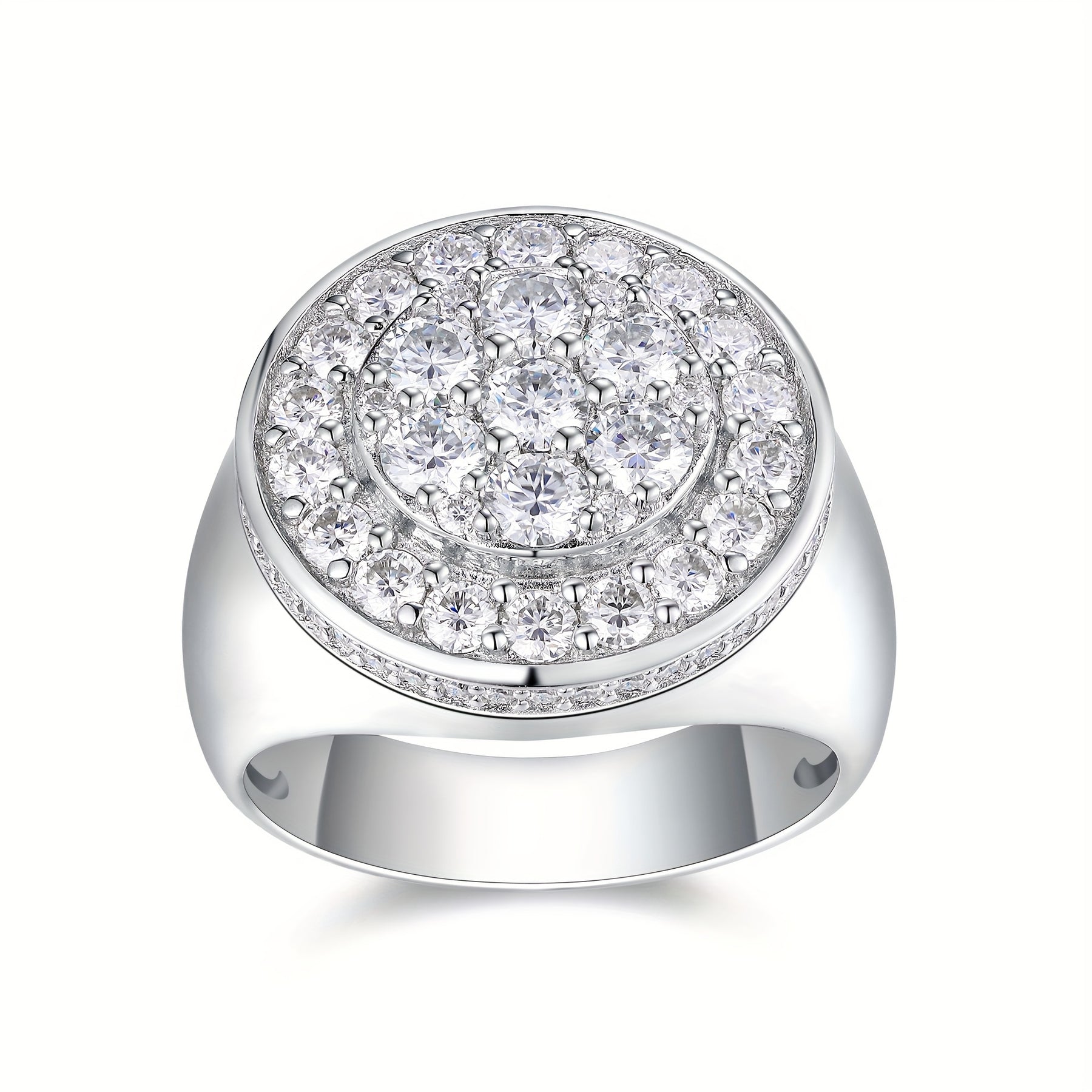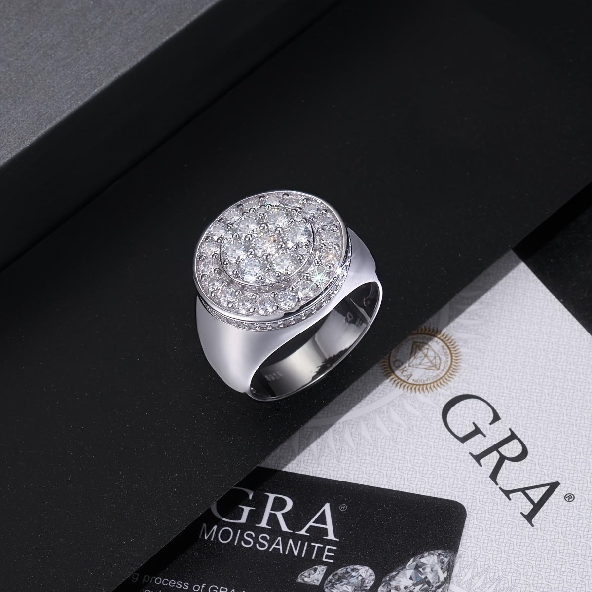Elegant 925 sterling silver ring featuring a 3 carat Moissanite stone with a light ring plated in PT950 Golden Meson. Manufacturer stock available.