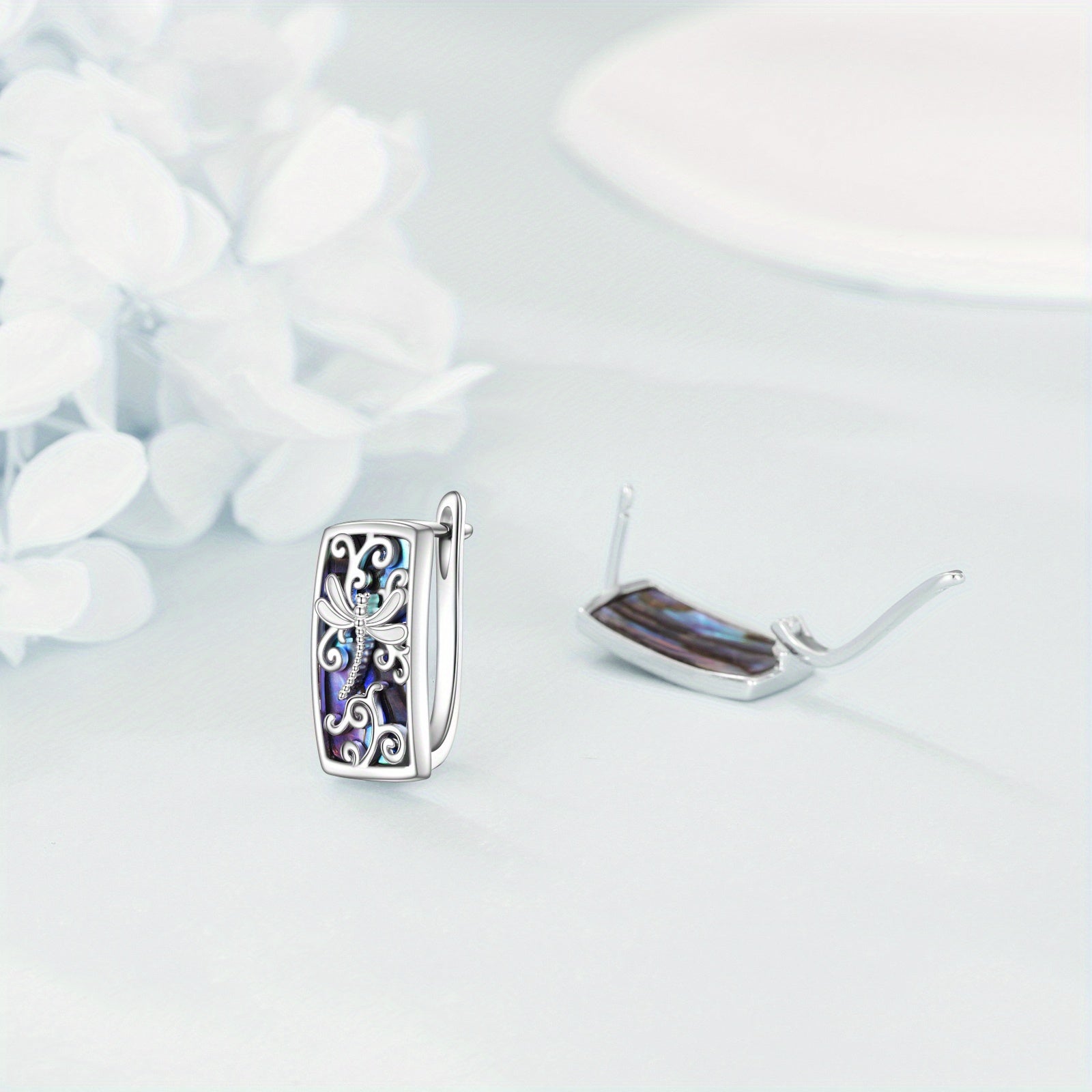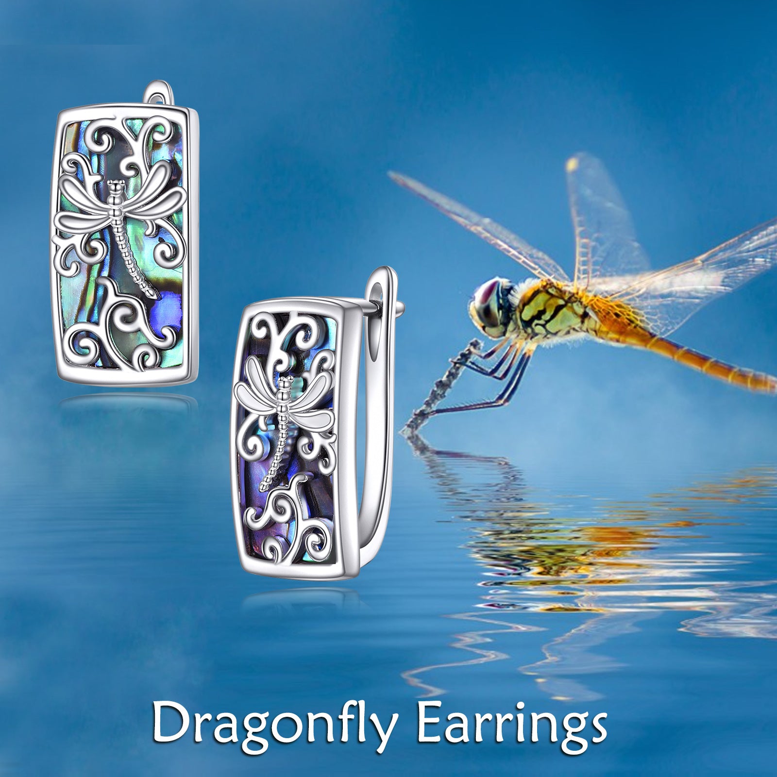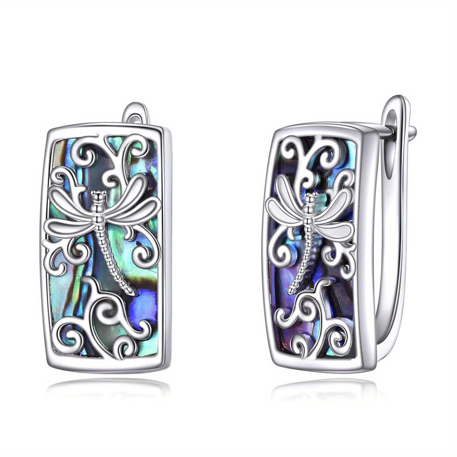 These elegant dragonfly hoop earrings feature abalone shell accents and intricate filigree designs. Made of sterling silver, these dangle drop huggie earrings are a stunning addition to any outfit.