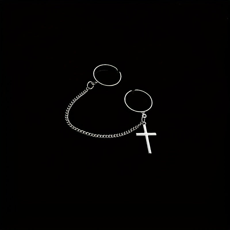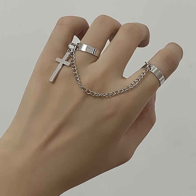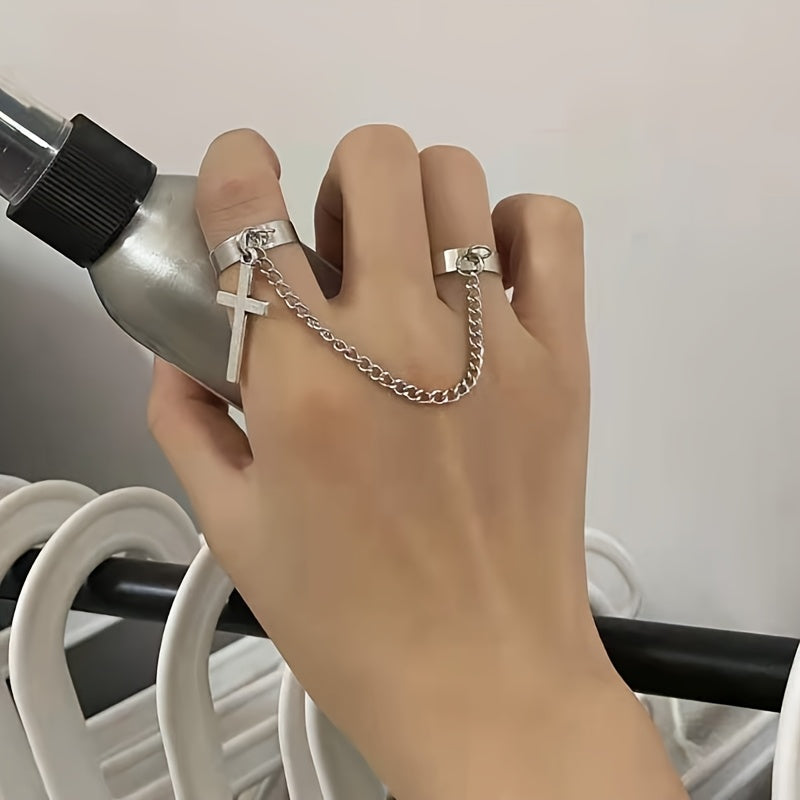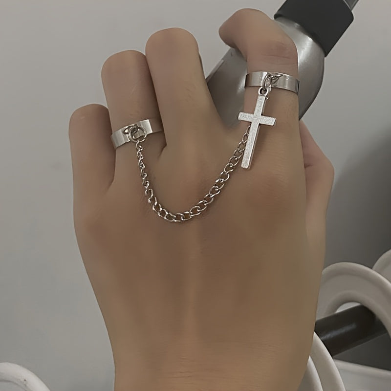 This minimalist two-finger ring features an open cross connect design with an uncoated metallic finish, perfect for casual attire.