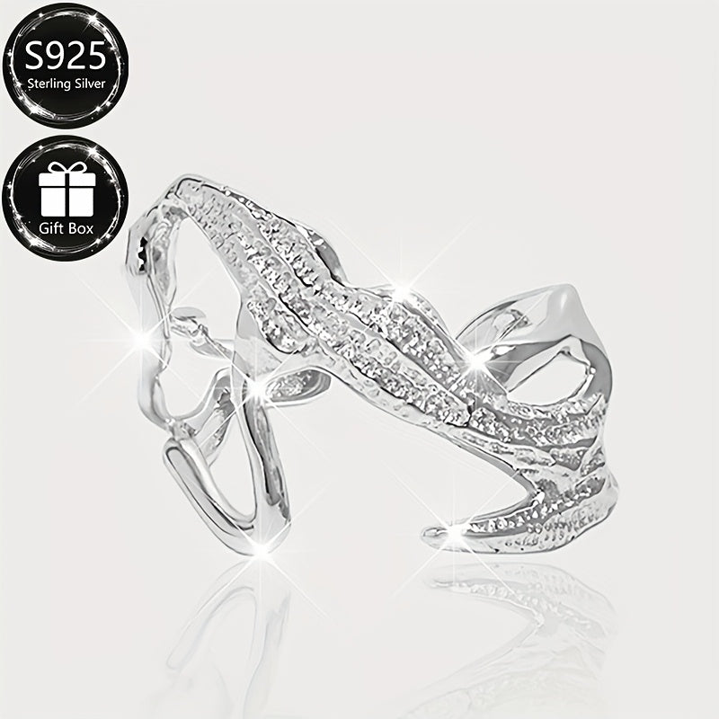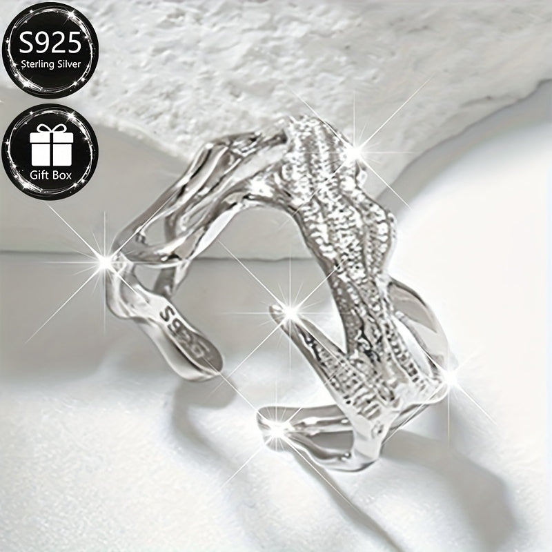 This adjustable open ring for women is made of 925 sterling silver with an irregular texture hollow design, perfect for parties and gift-giving.
