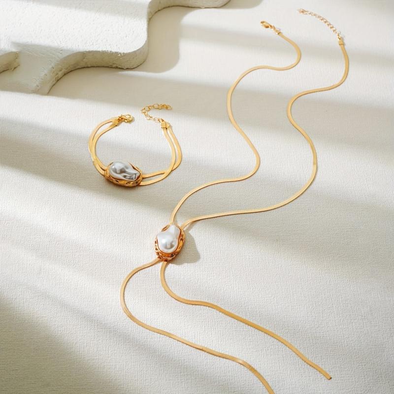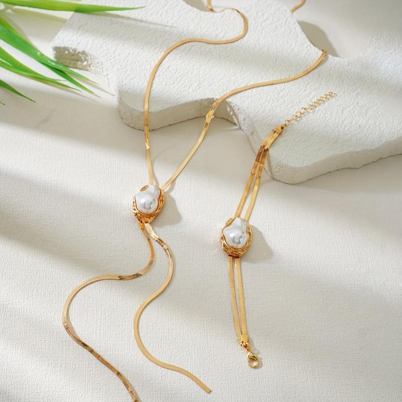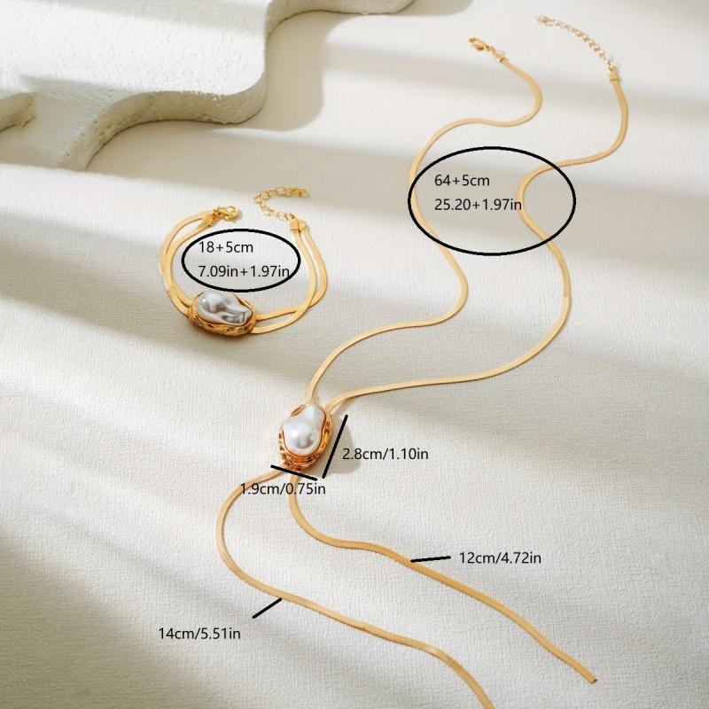 Elevate your look with this baroque-inspired jewelry set featuring an acrylic pearl and snake chain design. The Y-shaped necklace and bracelet are perfect for daily wear.