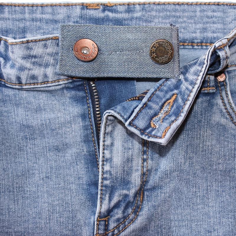 This belt extender is made of denim material with high metal buttons. It features 2 button holes and is designed to extend the waistband of your jeans.