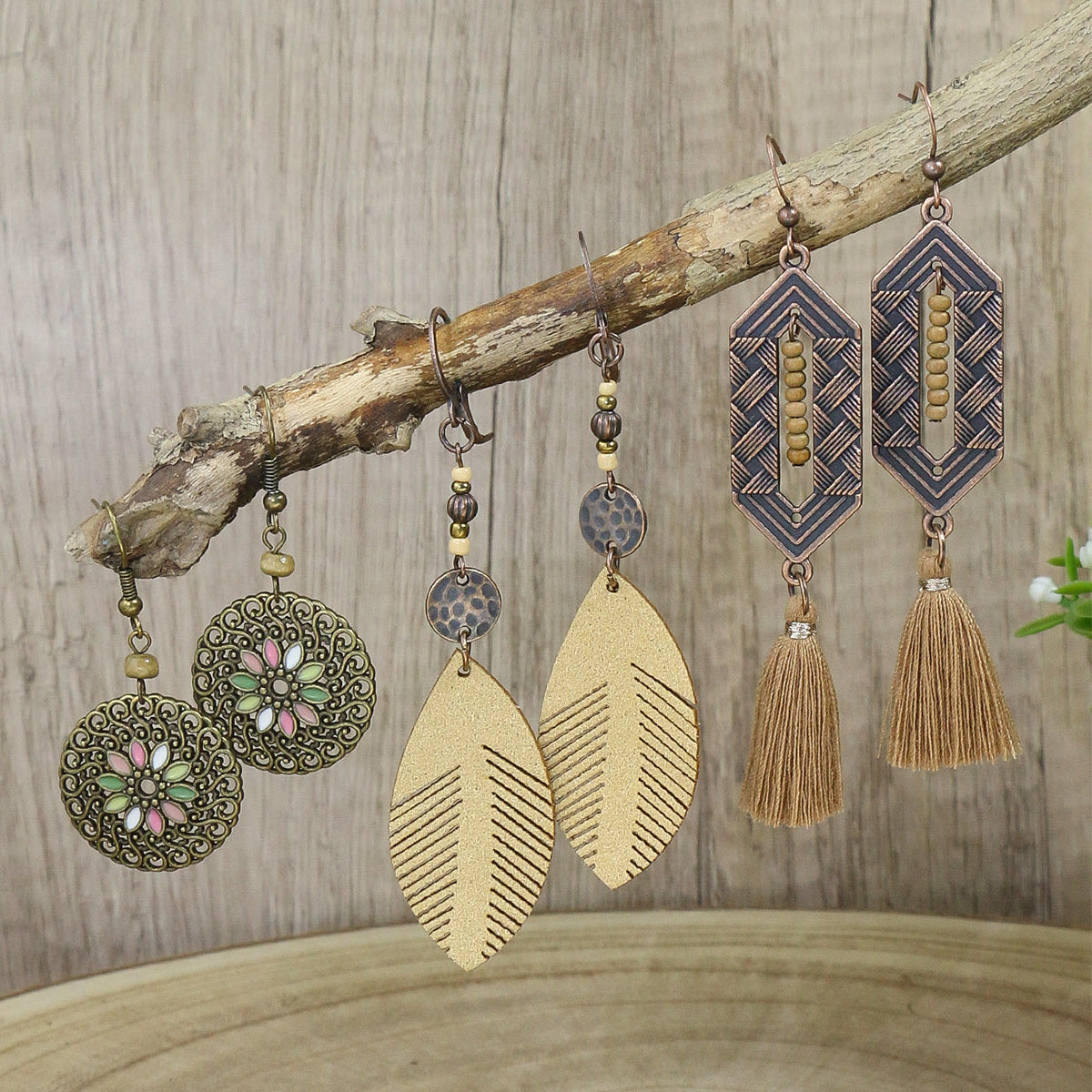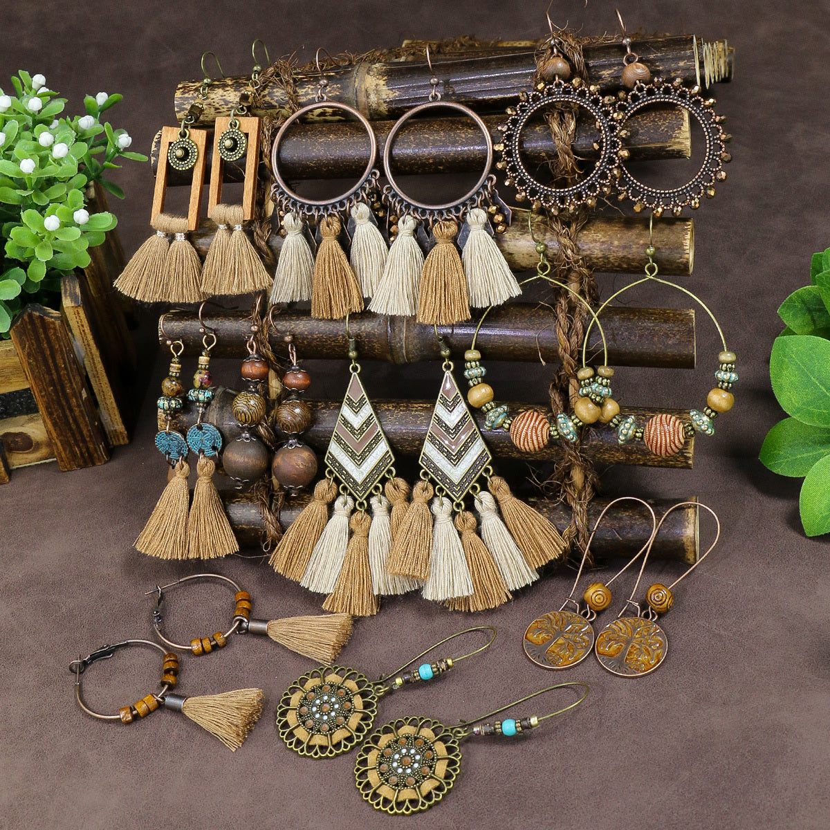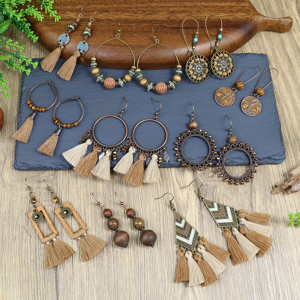 Bohemian Coffee Bronze Wood Bead Tassel Earrings
