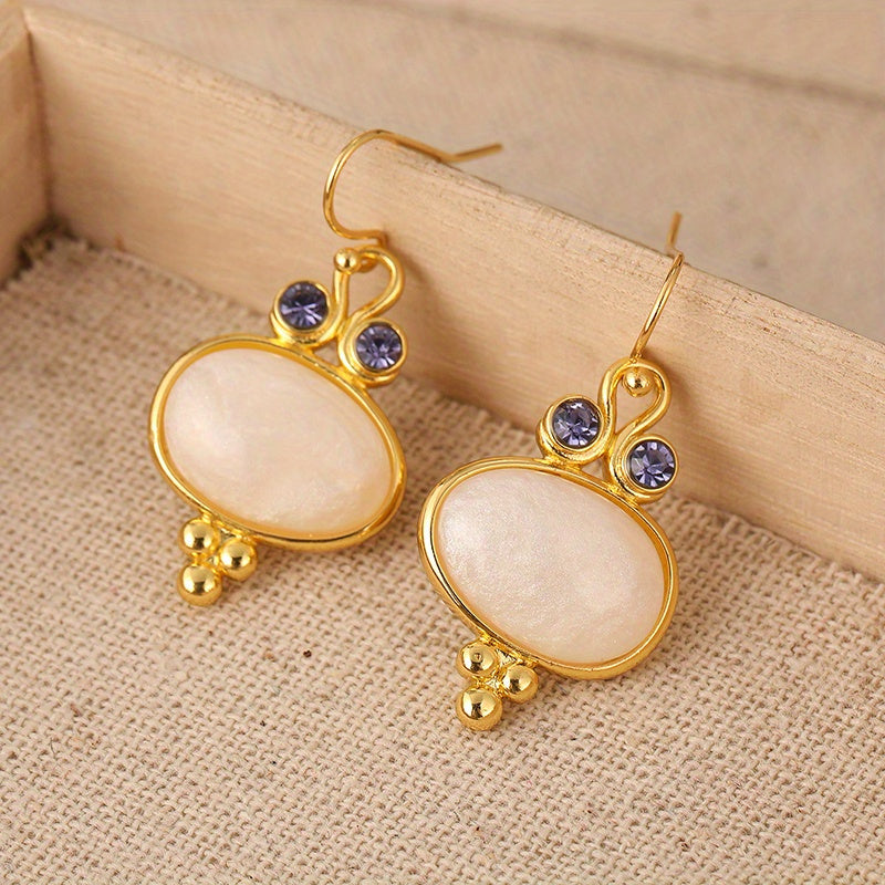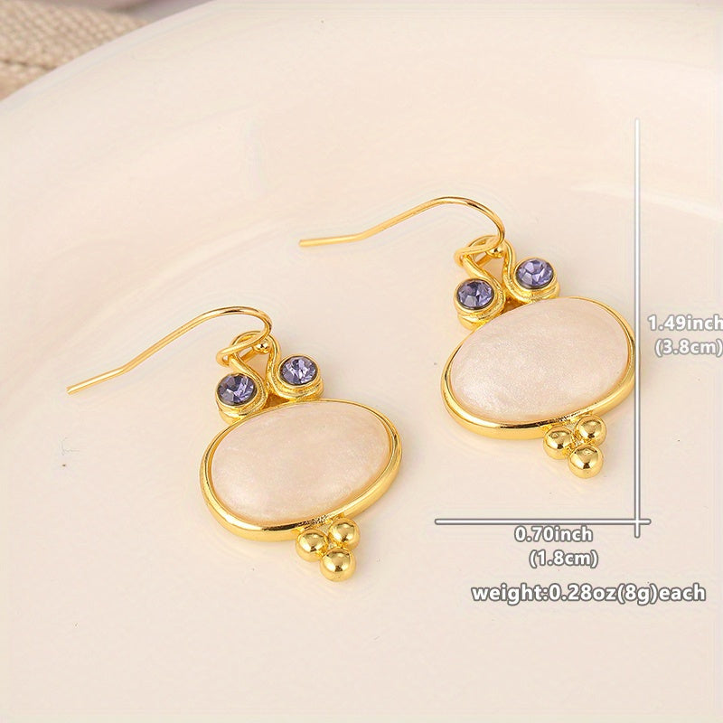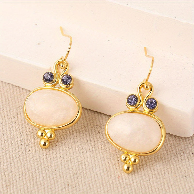 Chic and elegant pair of Bohemian style oval earrings featuring oval stones and cubic zirconia accents. Made of golden plated copper, perfect for weddings and parties.