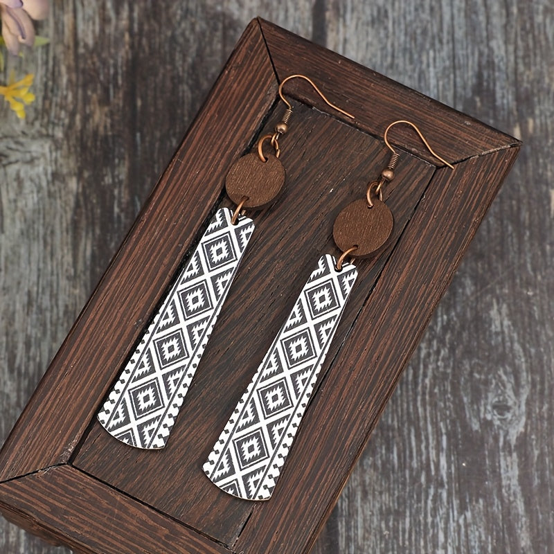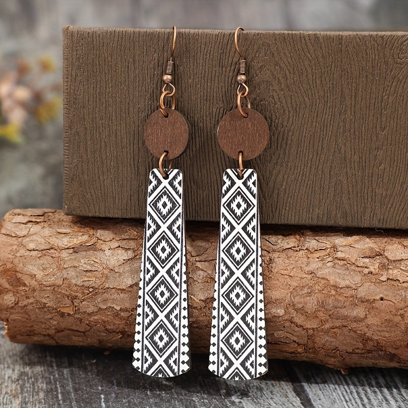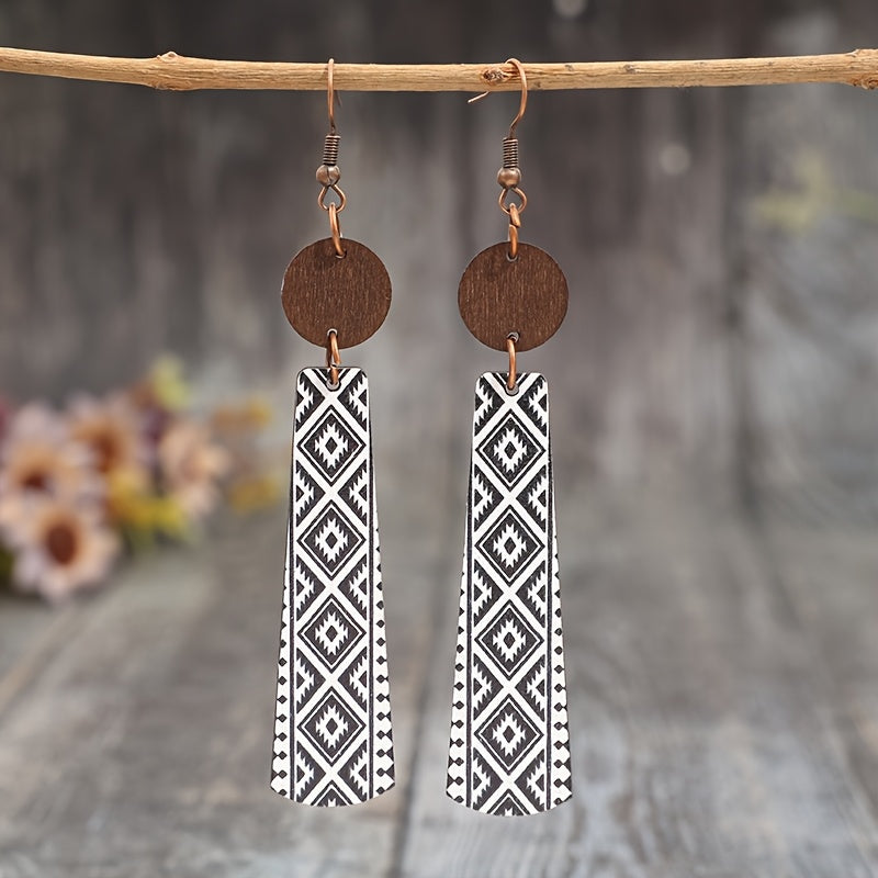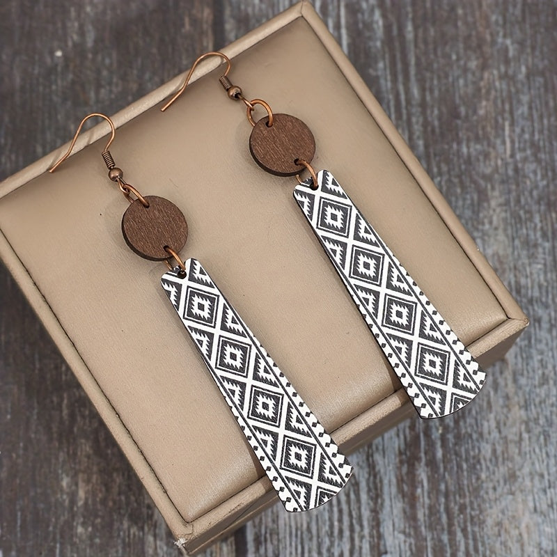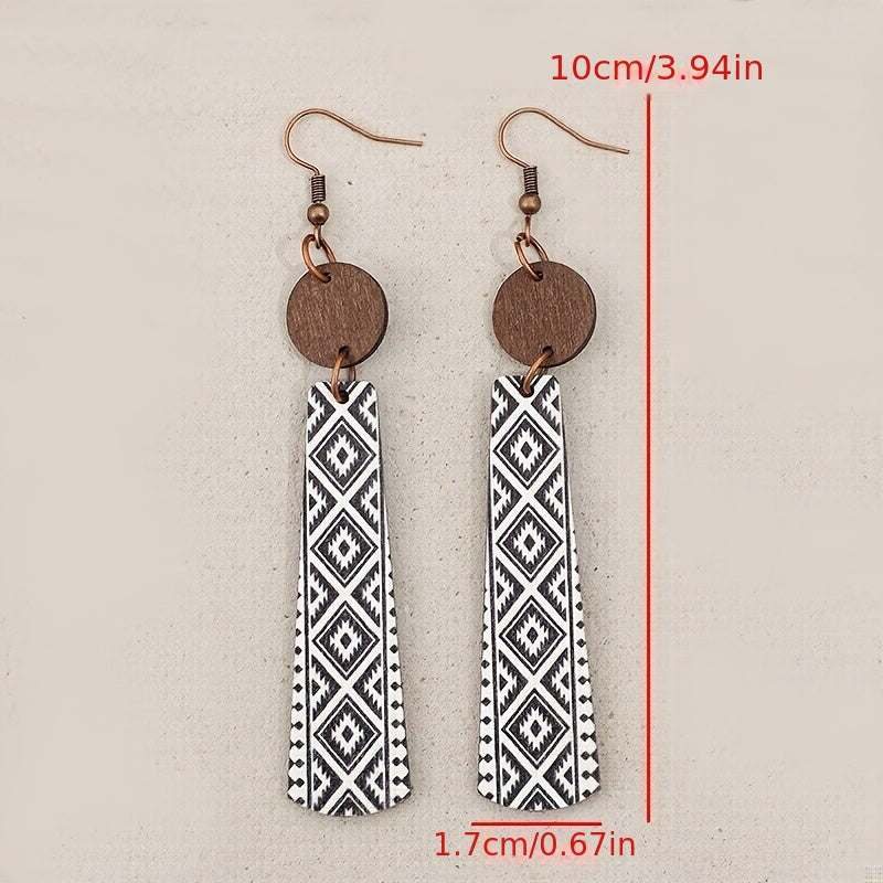 Bohemian Retro Wooden Geometric Print Dangle Earrings with Brown Accents