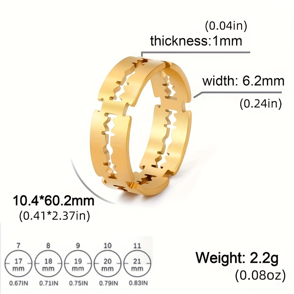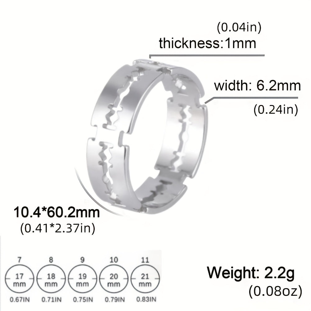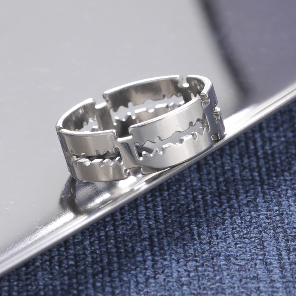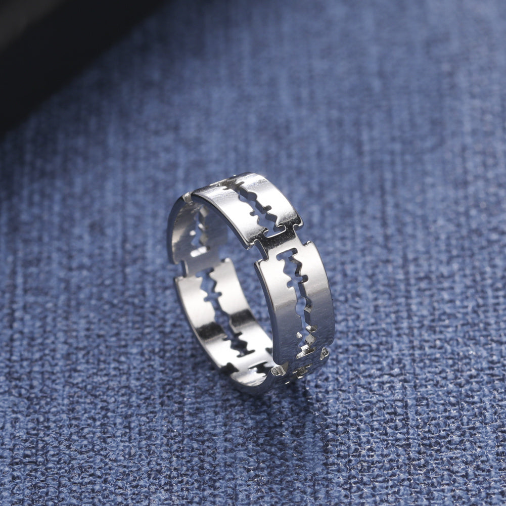 This edgy punk rock ring features three intertwined razor blade designs, making it a unique and stylish accessory for those with a bold fashion sense.