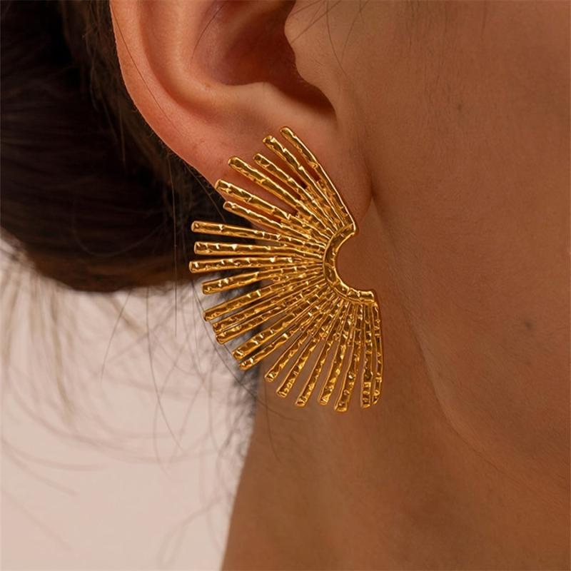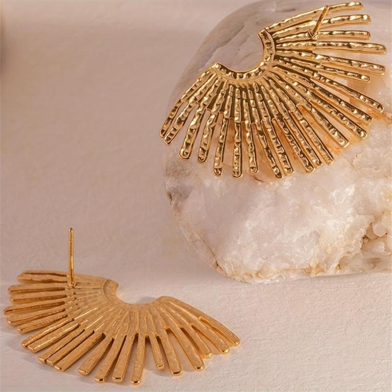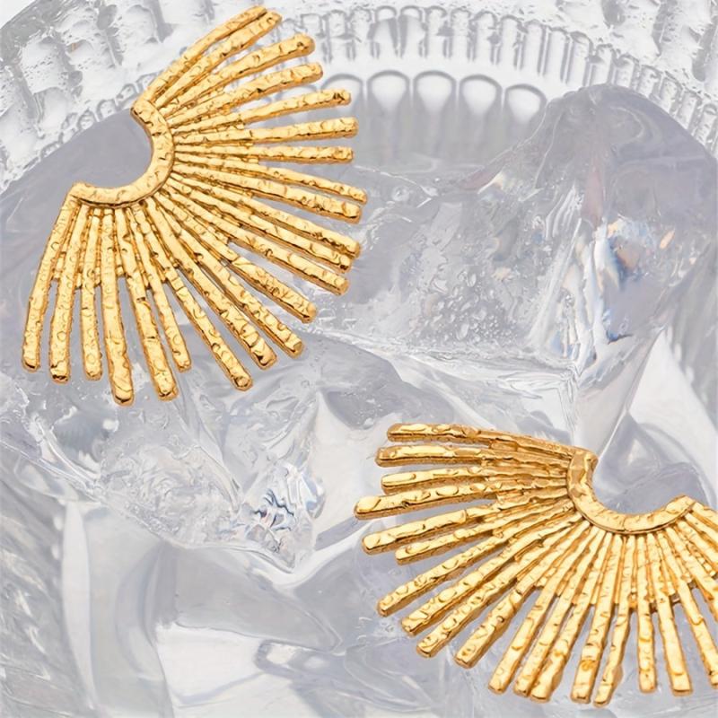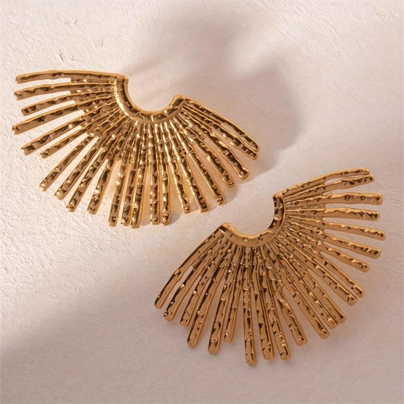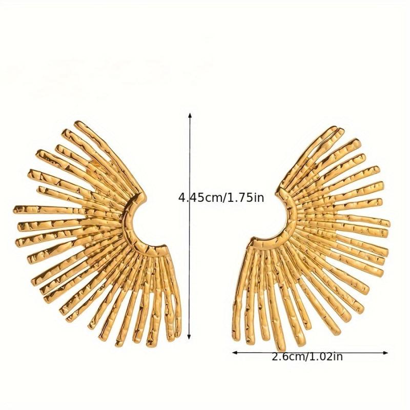 Elevate your style with these fashionable vintage-inspired fan-shaped earrings designed for women. These golden sunburst drop earrings are perfect for adding a touch of bohemian charm to any outfit.