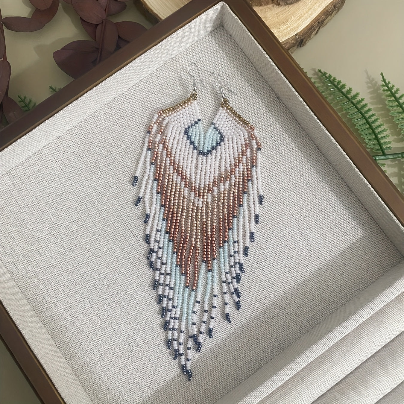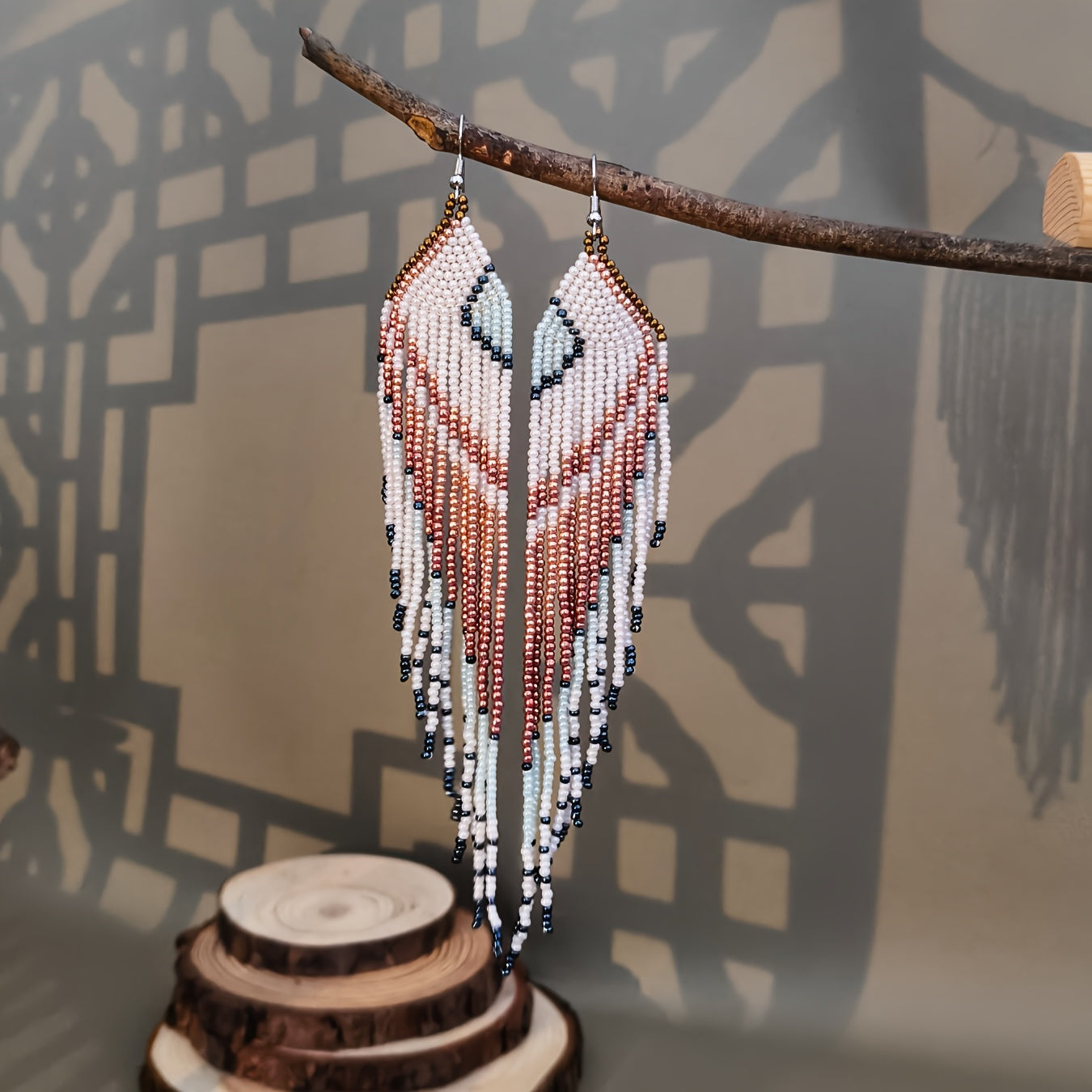 Add a touch of bohemian flair to your outfit with these long tassel earrings featuring a handwoven geometric pattern and glass bead stringing. Perfect for daily wear or vacation, these versatile earrings make a great gift.