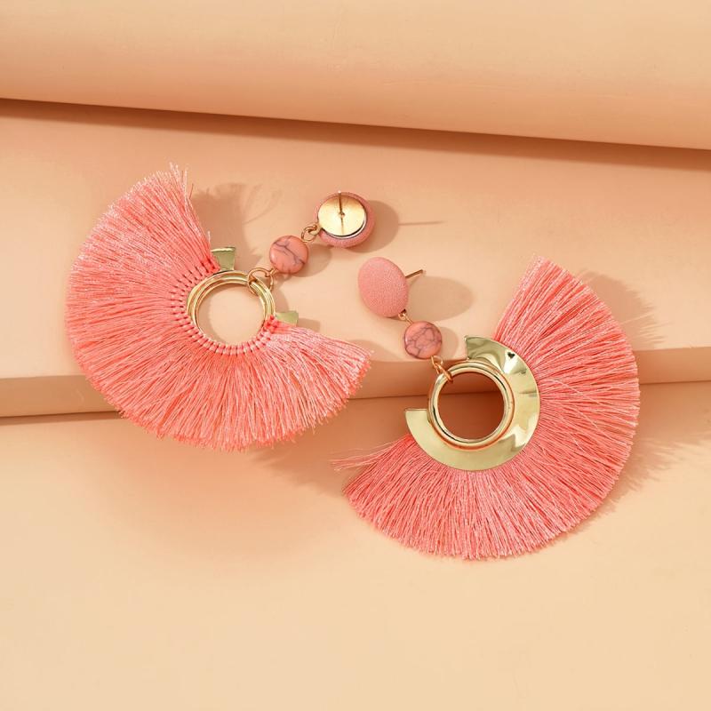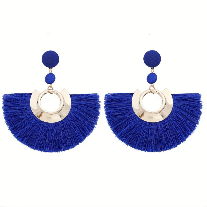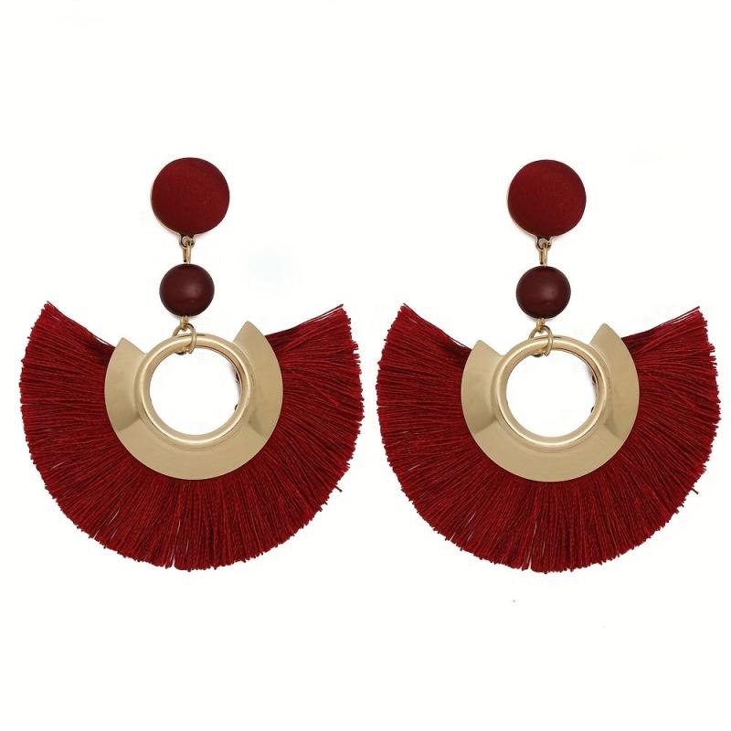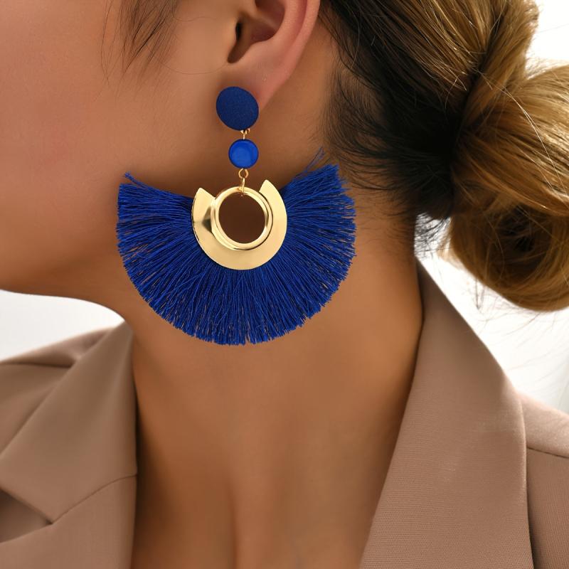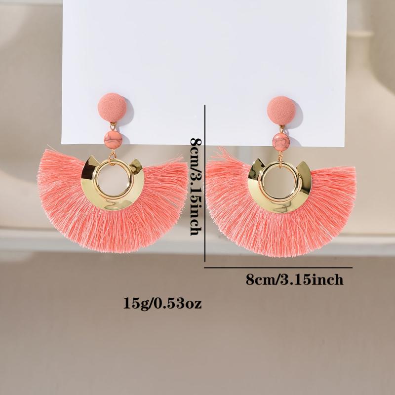 Add a touch of bohemian flair to your look with these fan-shaped earrings featuring tassels and gold accents. Perfect for daily wear or as a gift for women.