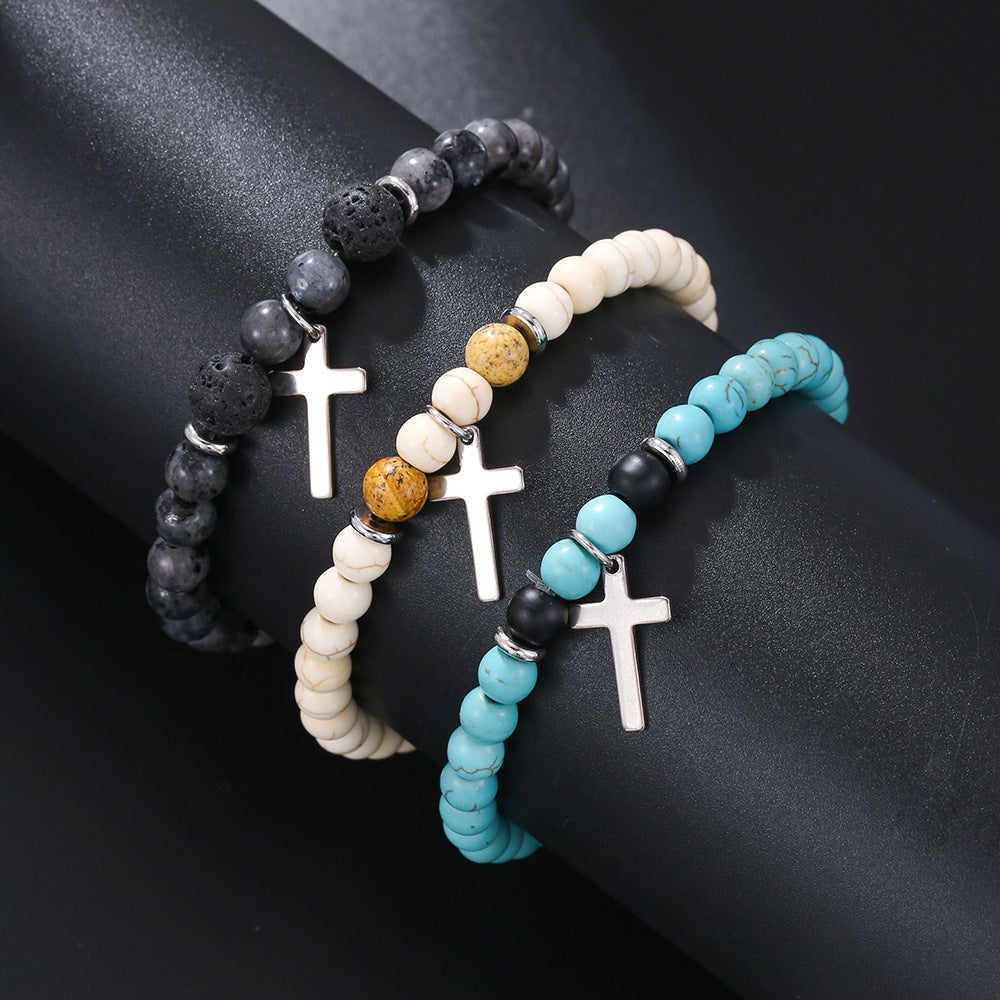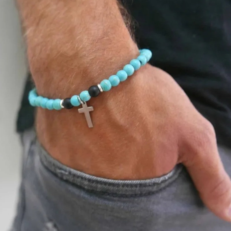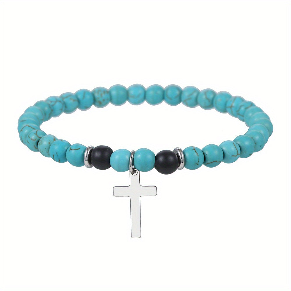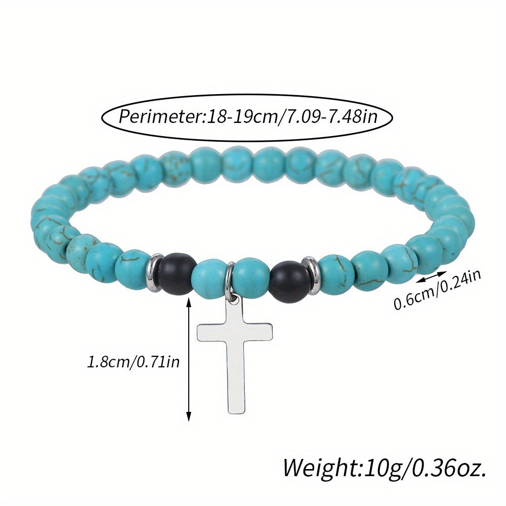 This bohemian style bracelet features synthetic turquoise beads and a cross pendant. It is elastic and suitable for both men and women.
