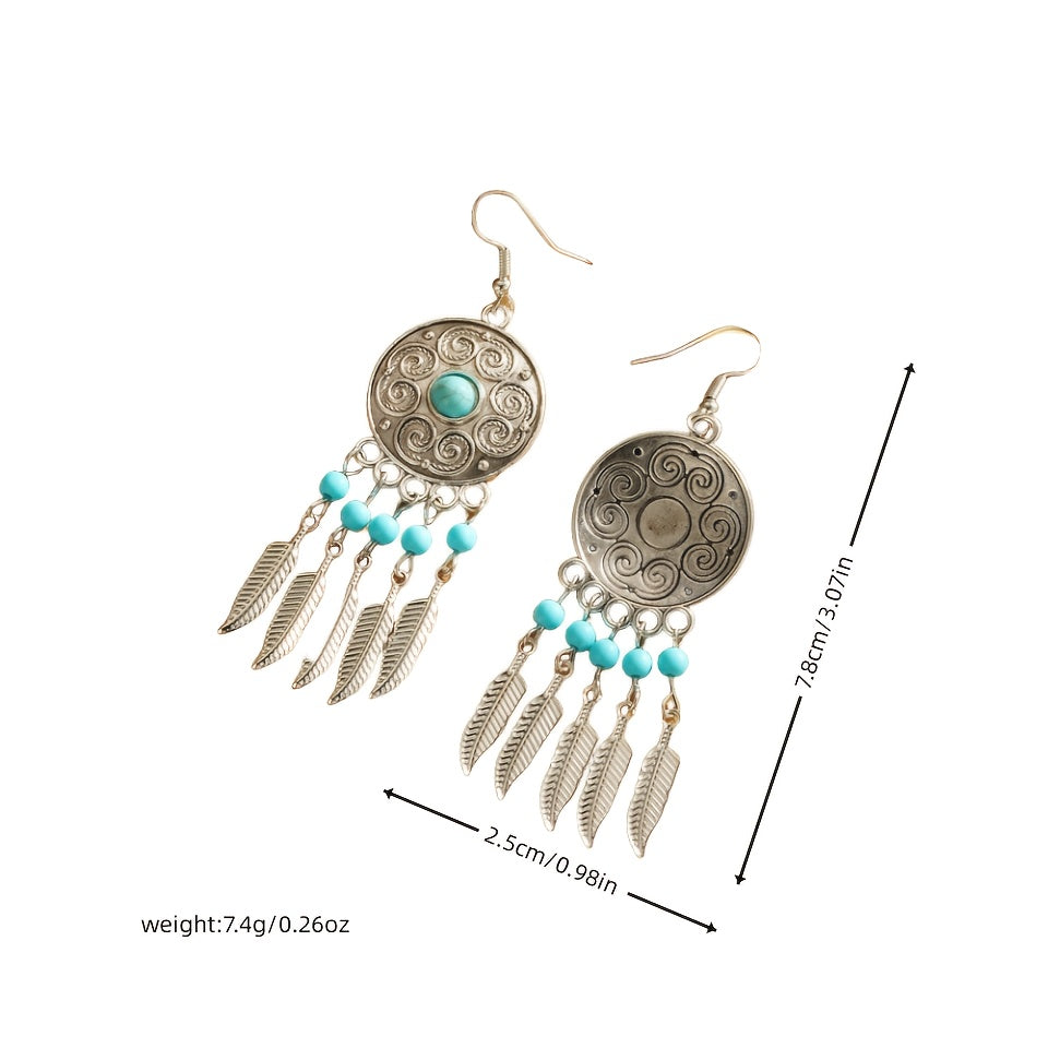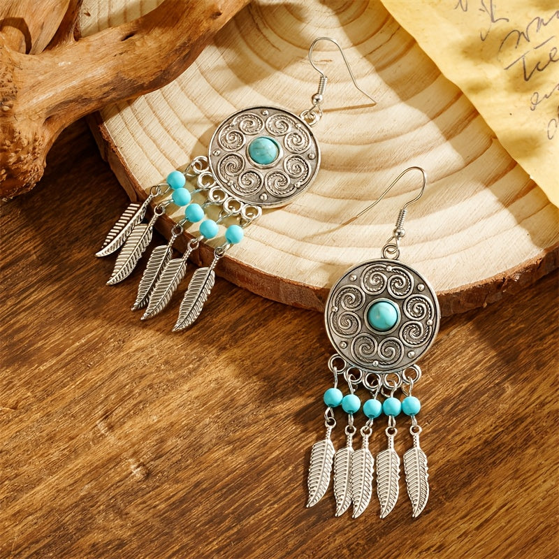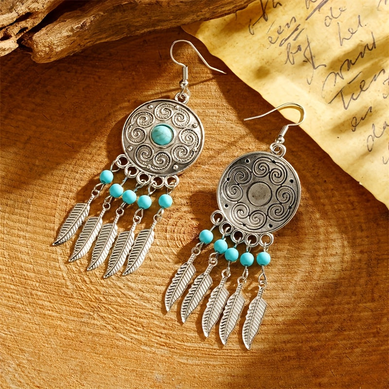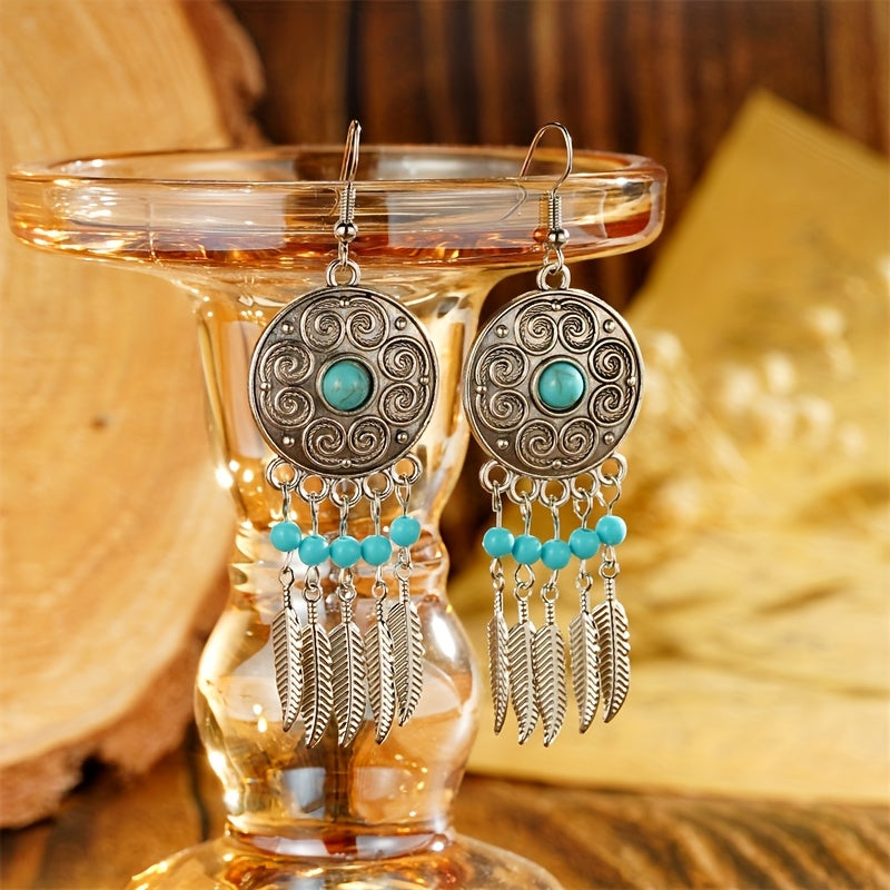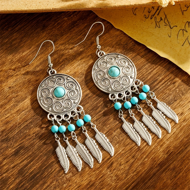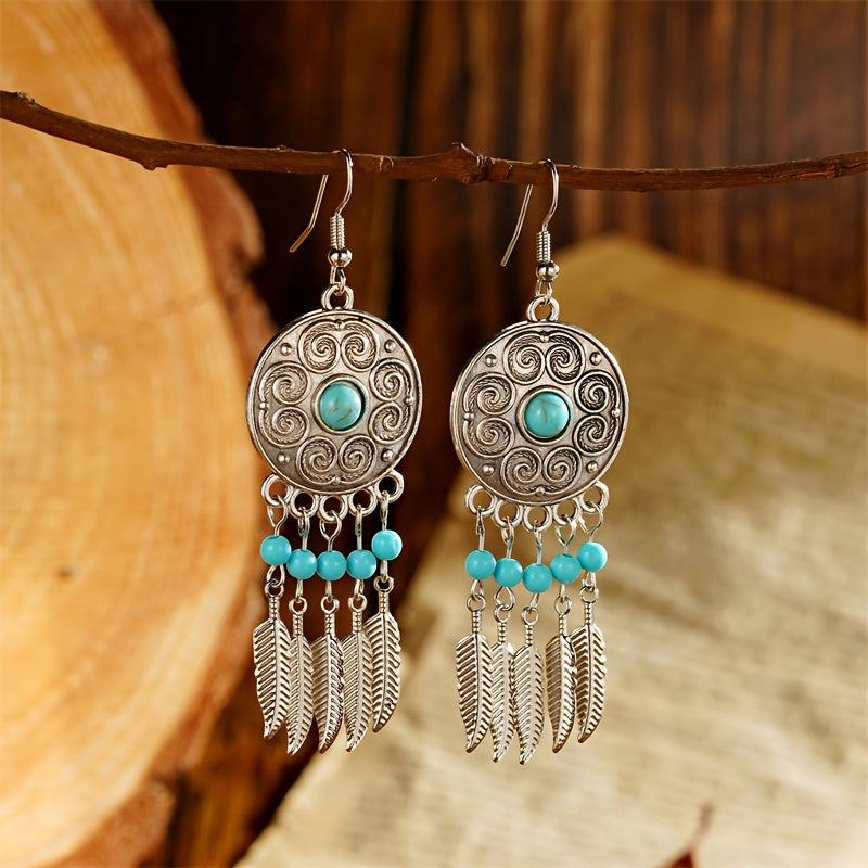 Add a touch of bohemian flair to your look with these vintage-inspired zinc earrings featuring faux turquoise tassels.
