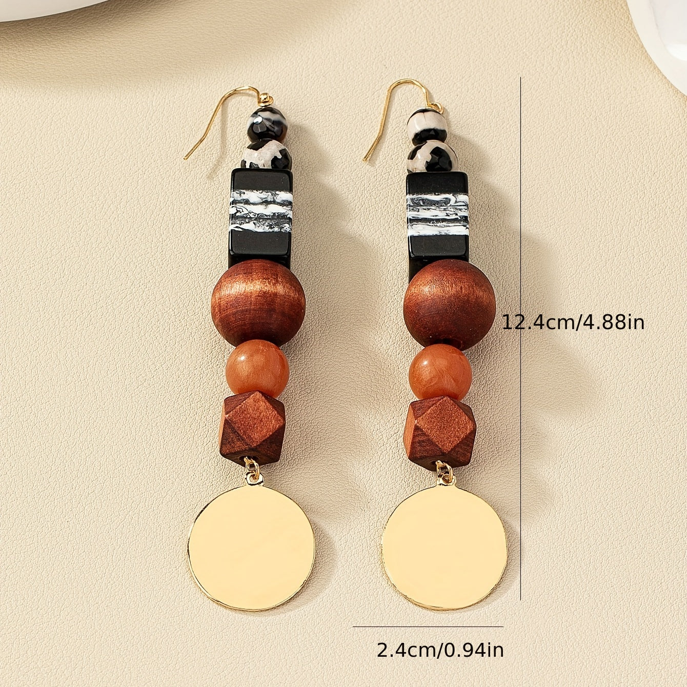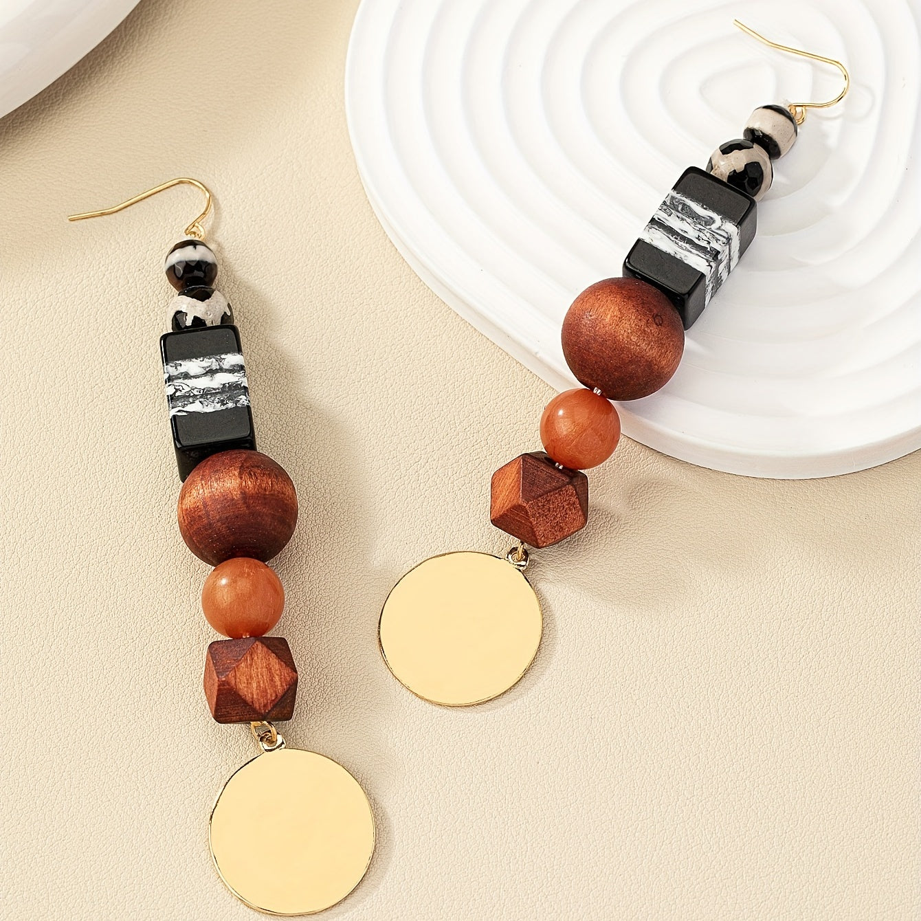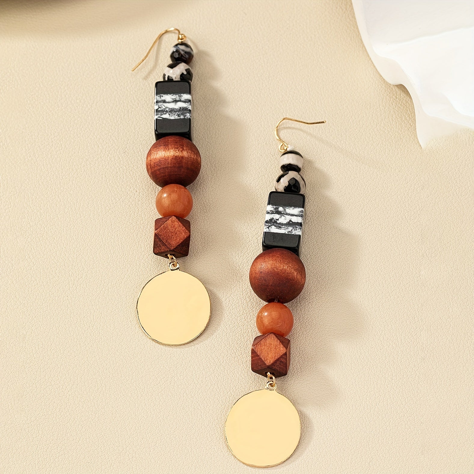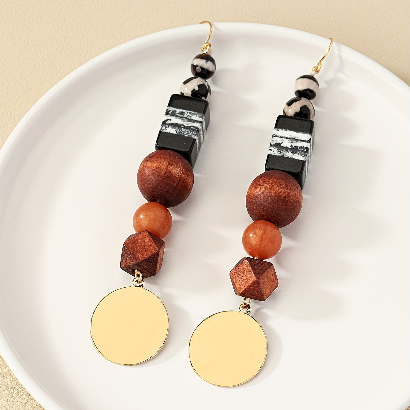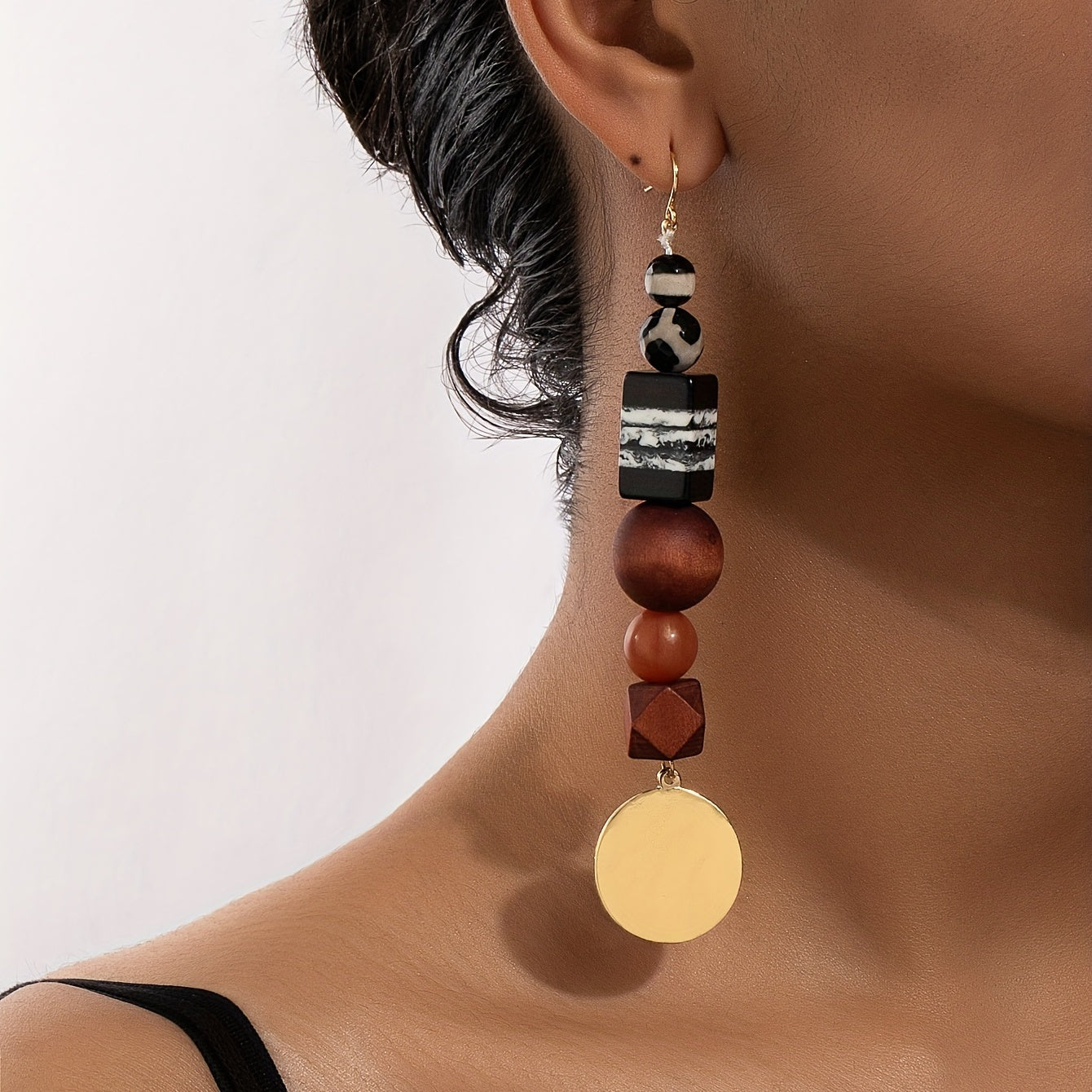 These vintage boho earrings feature long tassels with natural stone and wood beads accented by a touch of gold. Perfect for everyday wear or as a vacation accessory.
