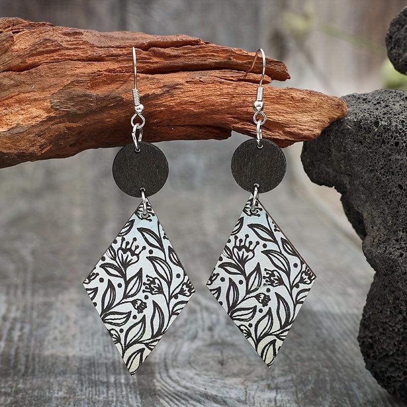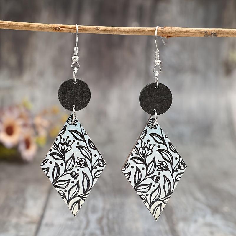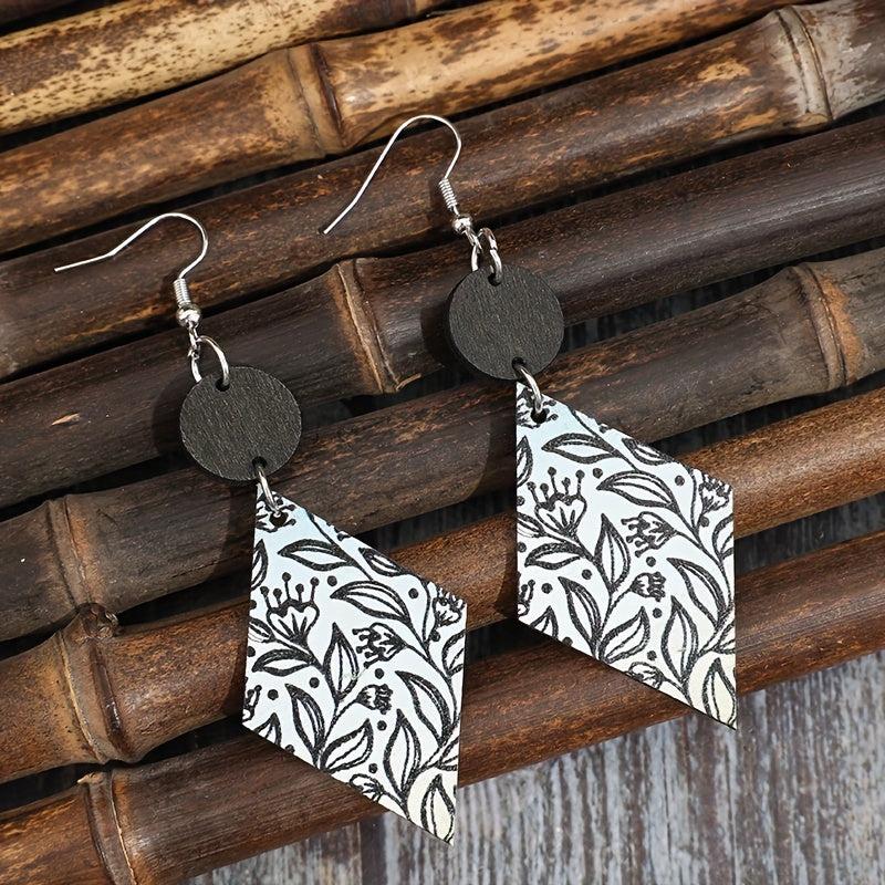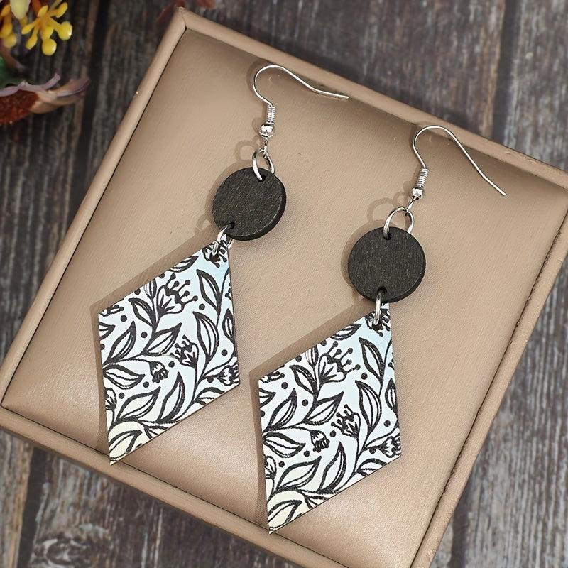 Add a touch of bohemian style to your look with these teardrop print pendant earrings. The combination of wooden and floral details creates a unique and eye-catching design.
