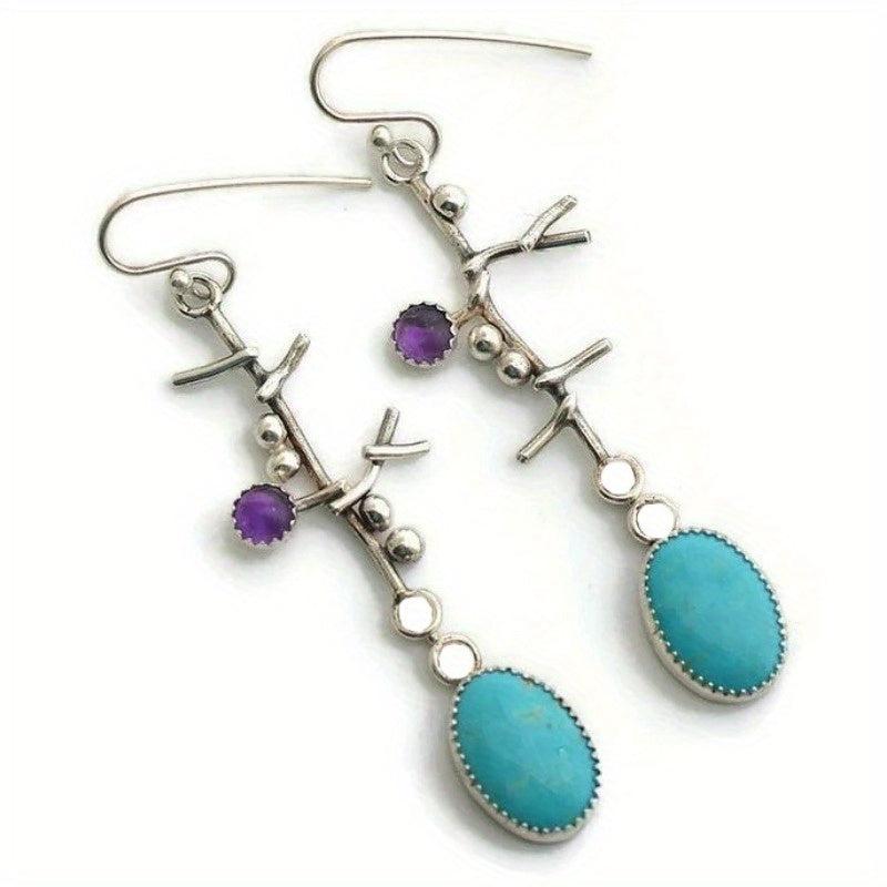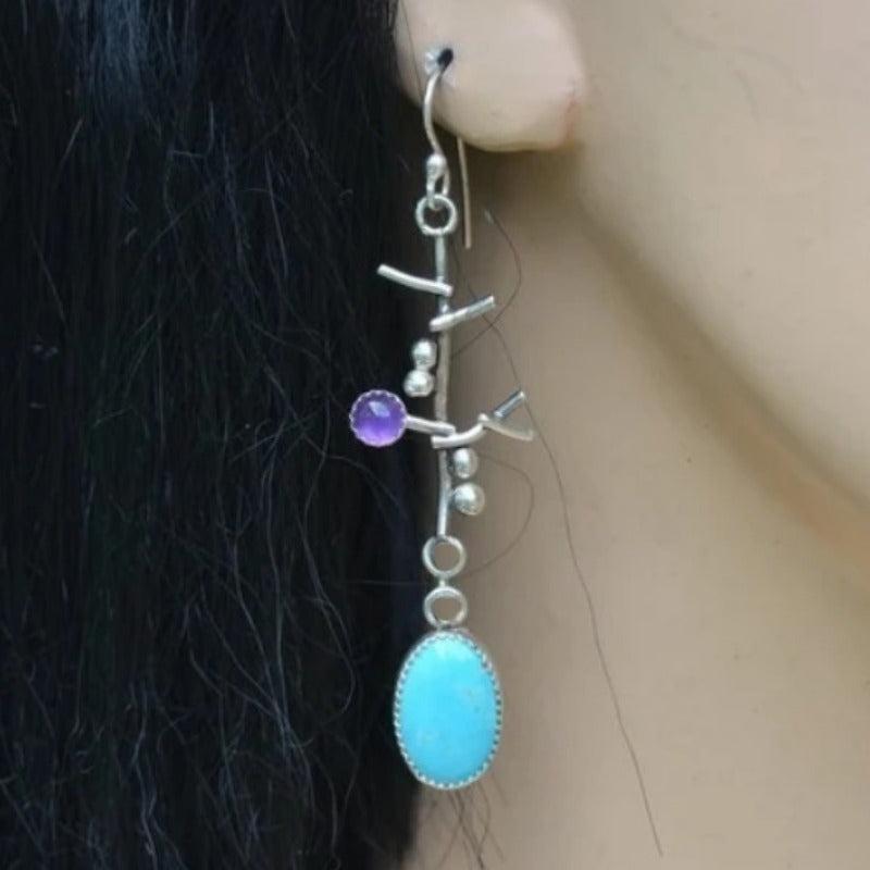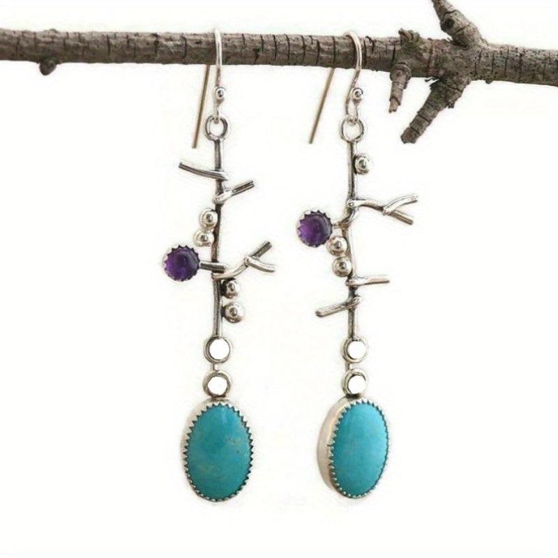 Artisan-crafted earrings featuring tree branches adorned with purple and pink beads, perfect for adding a boho touch to your casual attire or as a thoughtful gift for her.