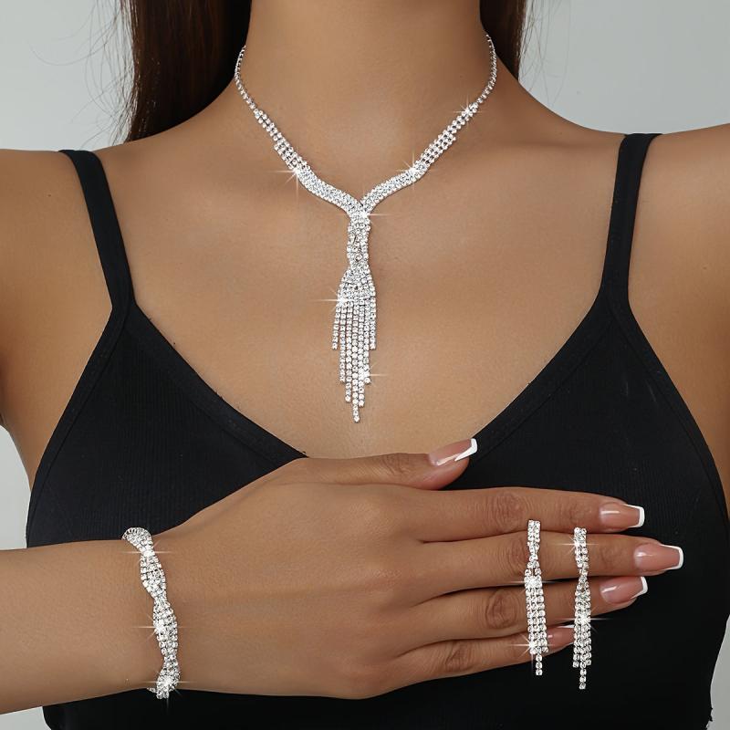 Bride Wedding Set Rhinestone Tassel Necklace Bracelet Earrings
