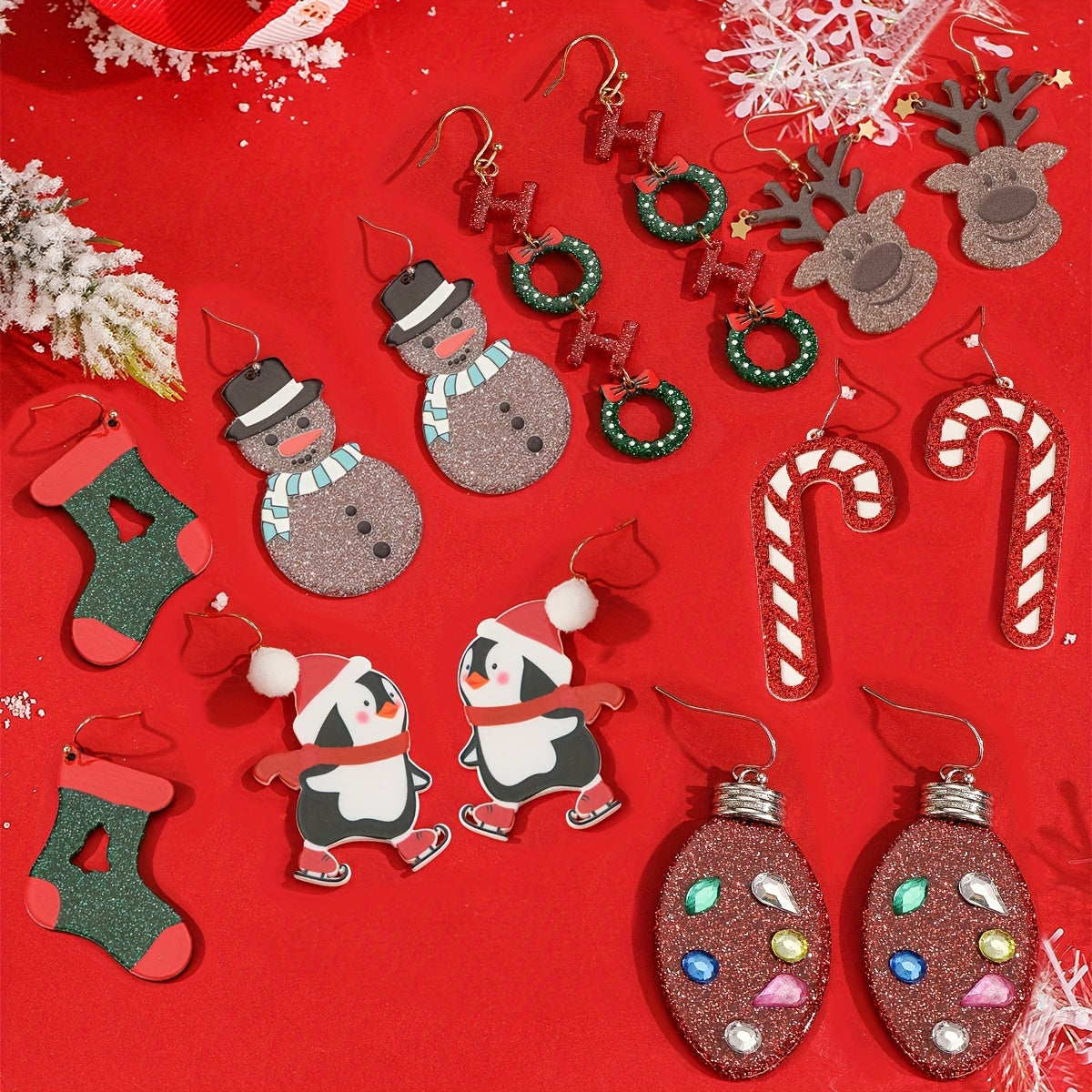 These festive Christmas decoration earrings feature snowman, reindeer, stockings, penguins, candy canes, and letters. Perfect for adding holiday cheer to any outfit!