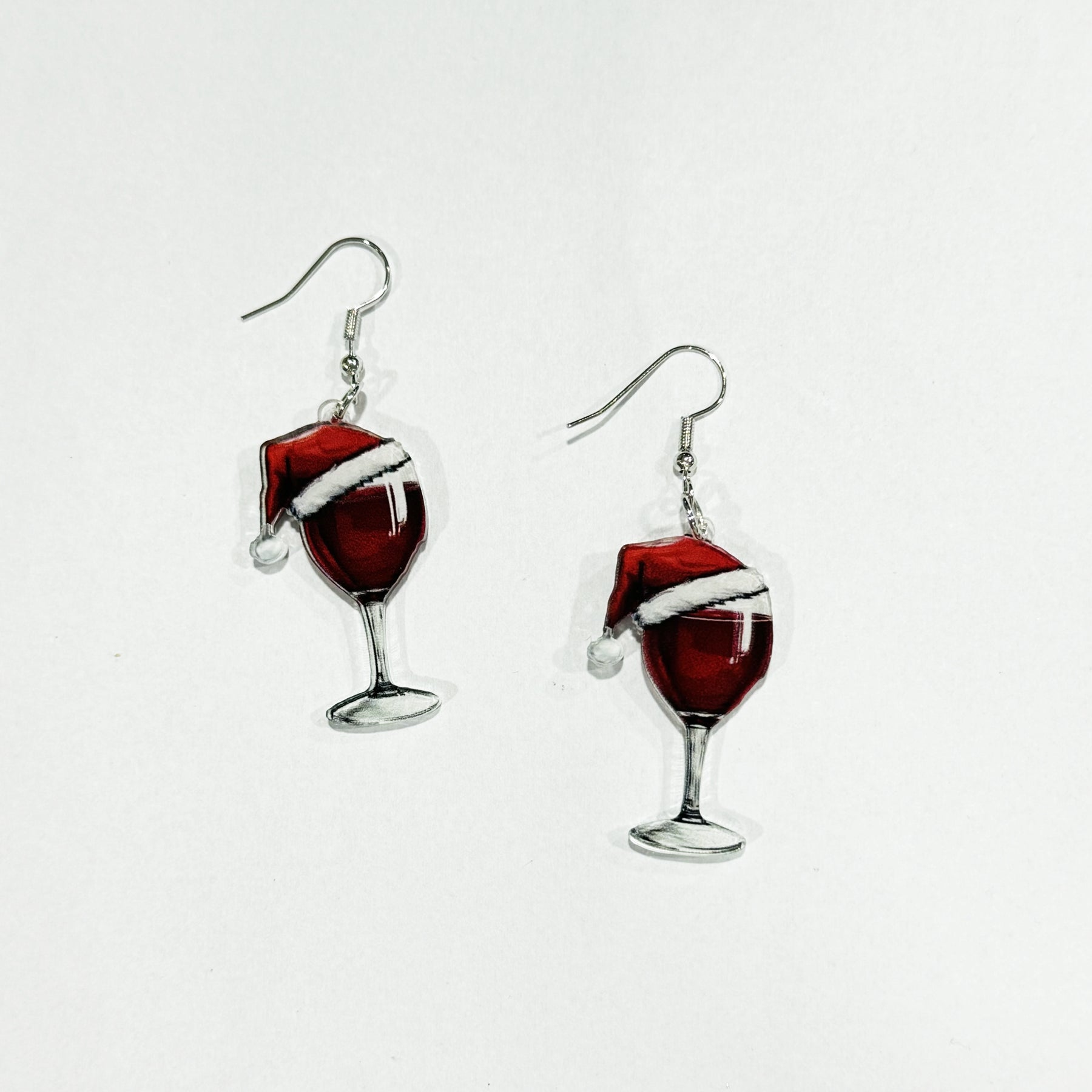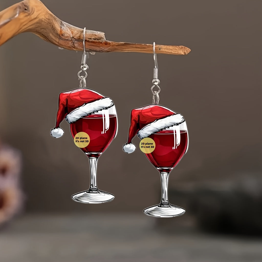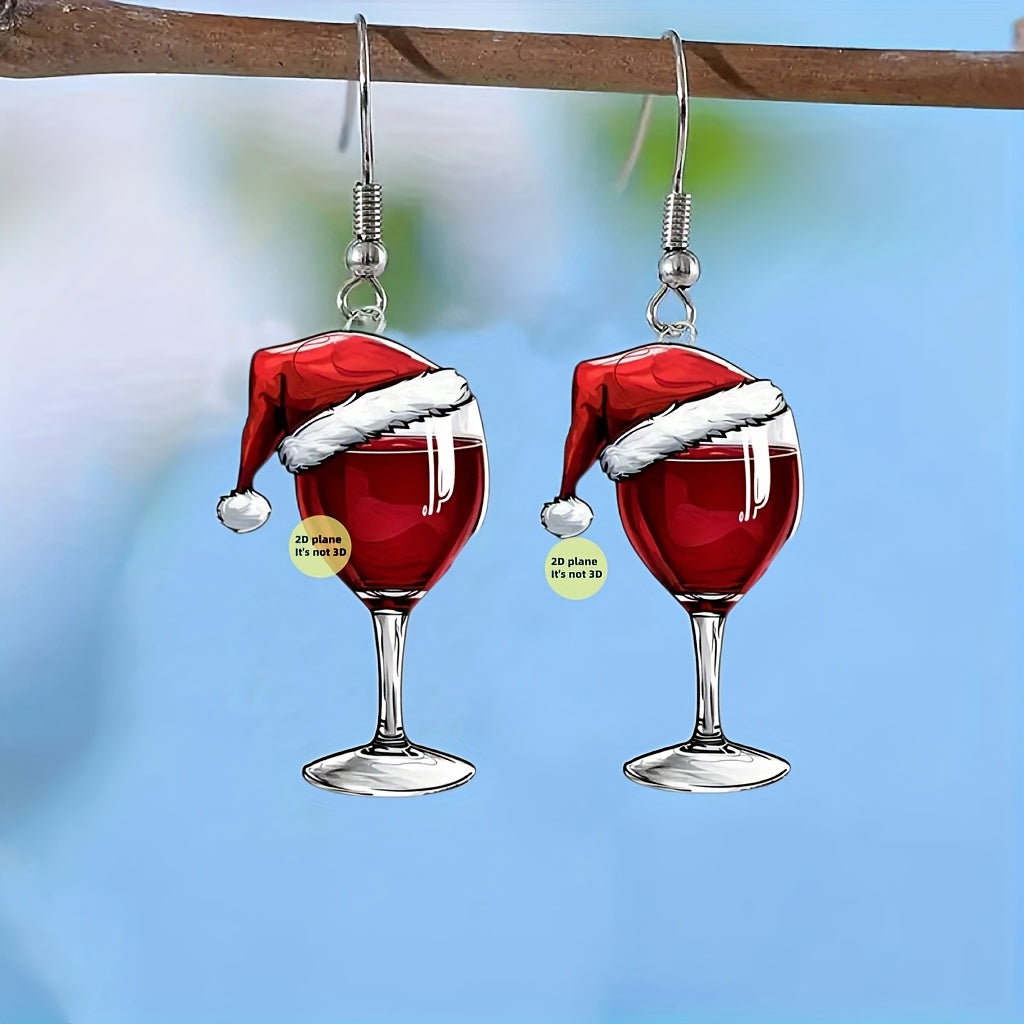 Get into the holiday spirit with these cute Christmas wine glass drop earrings featuring a festive Santa hat design. Perfect party accessory for both men and women.