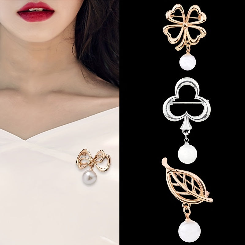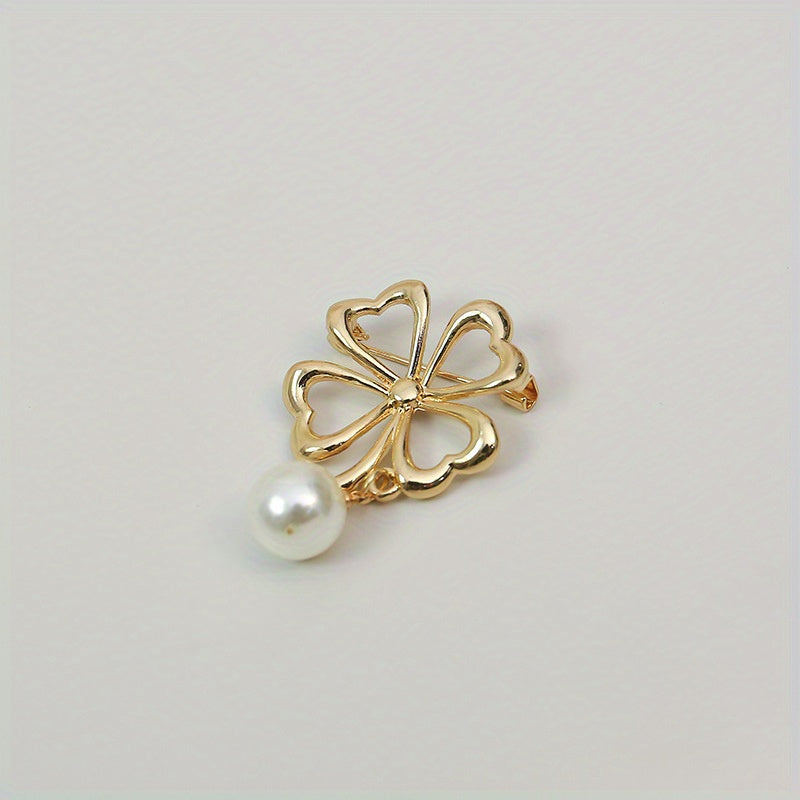 Add a touch of elegance to your outfit with this beautiful clover brooch pin featuring faux pearls. Perfect for shirts, suits, cardigans, shawls, and scarves.