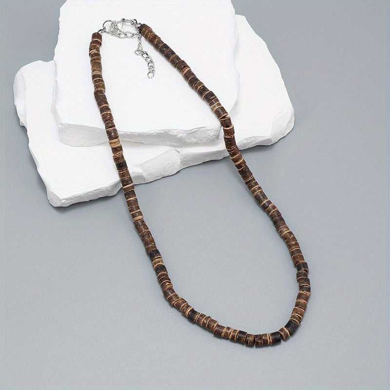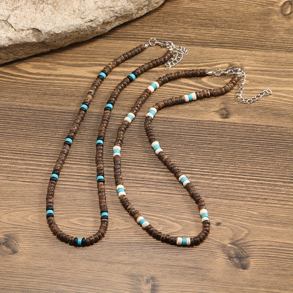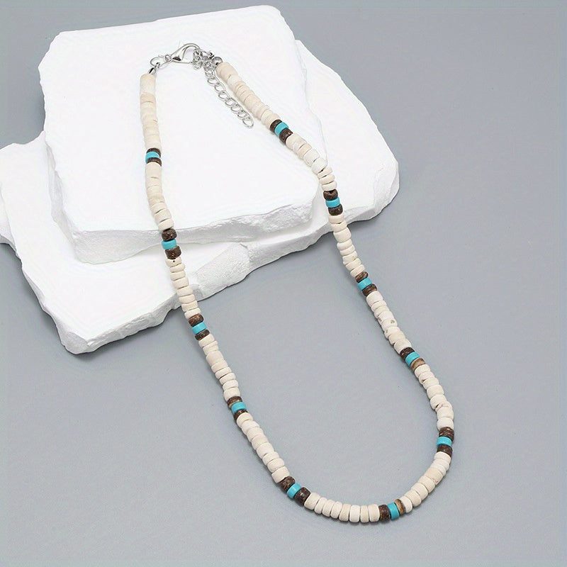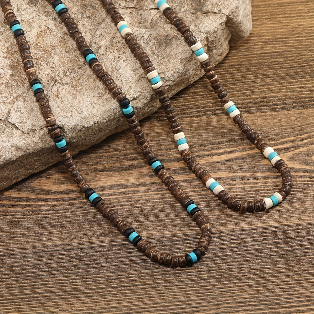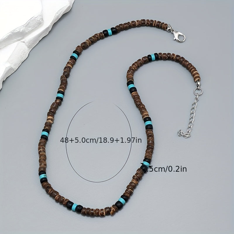 This unique necklace features coconut shell and turquoise beads for a bohemian look.