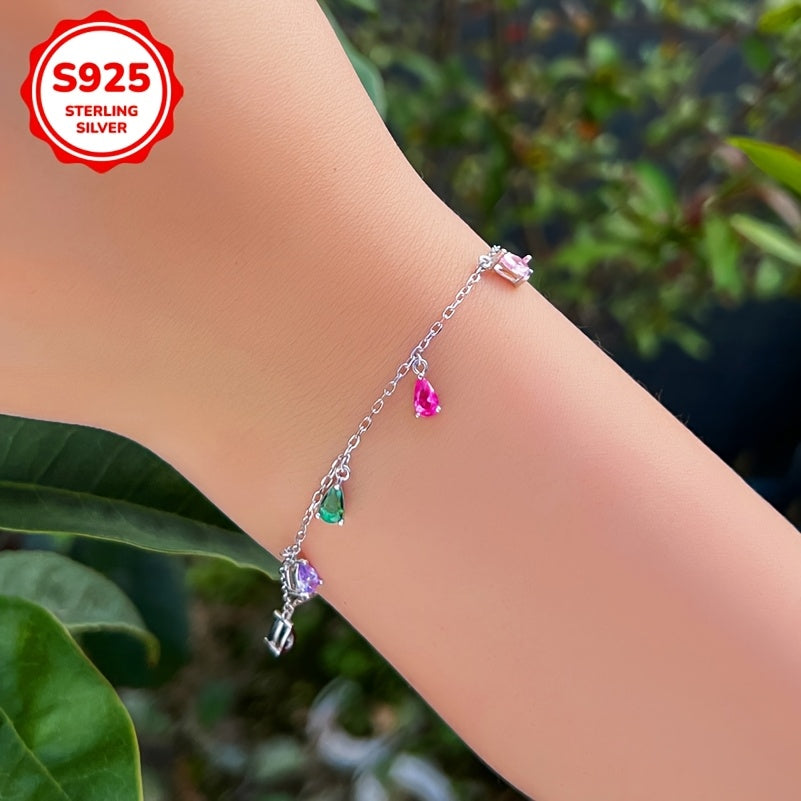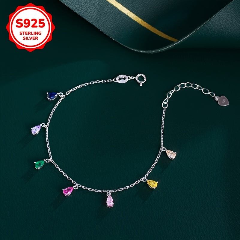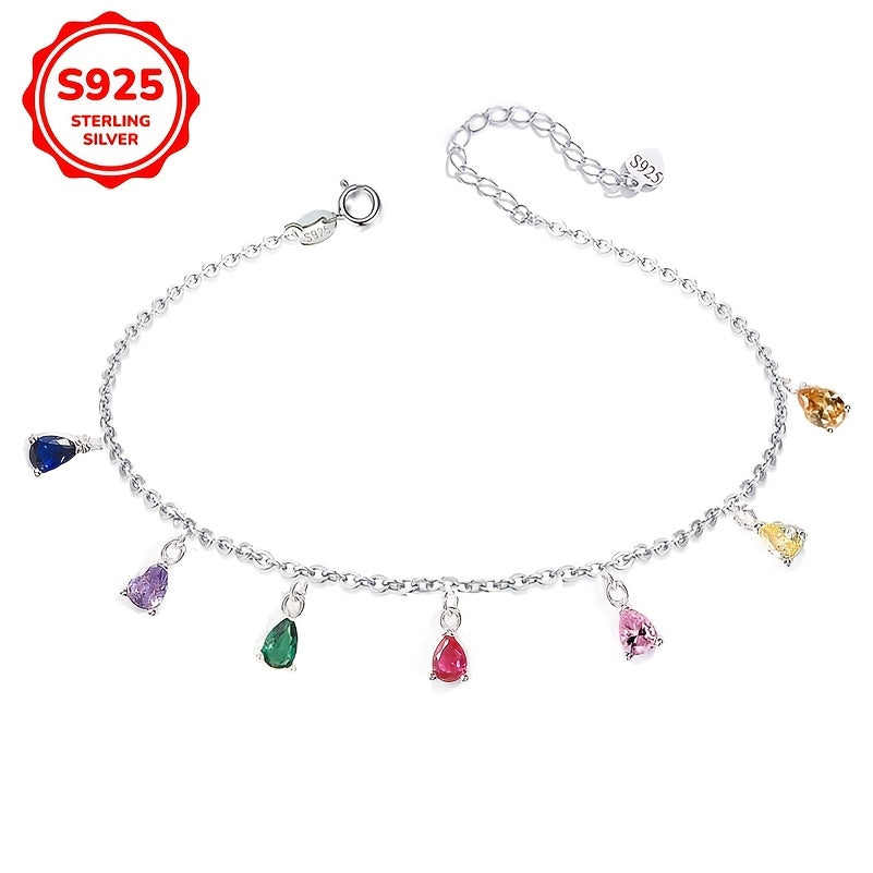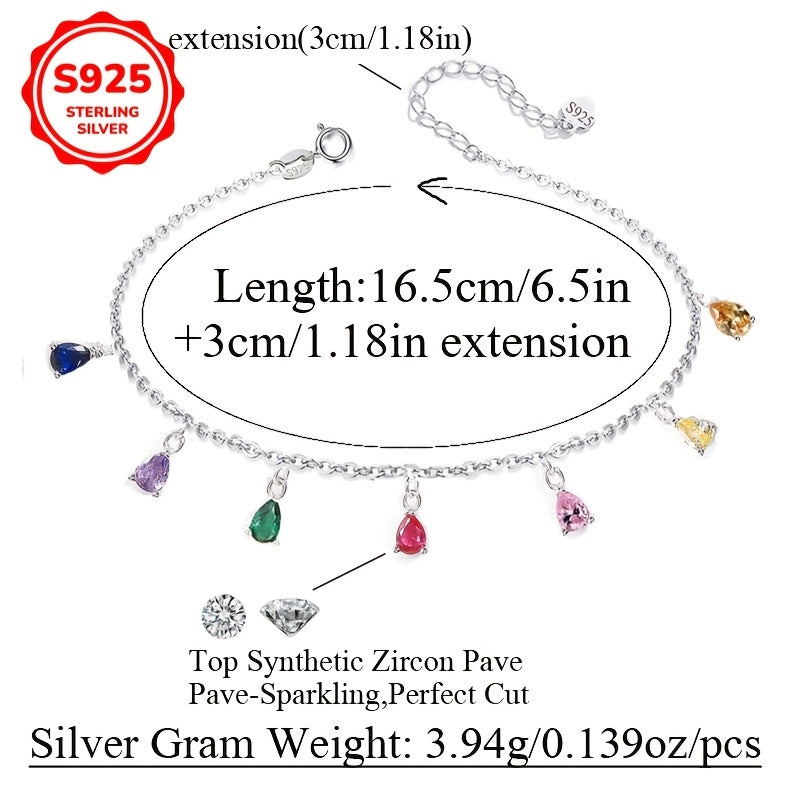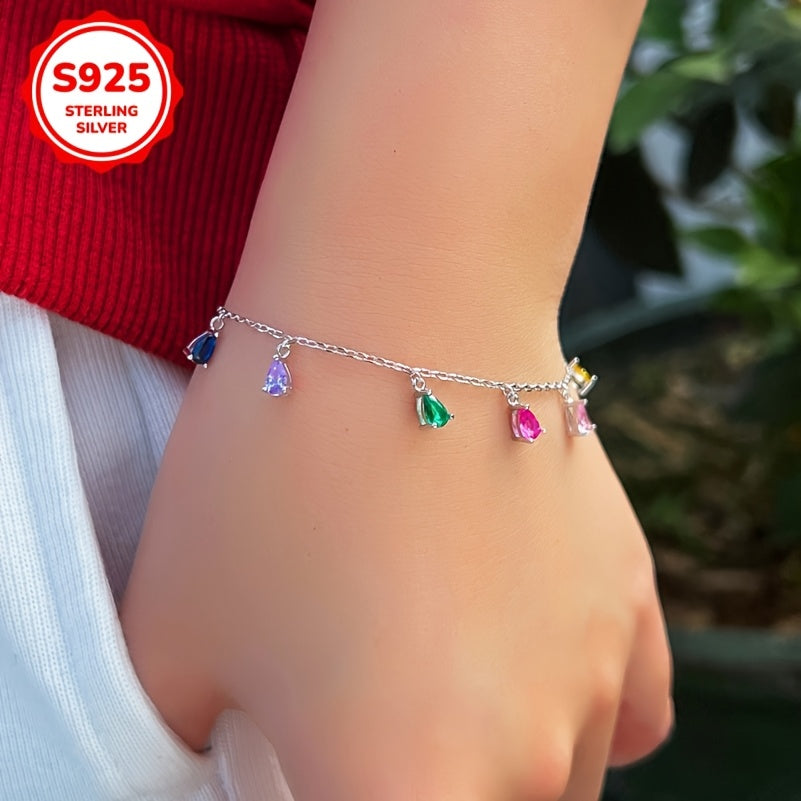 This stylish 925 sterling silver bracelet is adorned with classic colored teardrop-shaped synthetic zirconia inlays, adding a pop of color and elegance to your outfit.