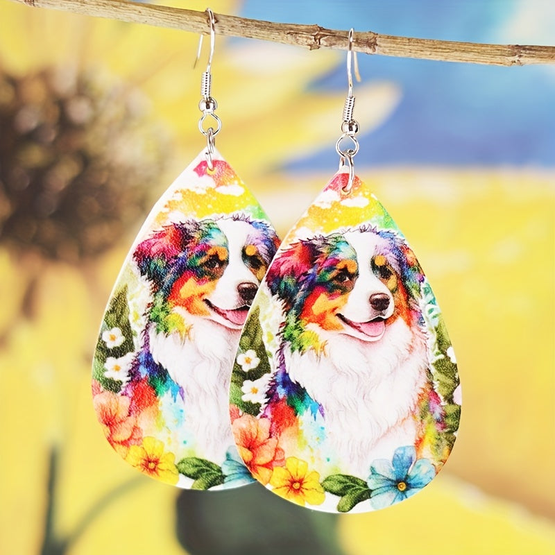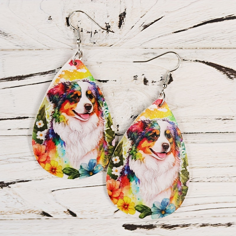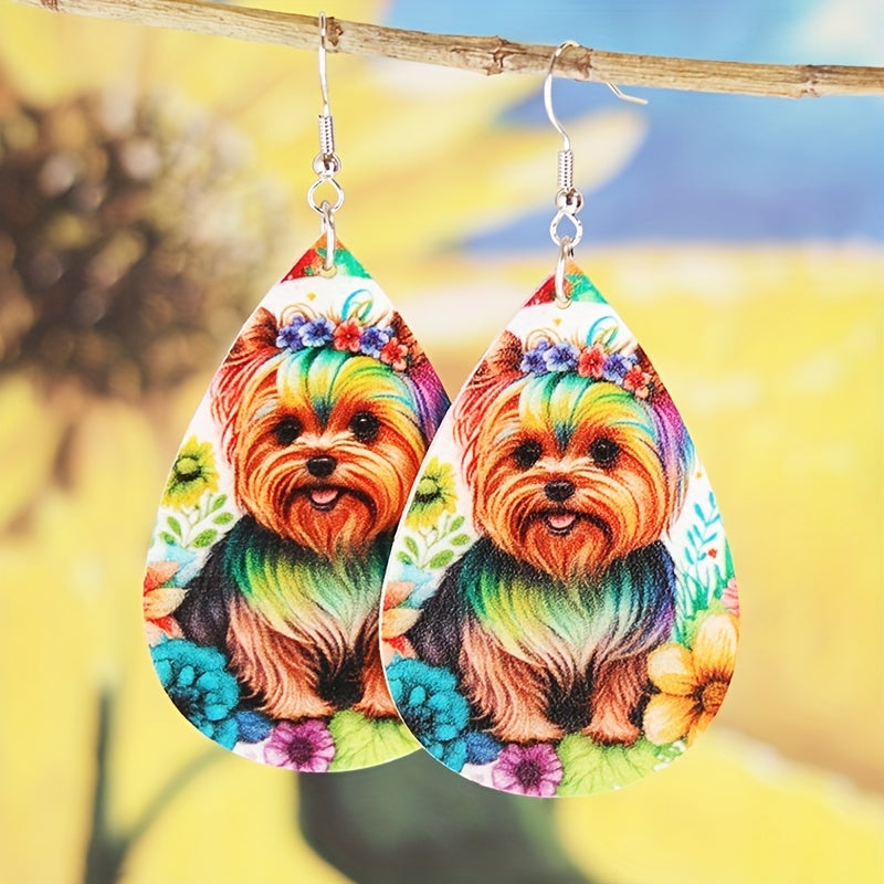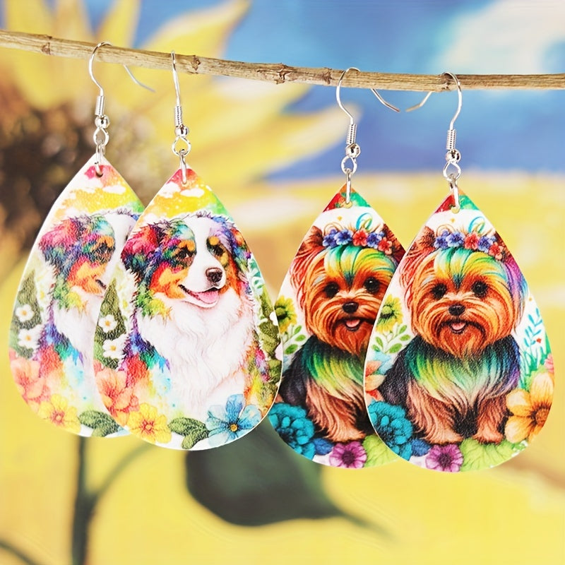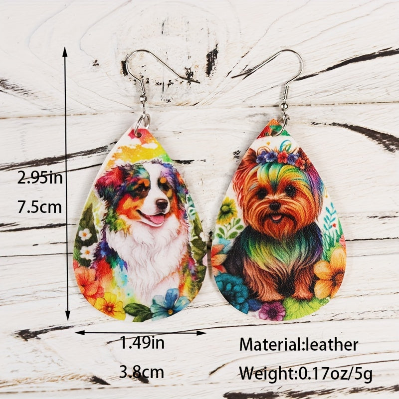 These adorable teardrop dangle earrings feature a vibrant colorful flower print, perfect for dog lovers. Made of high-quality PU leather, these earrings are delicate and stylish, making them a great gift for any female.
