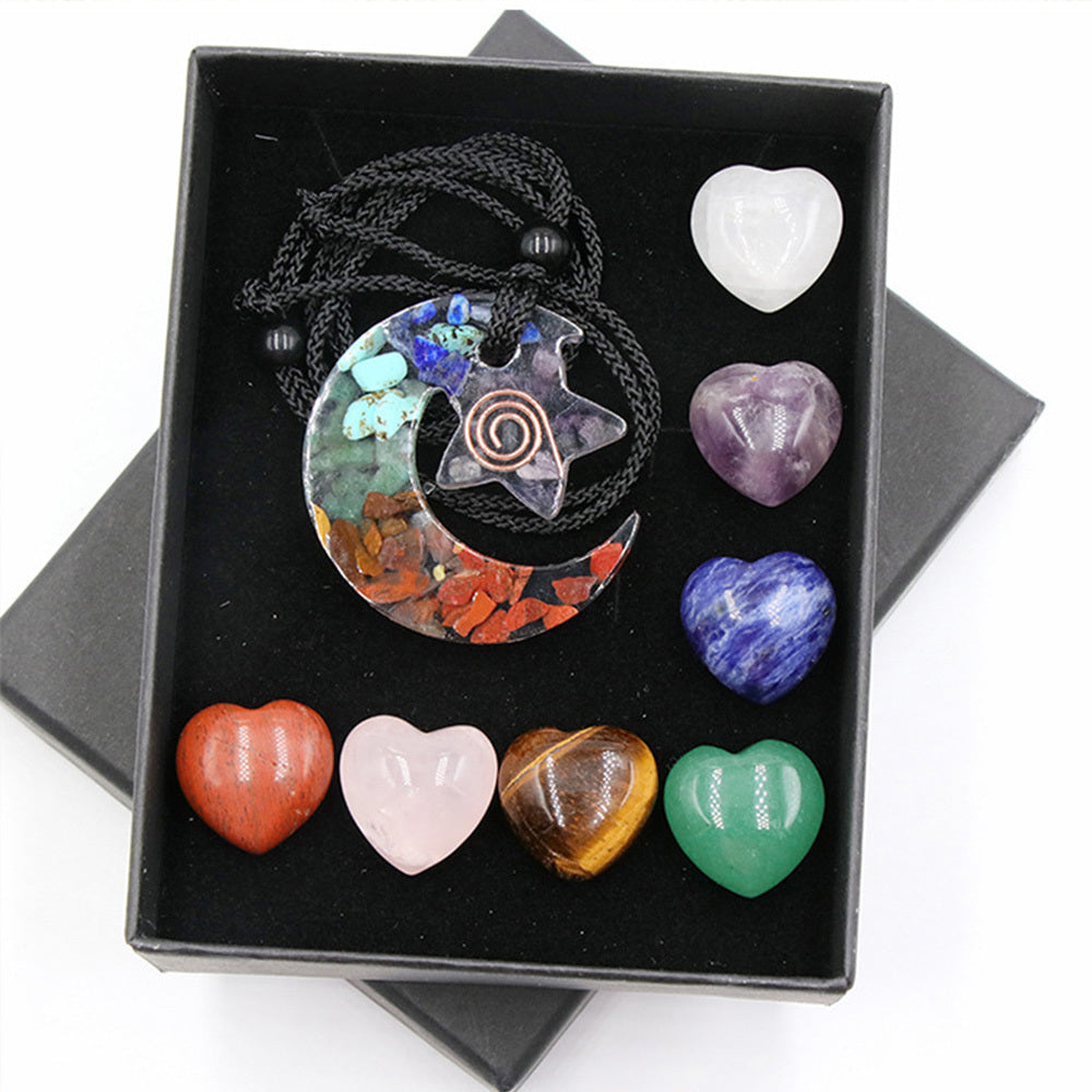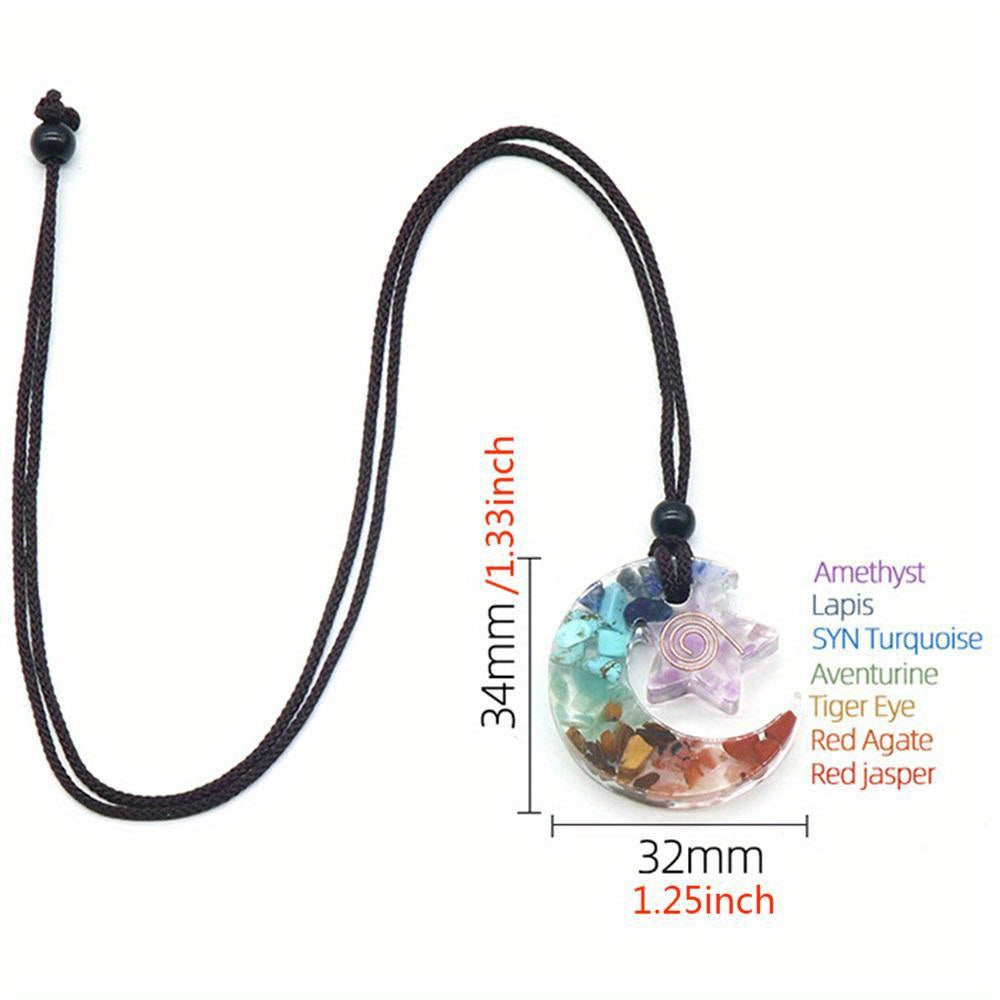 This pendant necklace set features colorful gravel design with star, moon, and 7 chakras natural crystal. Perfect for Reiki healing and enhancing your energy balance.