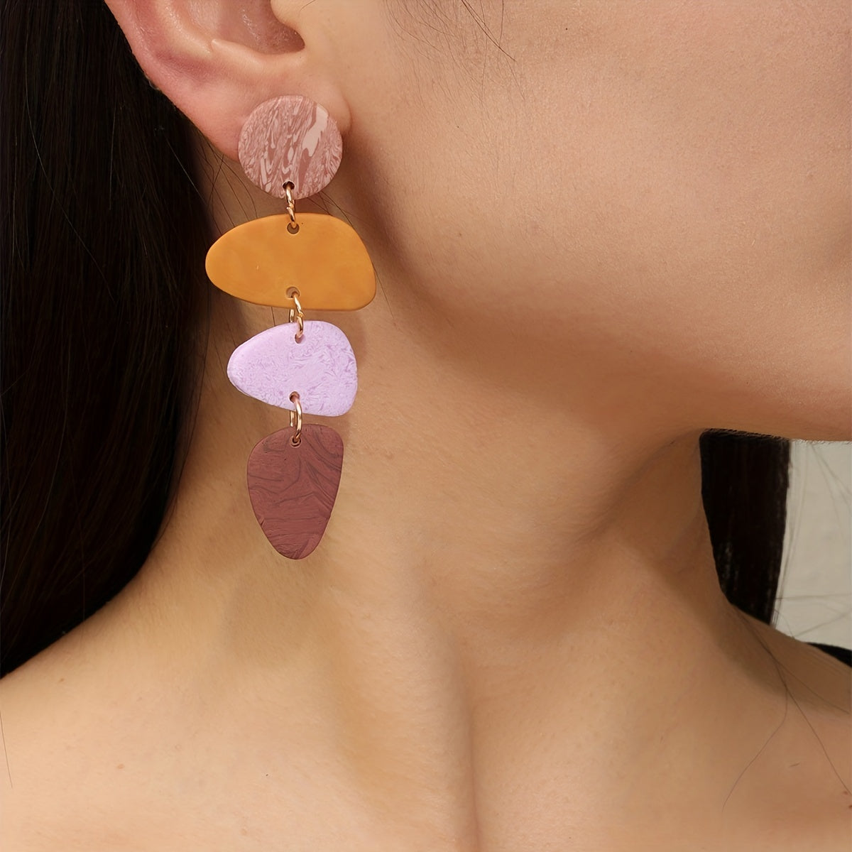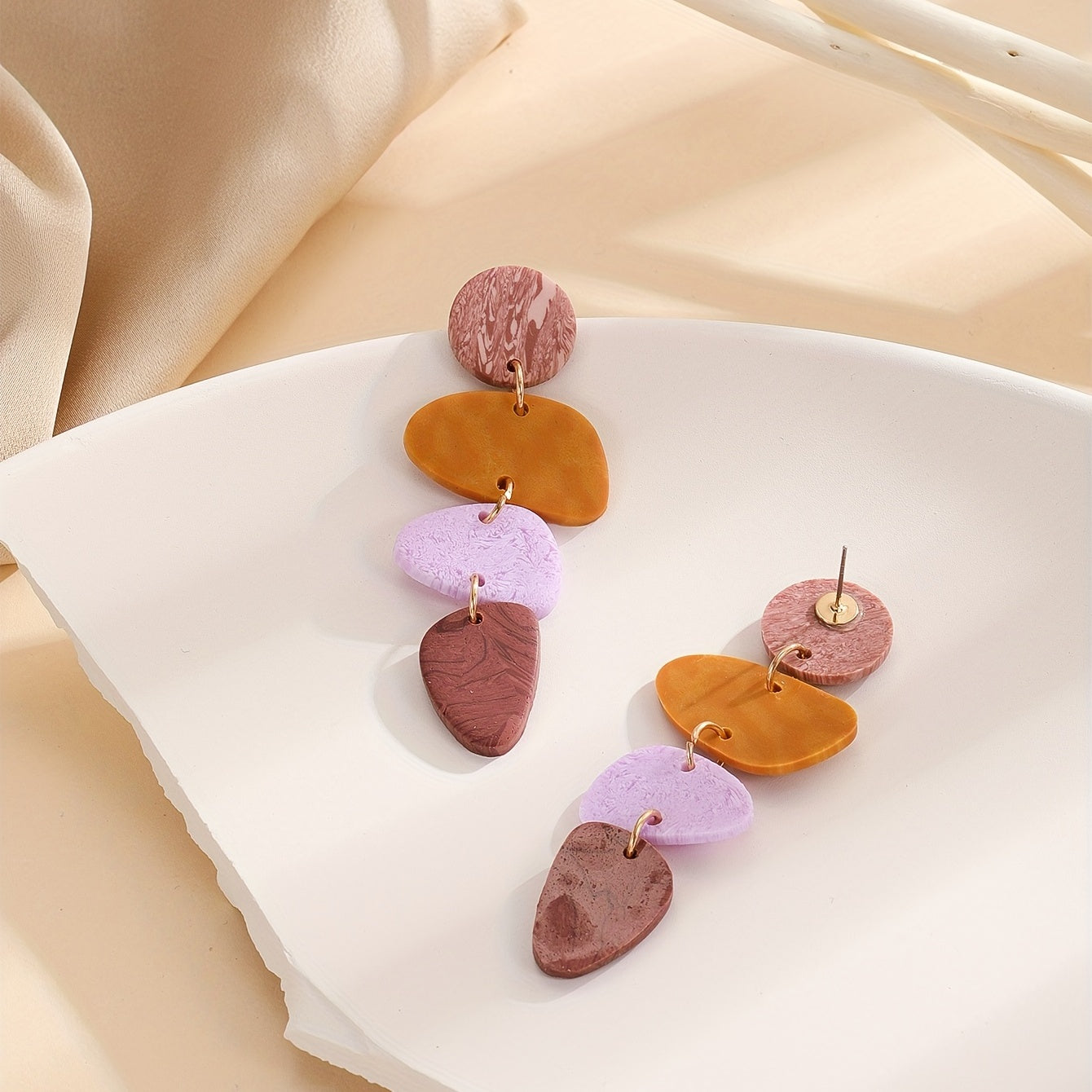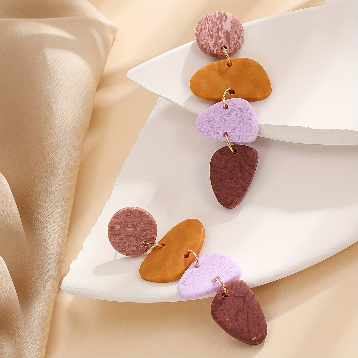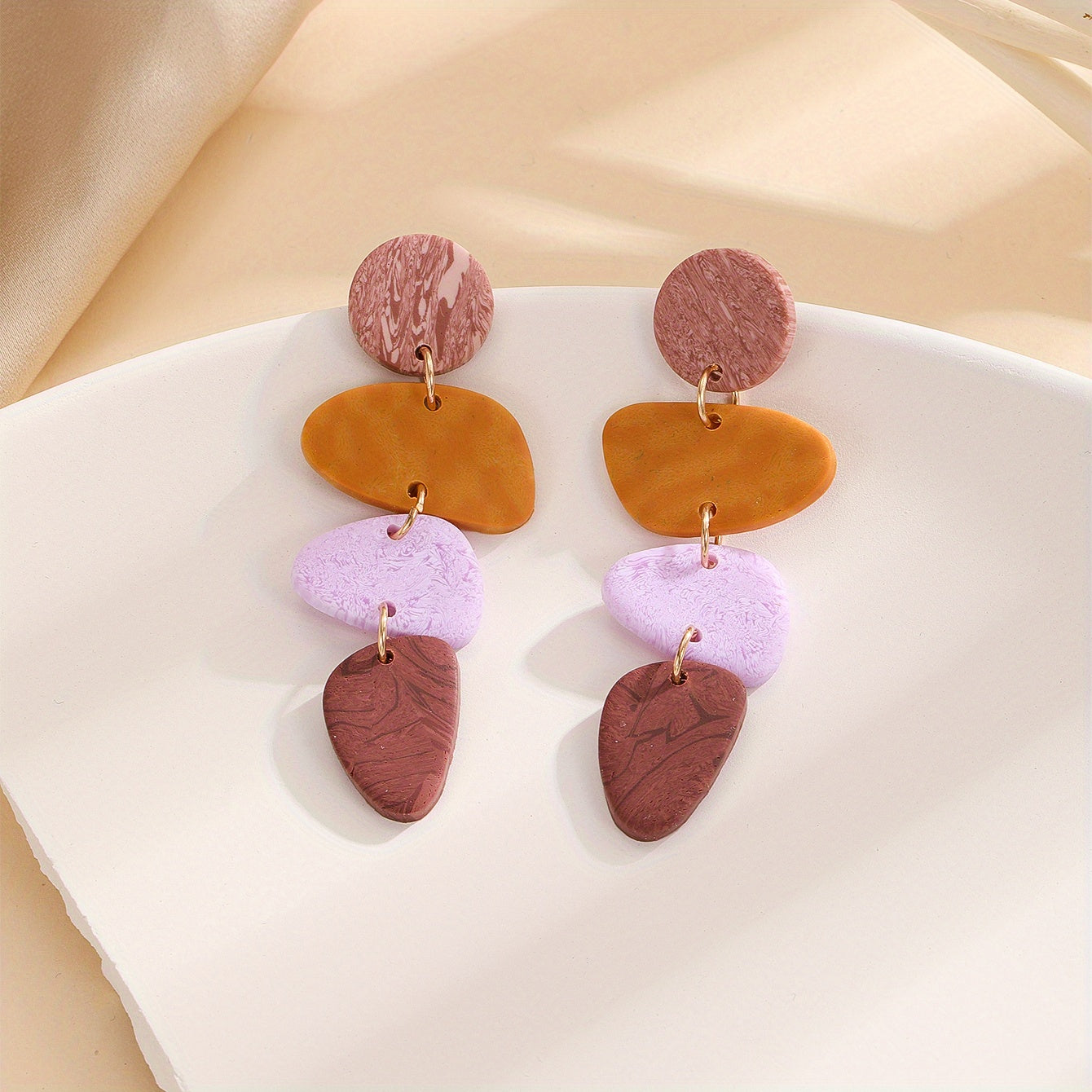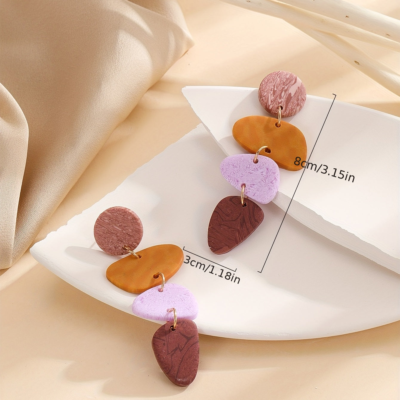 These irregular colorful soft pottery dangle earrings are perfect for daily casual wear or as a gift for a special female in your life. They add a classic touch to any outfit and are sure to make a statement.