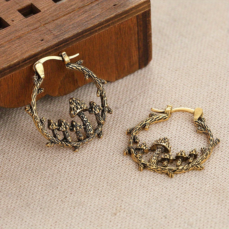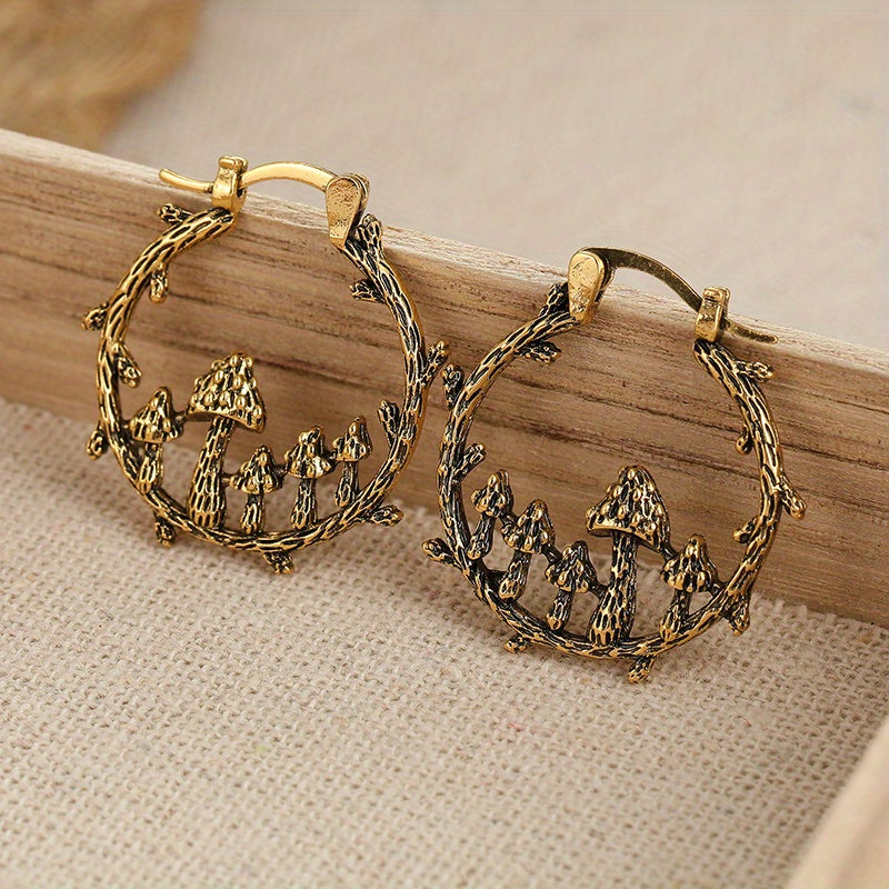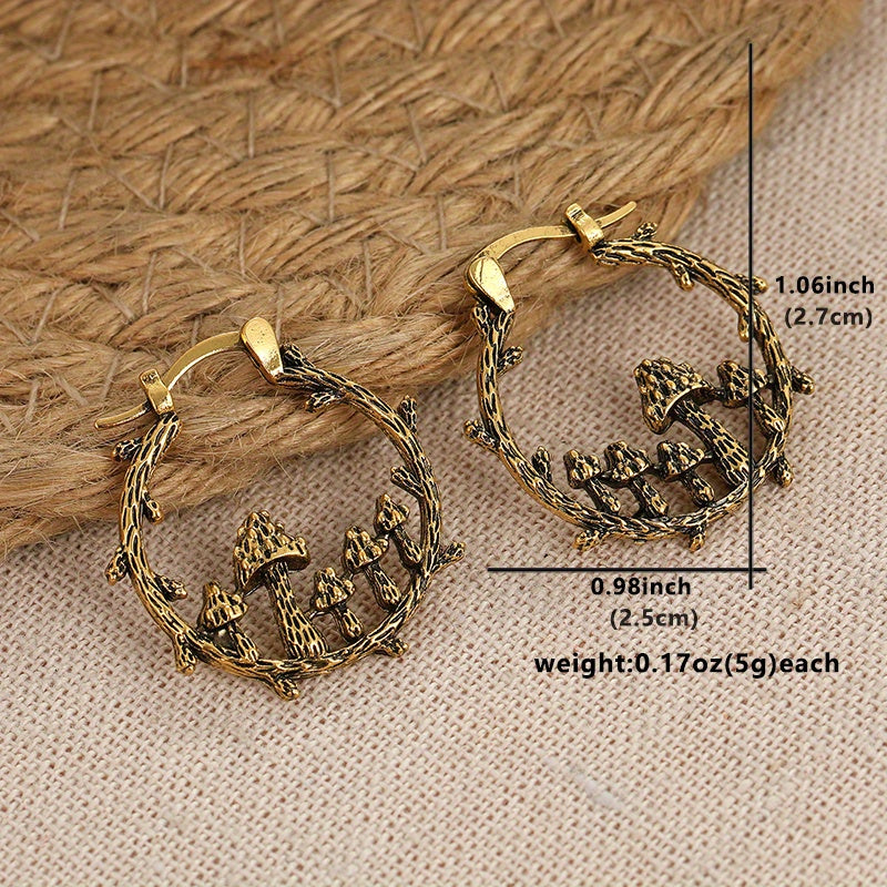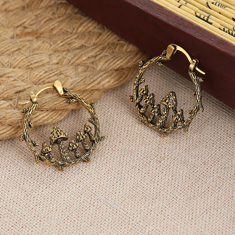 Copper & Mushroom Round Pendant Hoop Earrings Boho Style