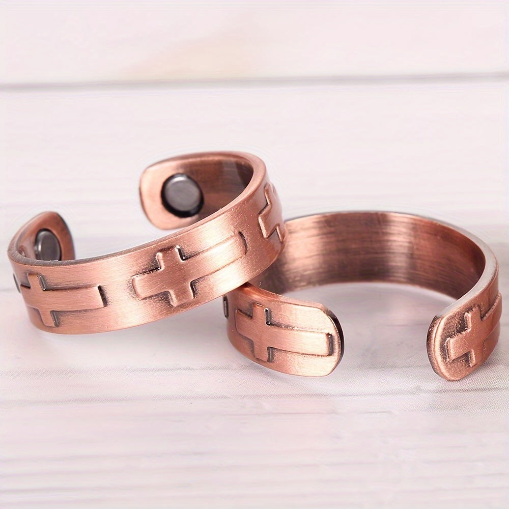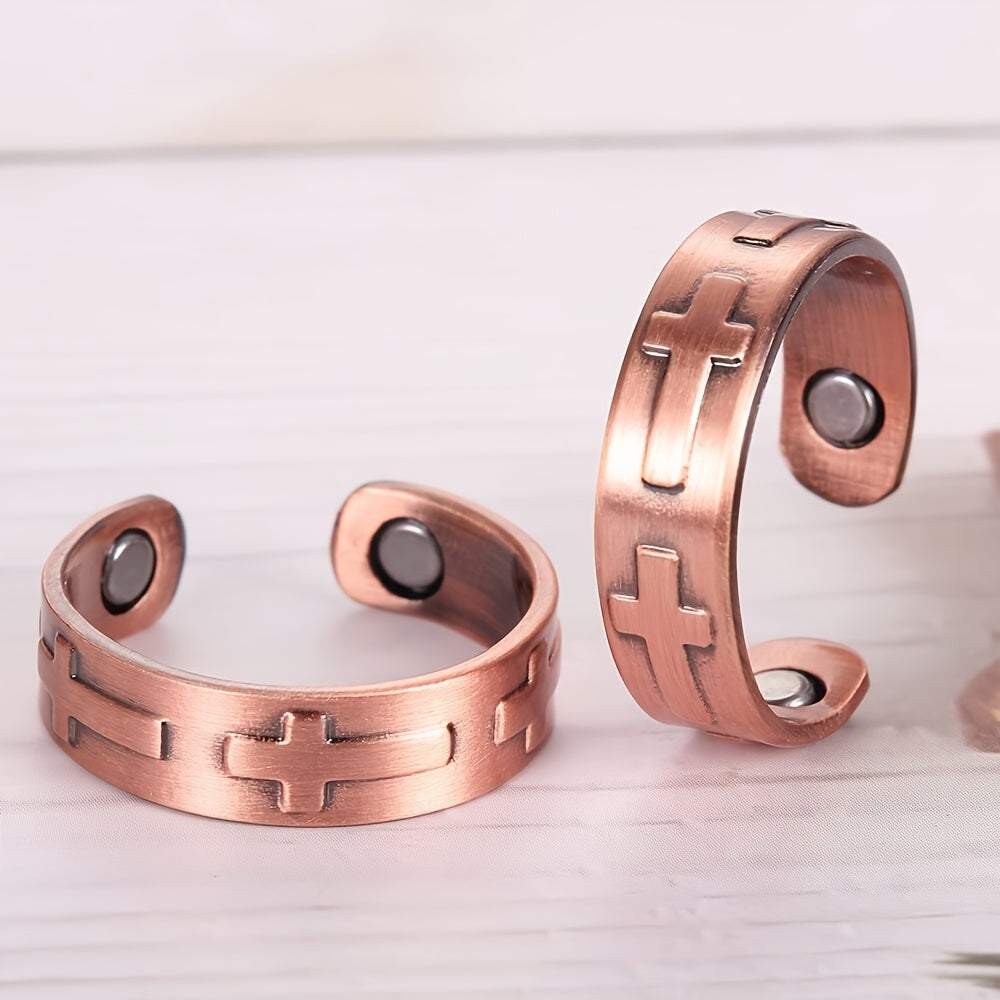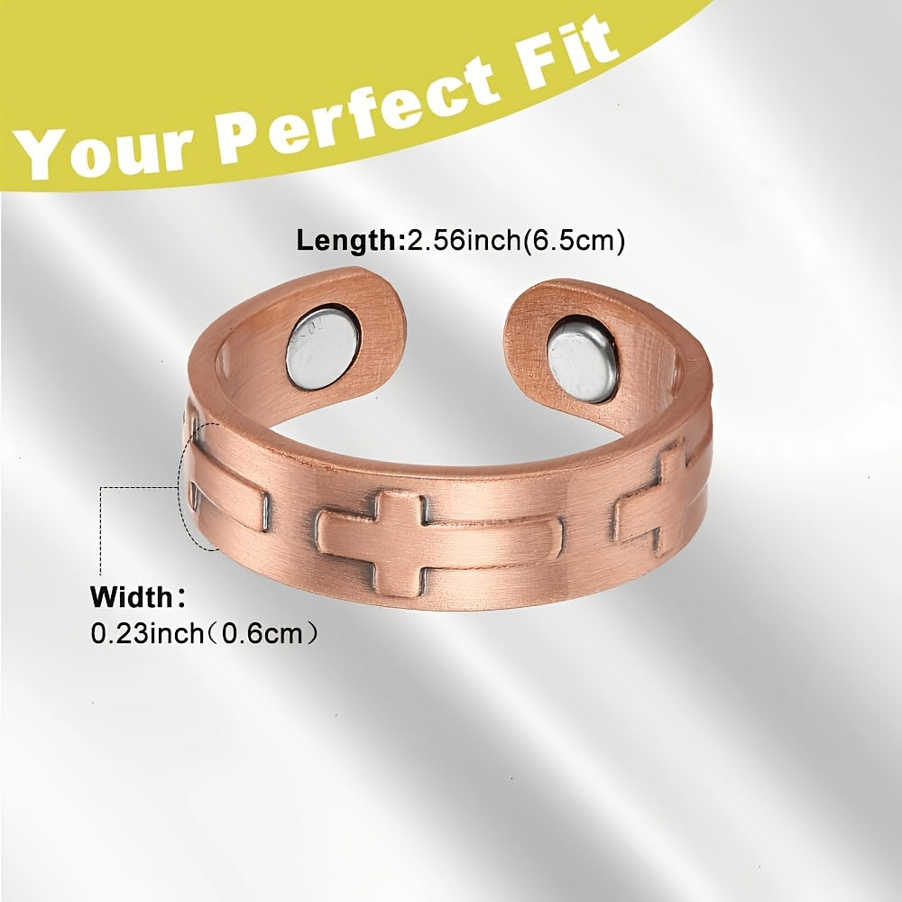 This copper ring features a cross pattern design with ultra strength magnetic 3500 Gauss magnets. It is adjustable and suitable for both men and women.