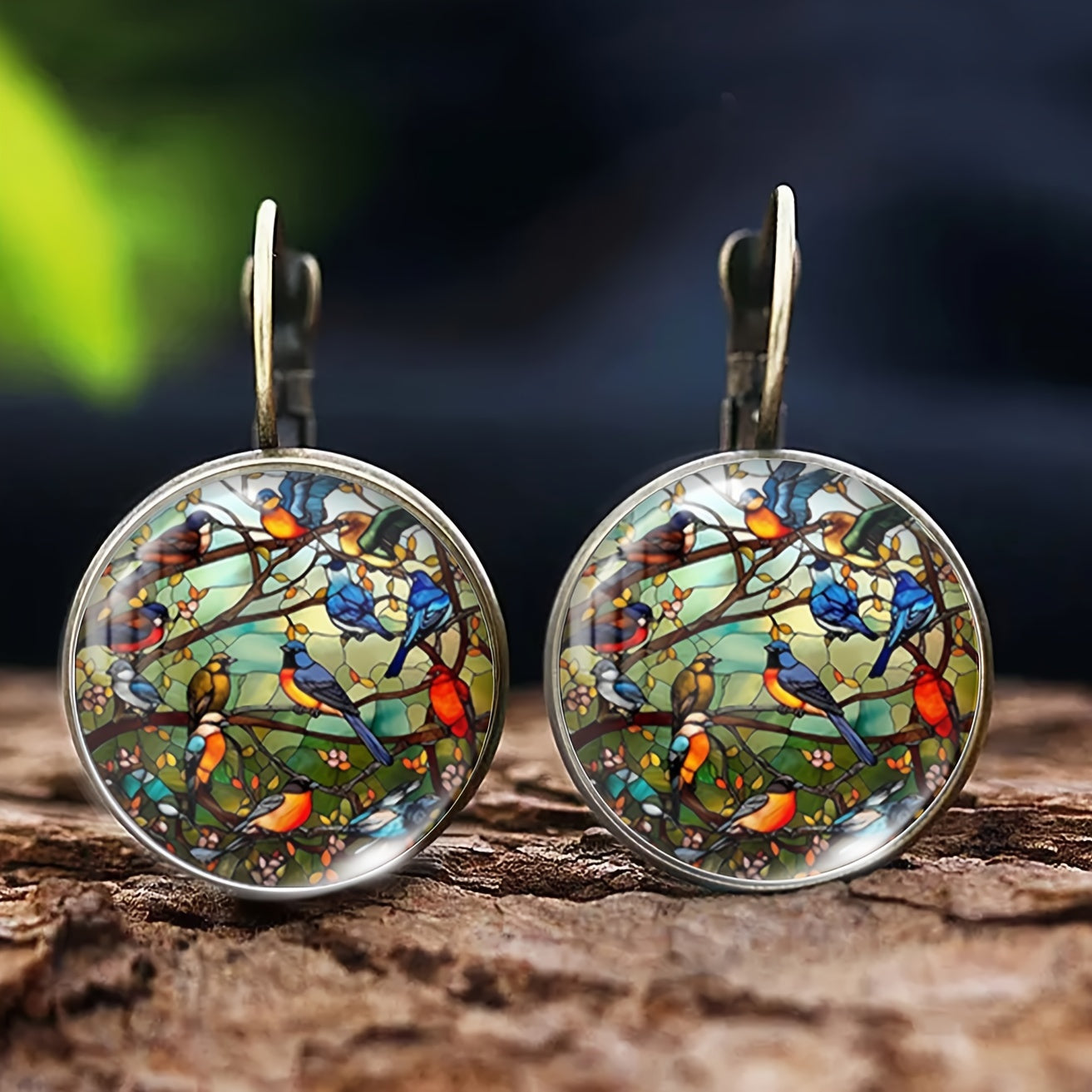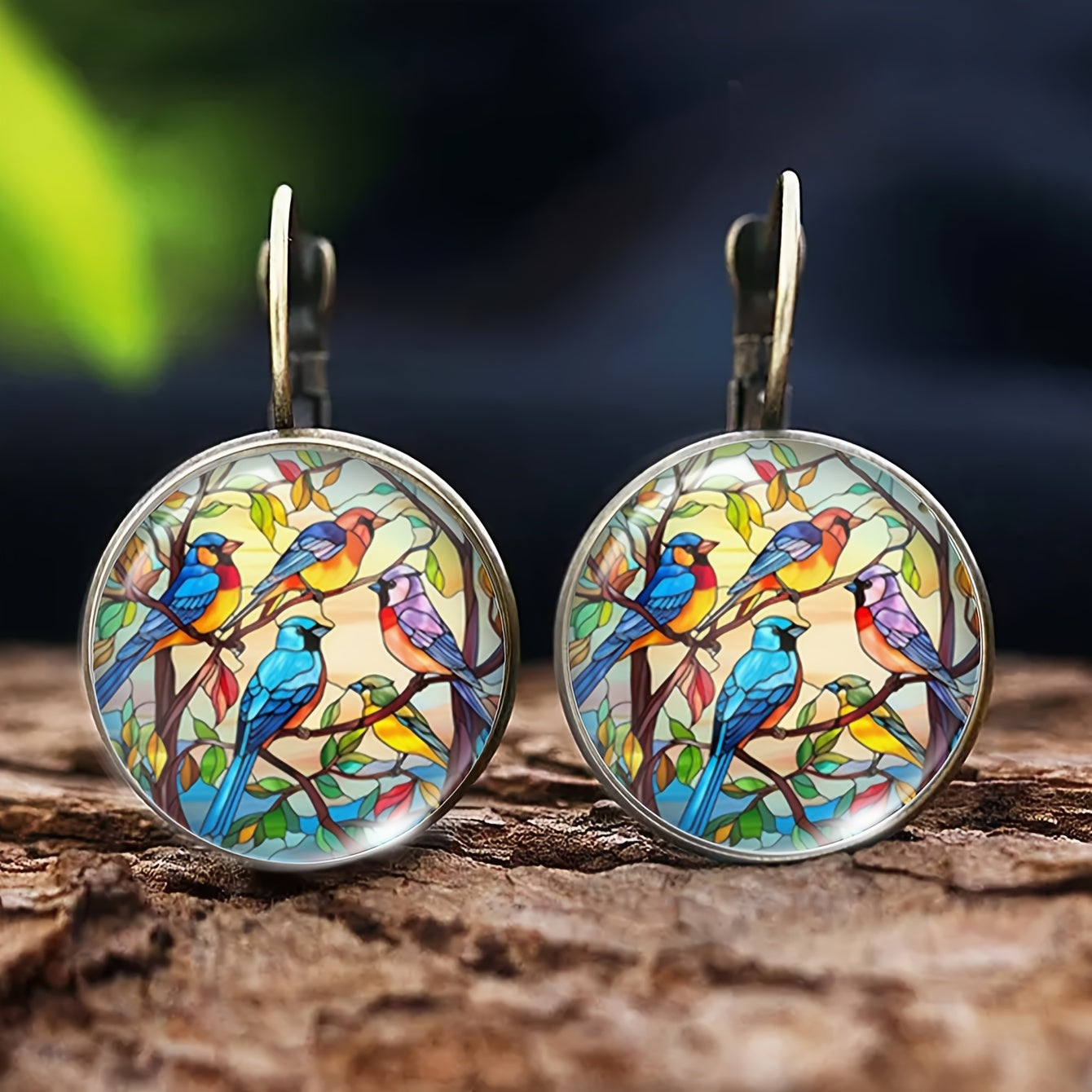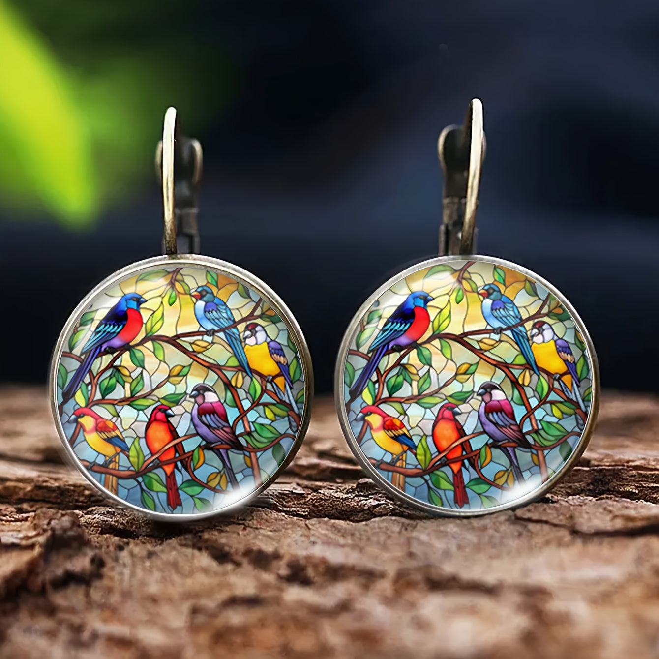 These vintage inspired copper round earrings feature a colorful bird and floral branch design, making them suitable for all seasons. Add a quirky touch to your daily wear with these unique earrings.