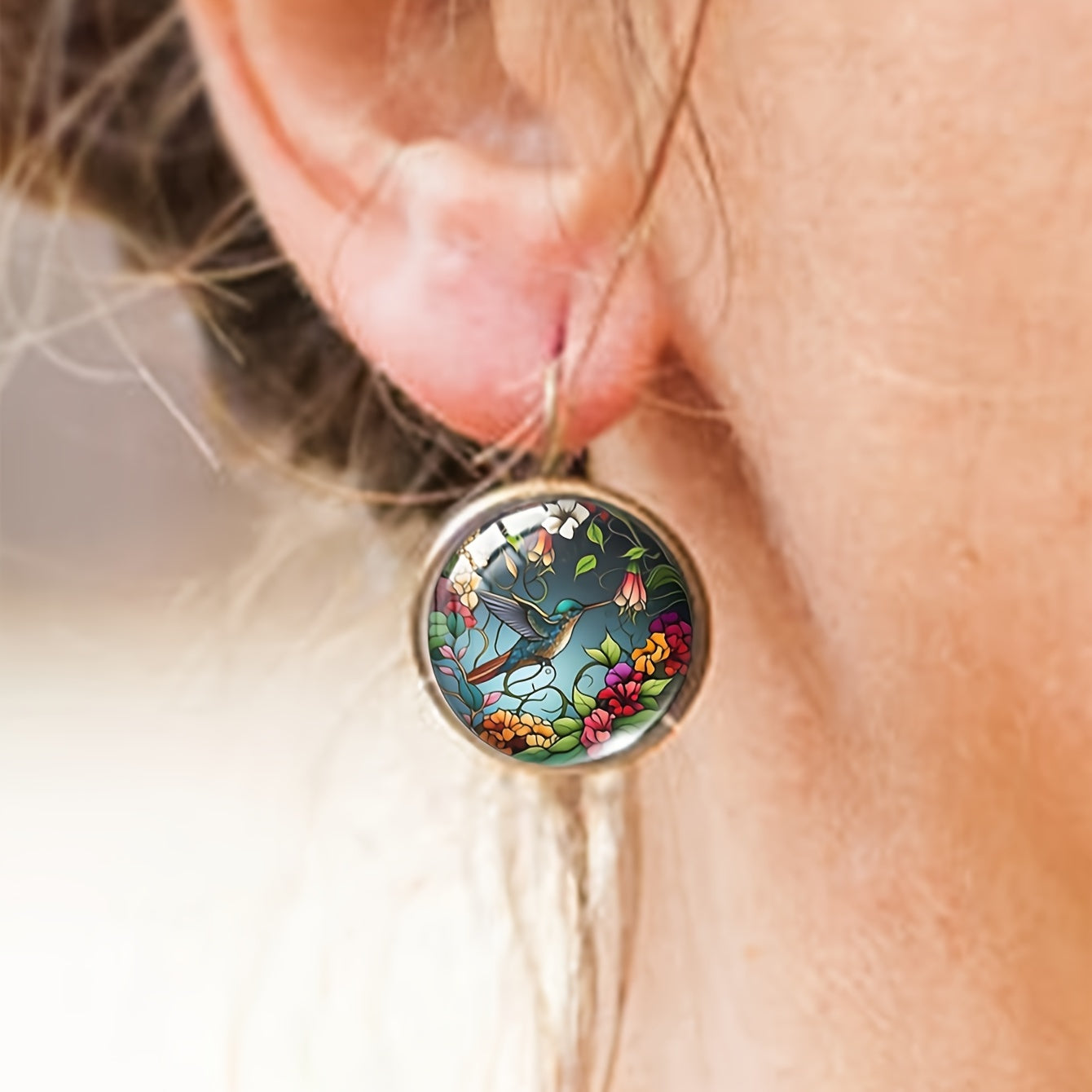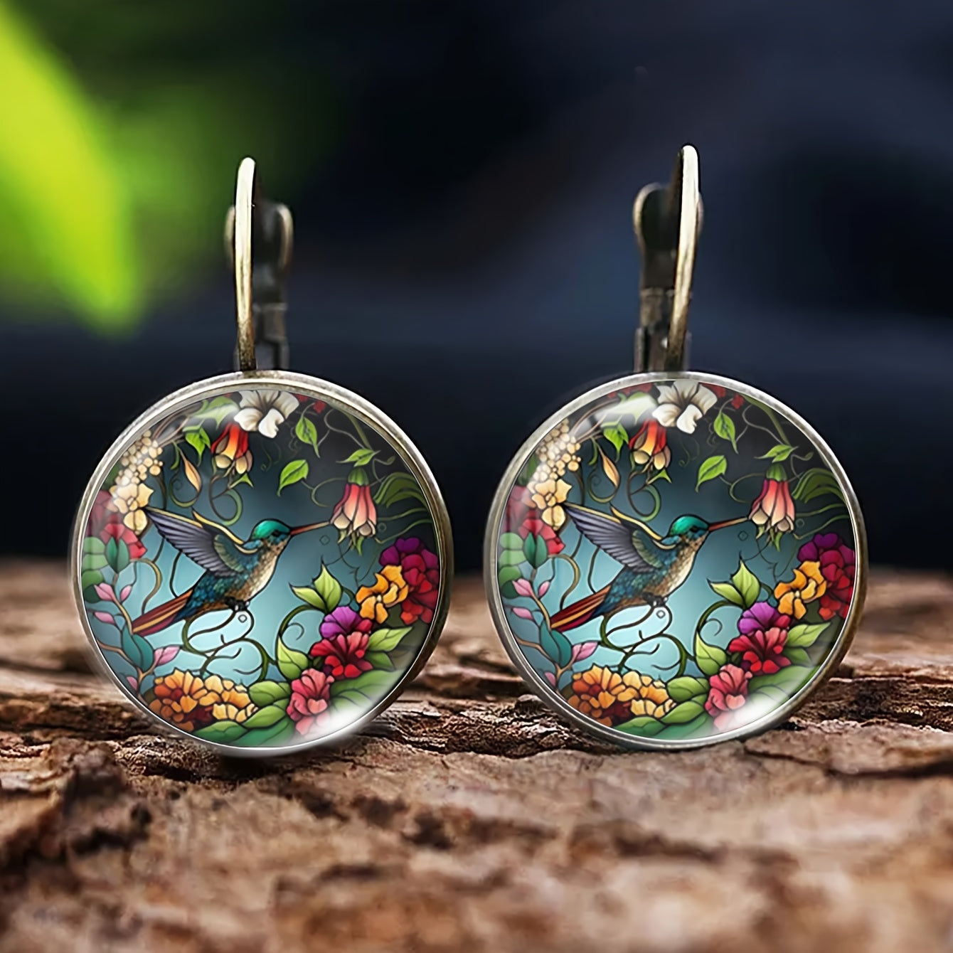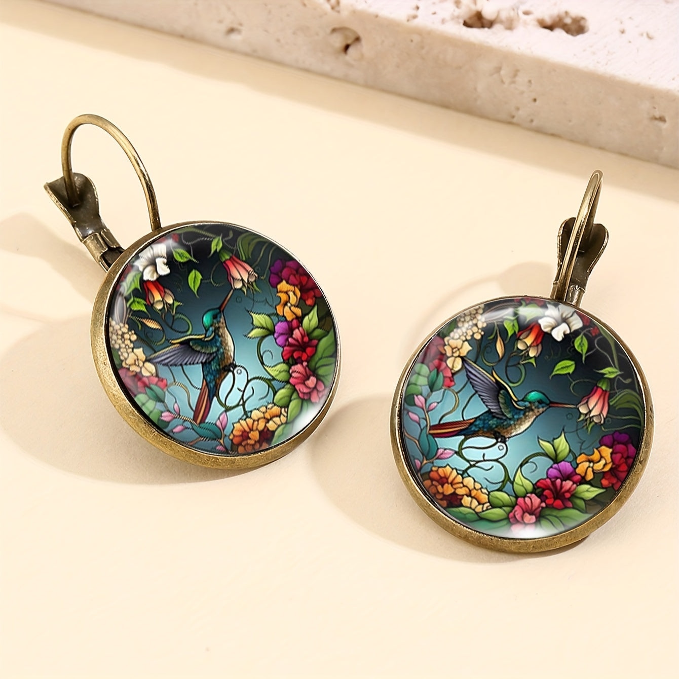 These vintage inspired copper round earrings feature a colorful bird and floral branch design, making them suitable for all seasons. Add a quirky touch to your daily wear with these unique earrings.