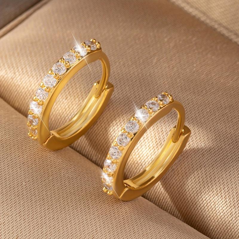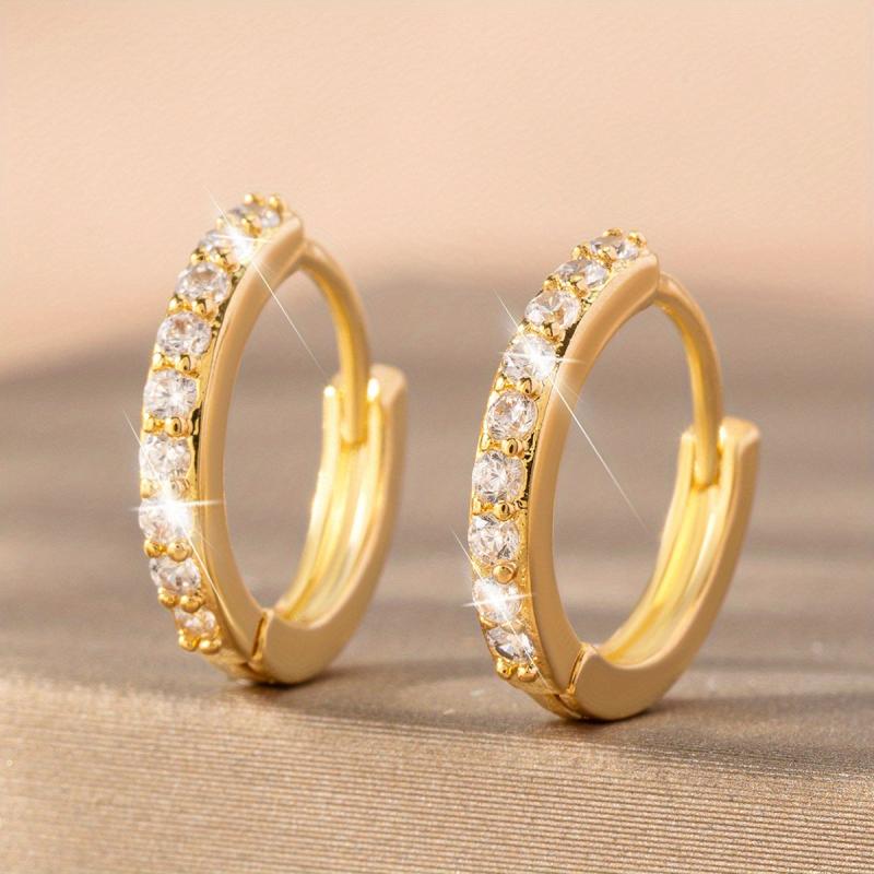 Elegant copper earrings with inlaid zirconia stones featuring a geometric circle design.