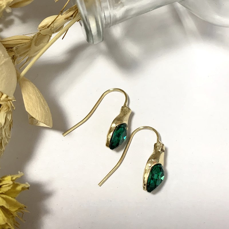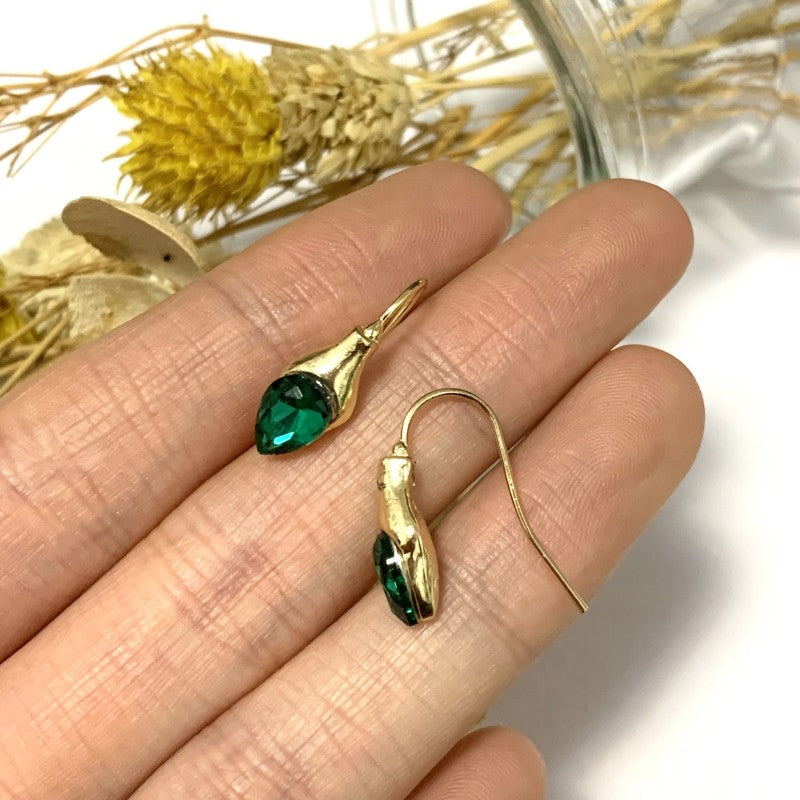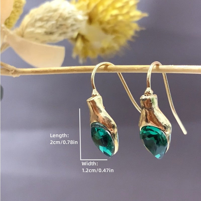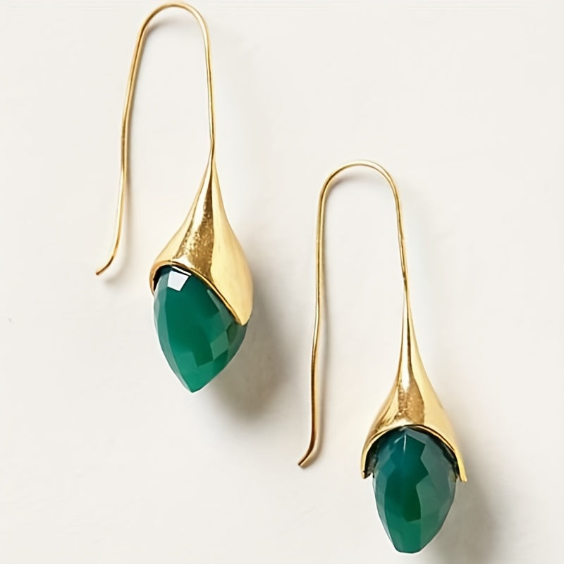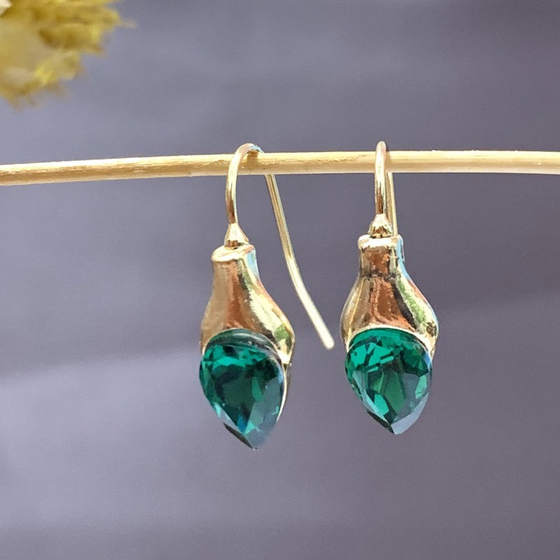 Elegant and stylish earrings featuring green gemstones and golden plating, perfect for couples or unisex wear.