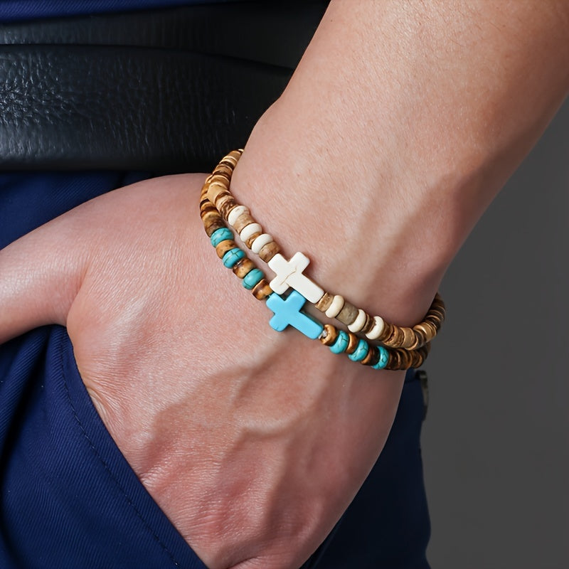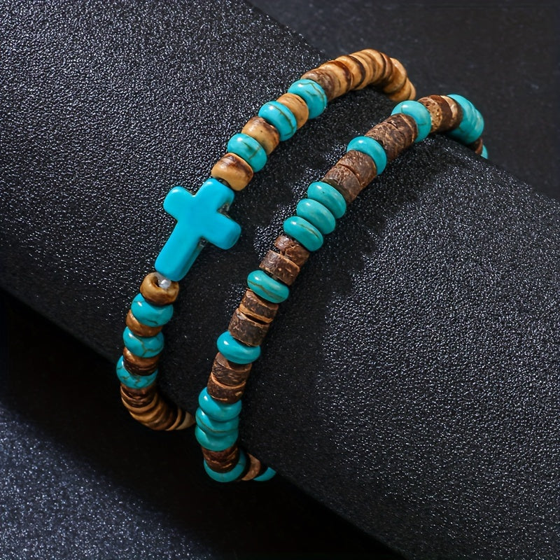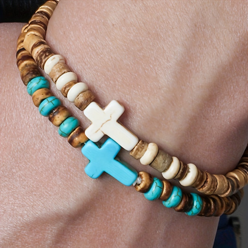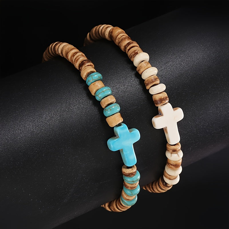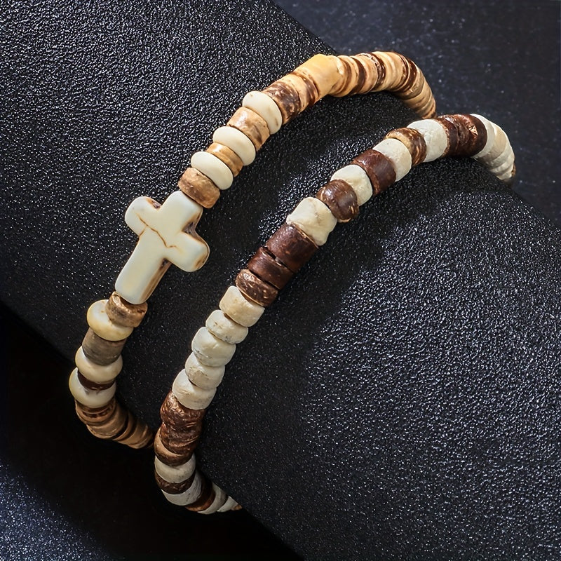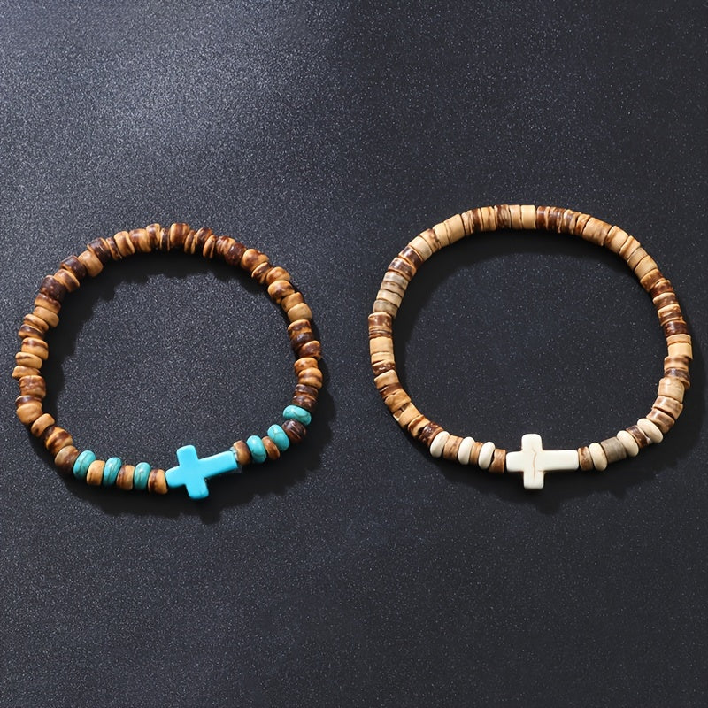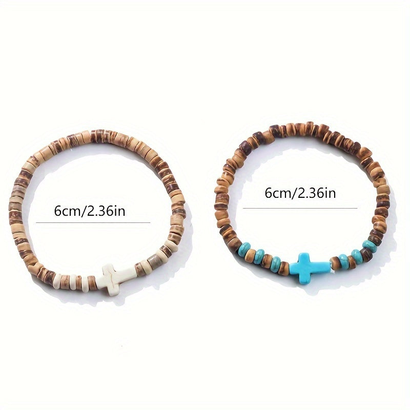 This bracelet set includes 2 pieces featuring cross element design with coconut shell and wooden beads. Perfect for adding a boho touch to your outfit.