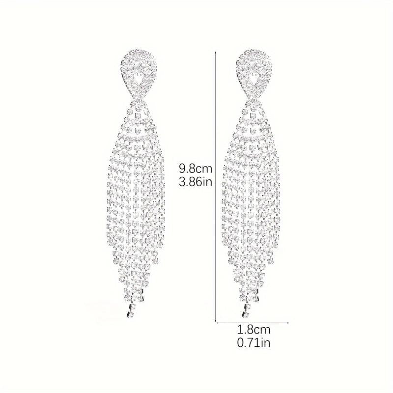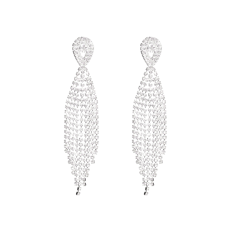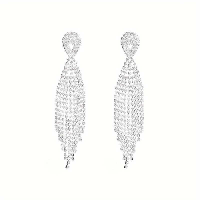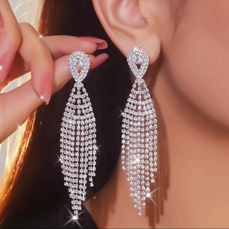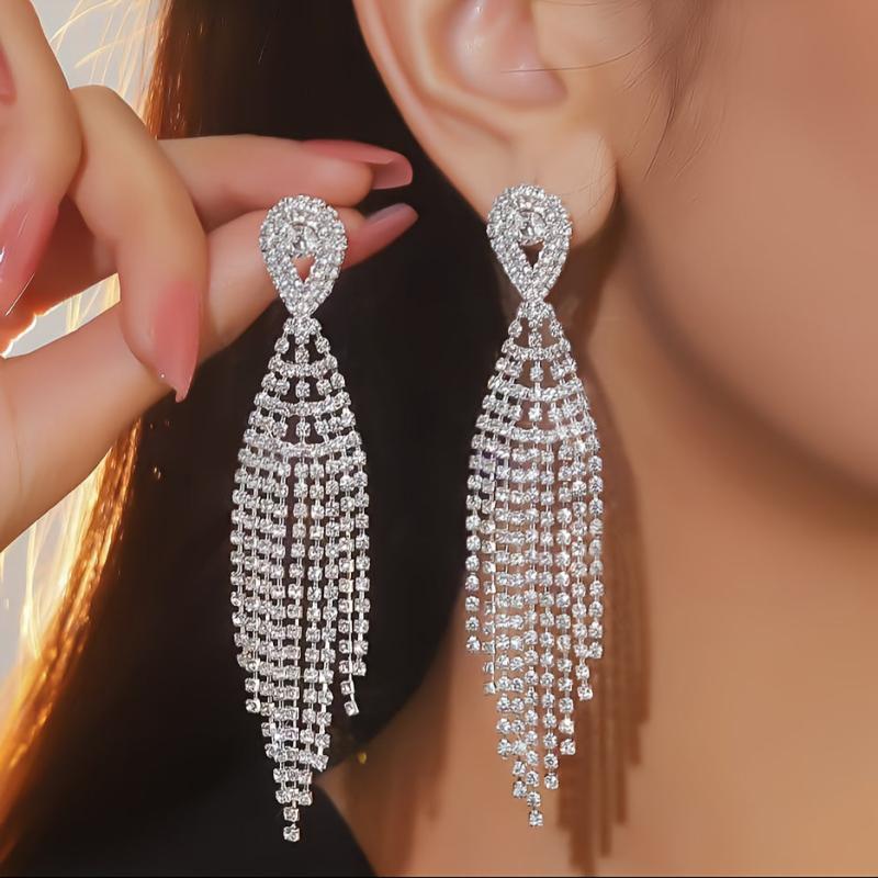 Elevate your look with these stunning dangle earrings featuring sparkling tassels and pavé rhinestones. Available in your choice of golden or silvery finish. Perfect for weddings and special occasions.