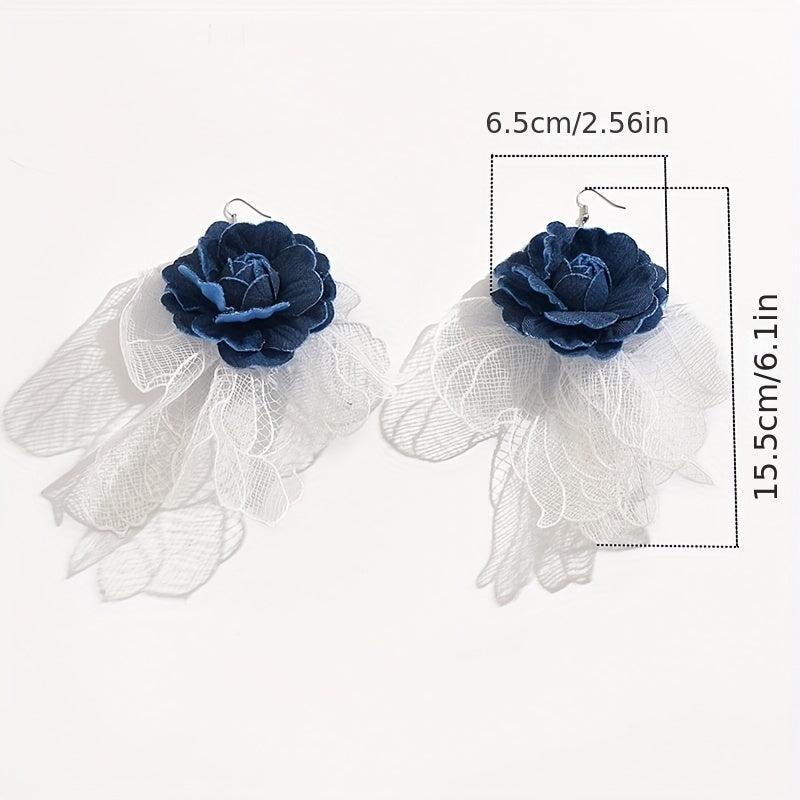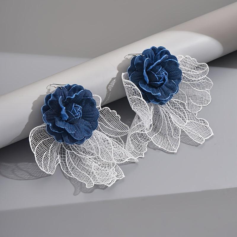 These denim lace flower earrings feature a bold layered floral design, perfect for everyday wear or special occasions. The hook style adds a touch of elegance to any outfit. They are crafted with iron ear pins for durability.