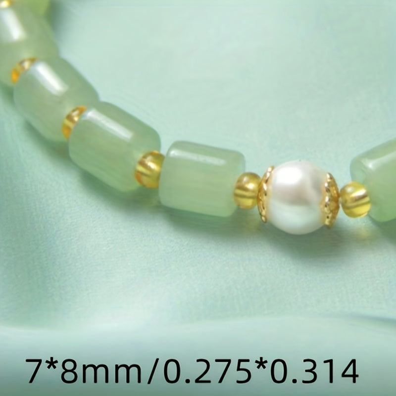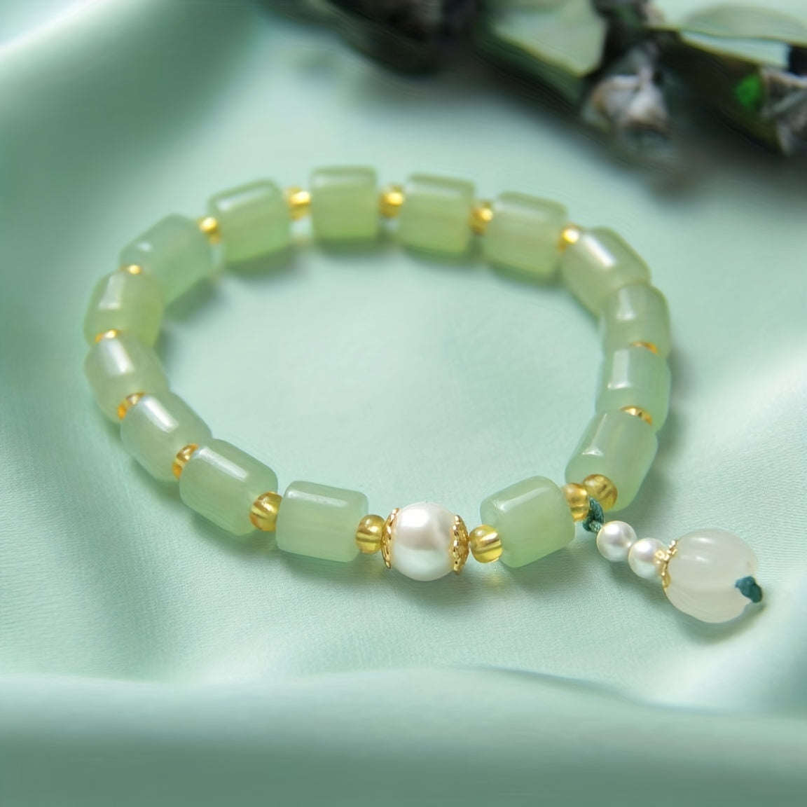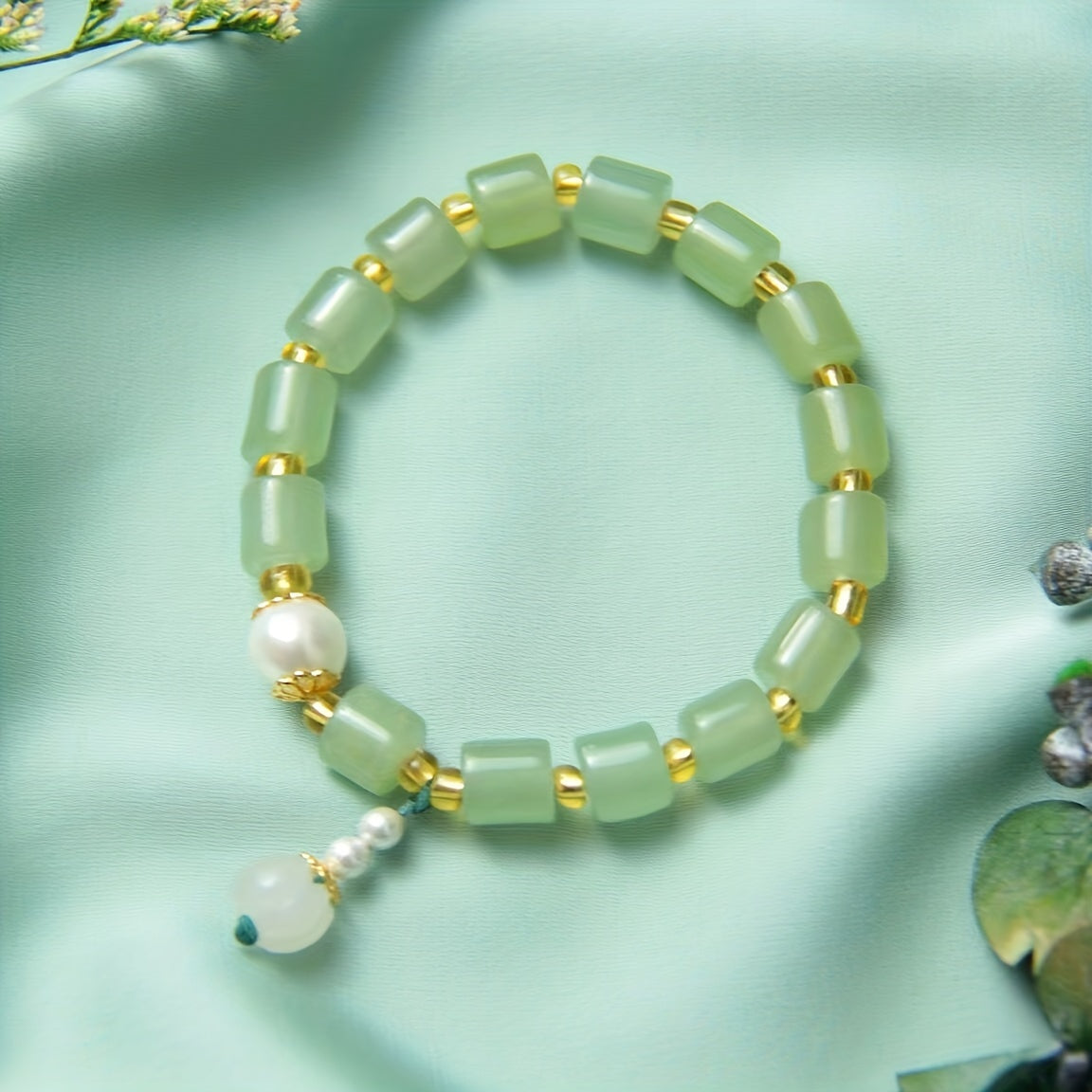 This elegant bracelet features emerald golden silk jade beads on a bamboo string, perfect for both men and women.