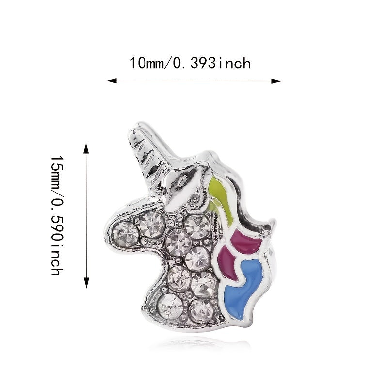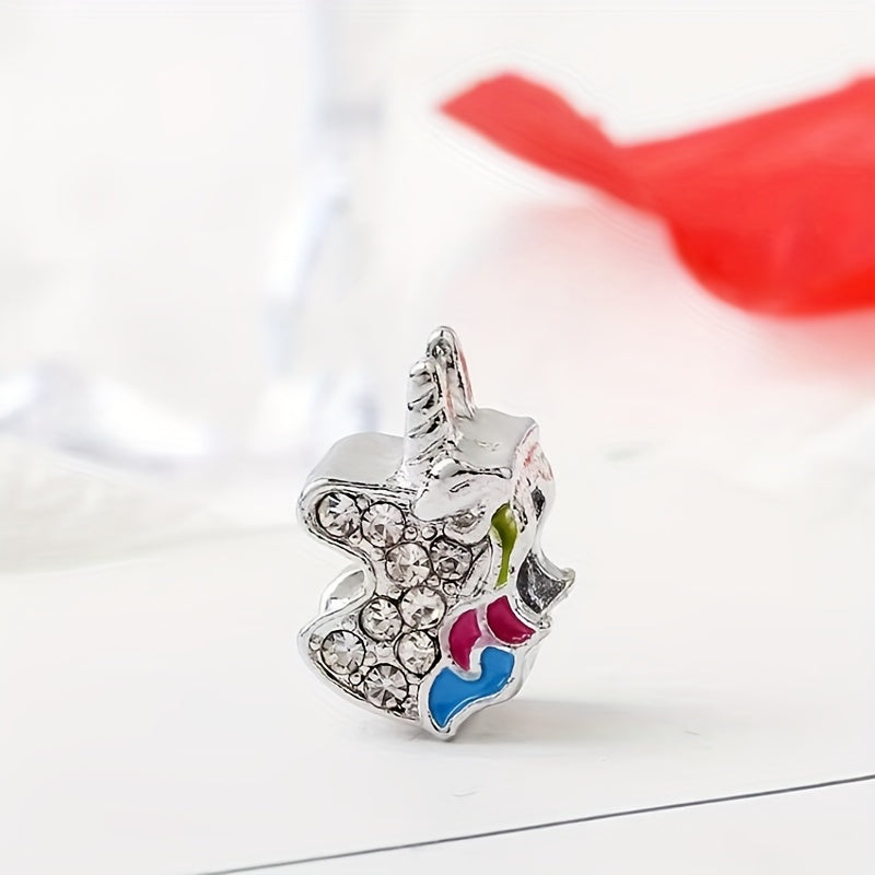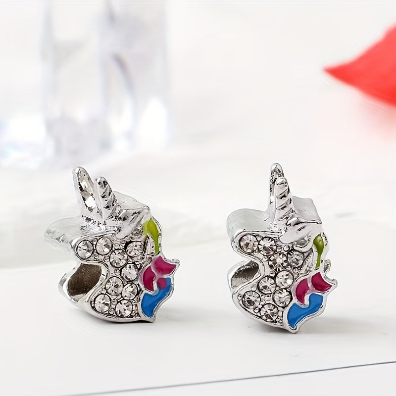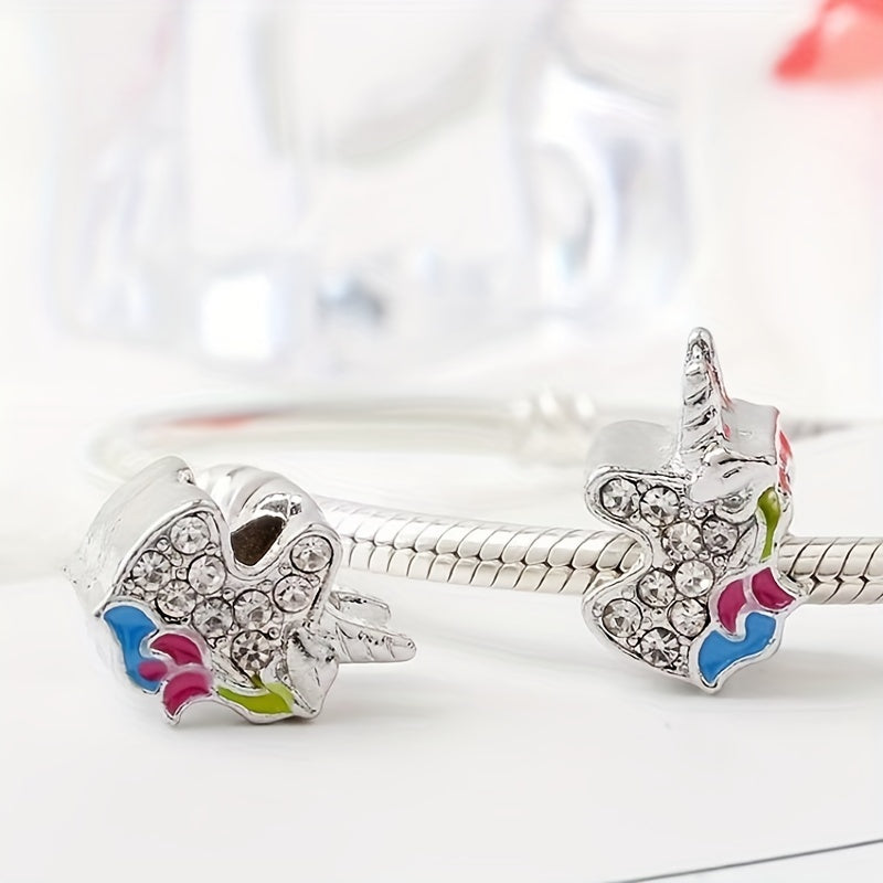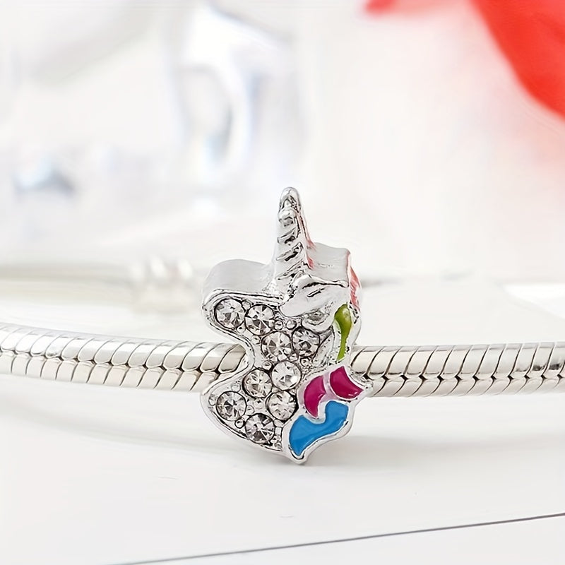 This large hole alloy bead features a rhinestone decorated enamel unicorn design. Perfect for DIY bracelets.