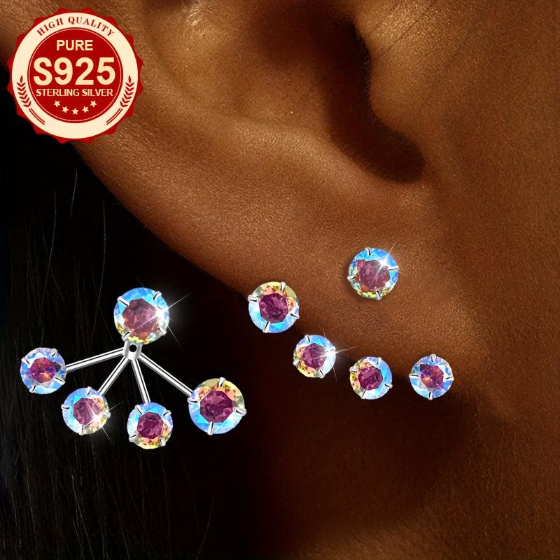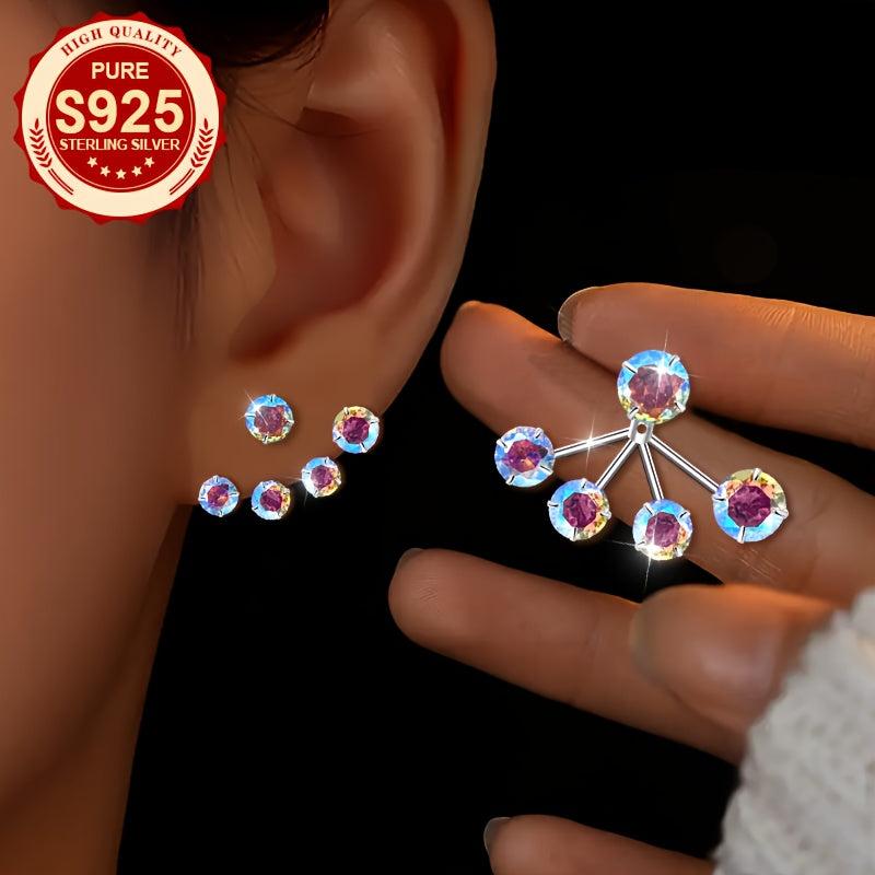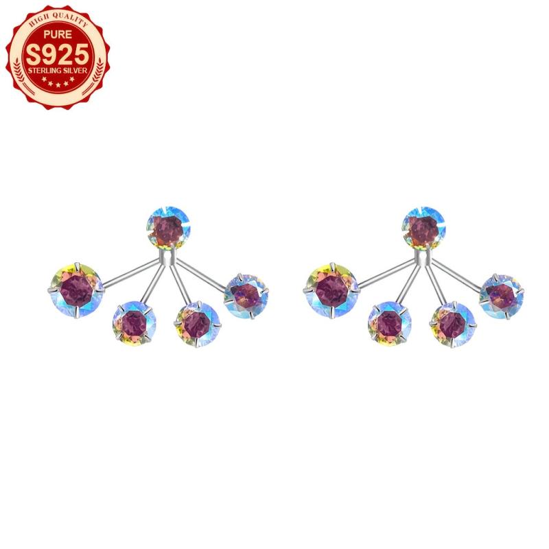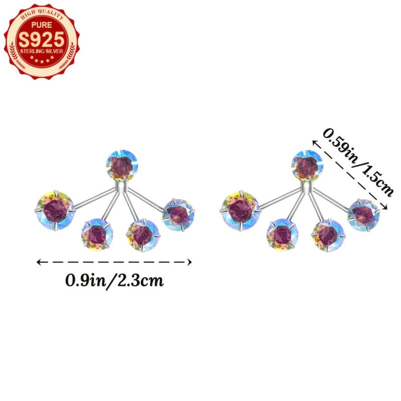 These stunning S925 silver earrings feature synthetic zirconia stones in a beautiful rainbow color arrangement. The flower-shaped studs are unique and trendy, perfect for adding a pop of color to any outfit.