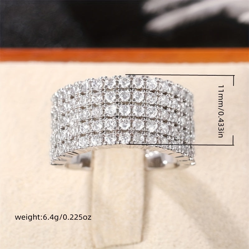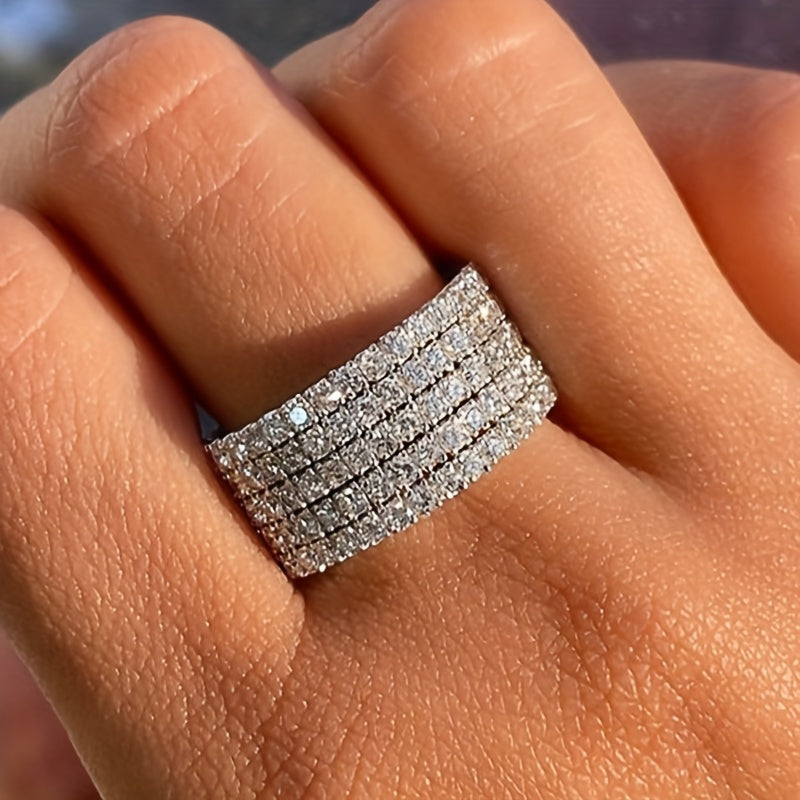 Add a touch of modern elegance with this five-row zirconia ring. Perfect for casual wear or special occasions, this durable band is a minimalist piece that complements any attire.