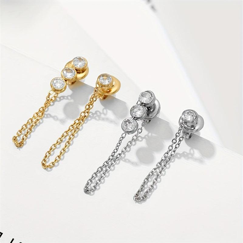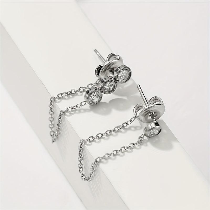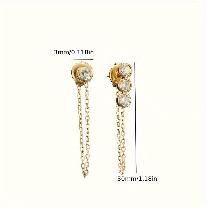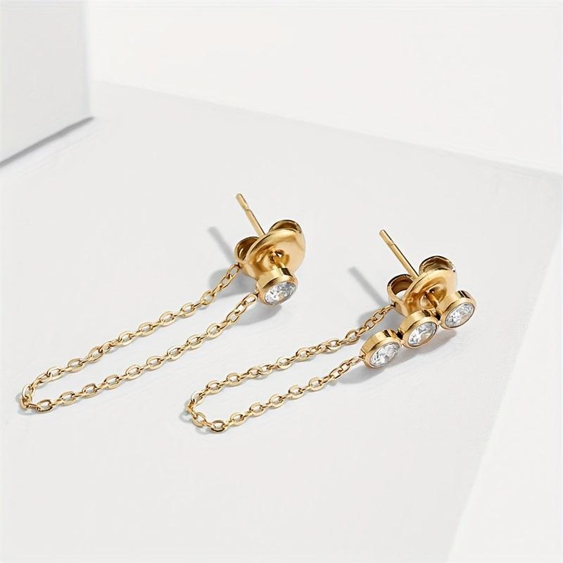 Golden Stainless Steel Zirconia Stud Earrings with Chain Detail