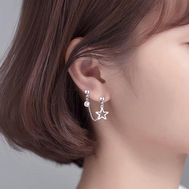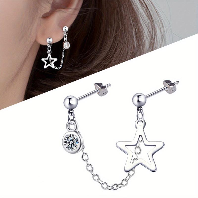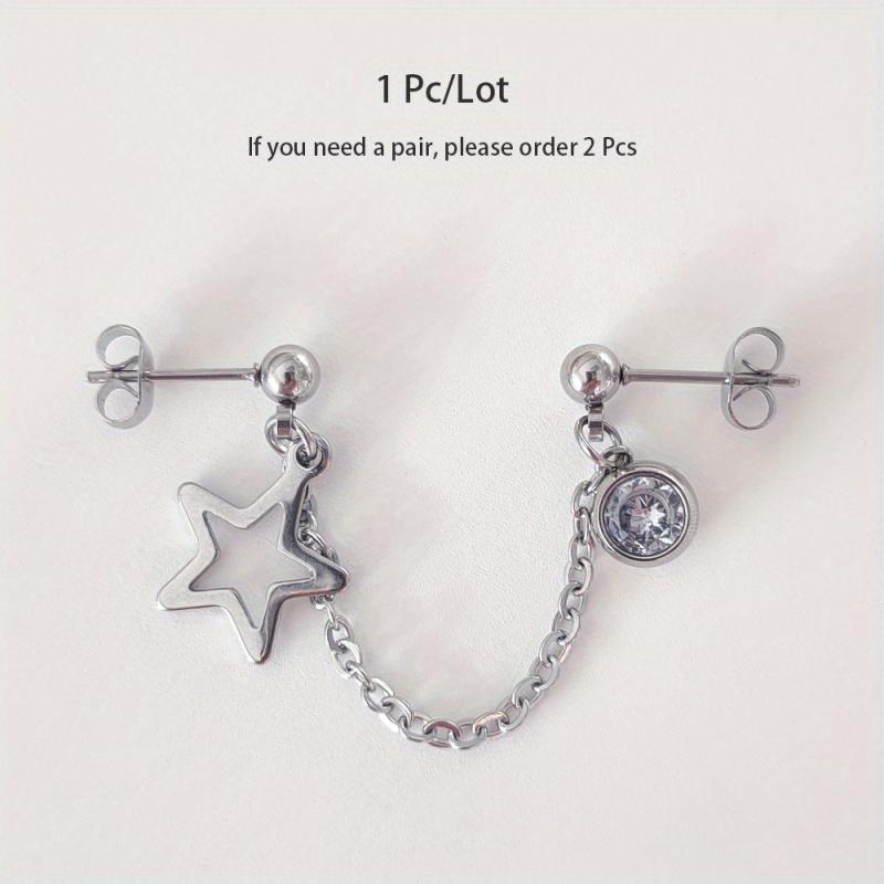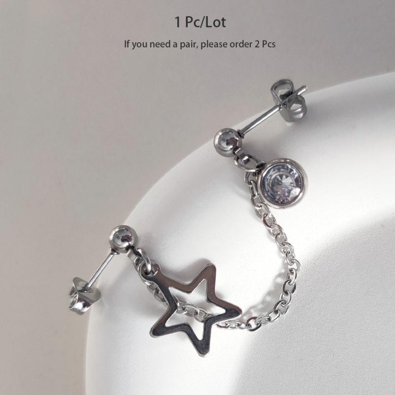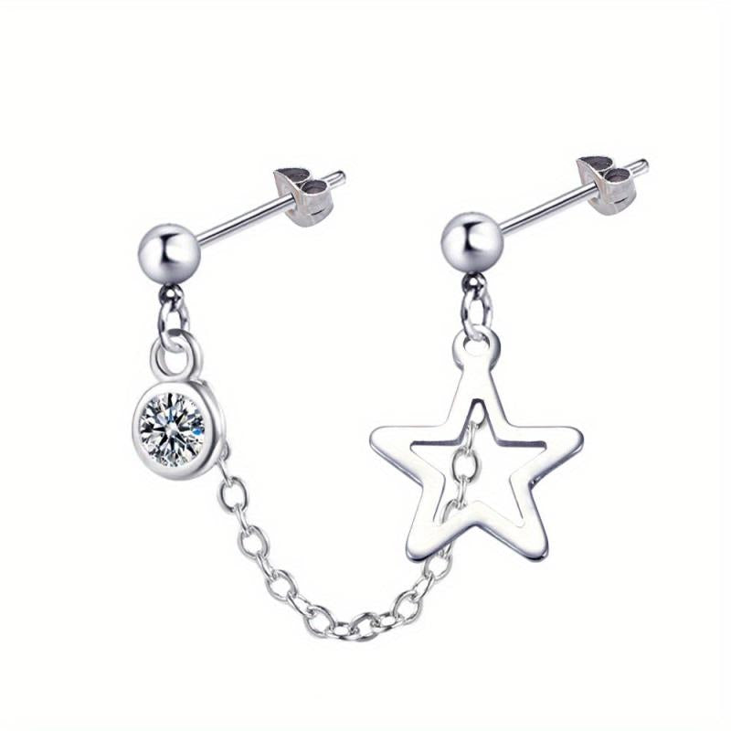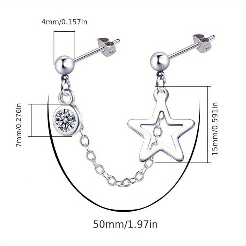 Stylish stainless steel earrings with double hole design featuring artificial Zirconia pendant and hollow star chain.