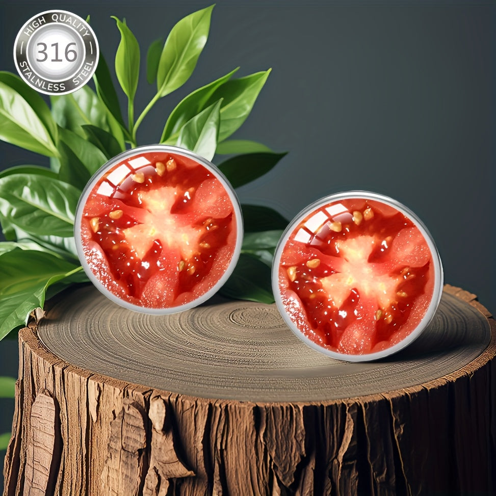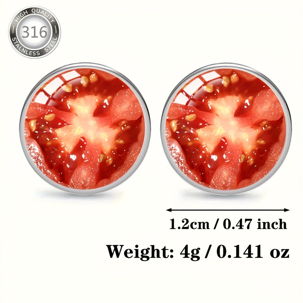 These earrings feature a fun design with tomato slice and star shaped glass studs encrusted in hypoallergenic 316 stainless steel. Durable and suitable for everyday wear, perfect for parties and events.
