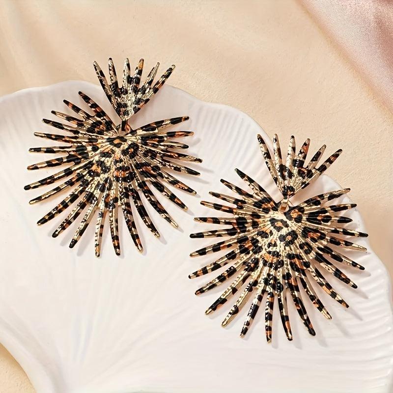 Make a bold statement with these stylish leopard print dangle earrings. The large fan shape adds a sexy and fashionable touch to your outfit. These earrings feature an iron ear needle for a personalized look.