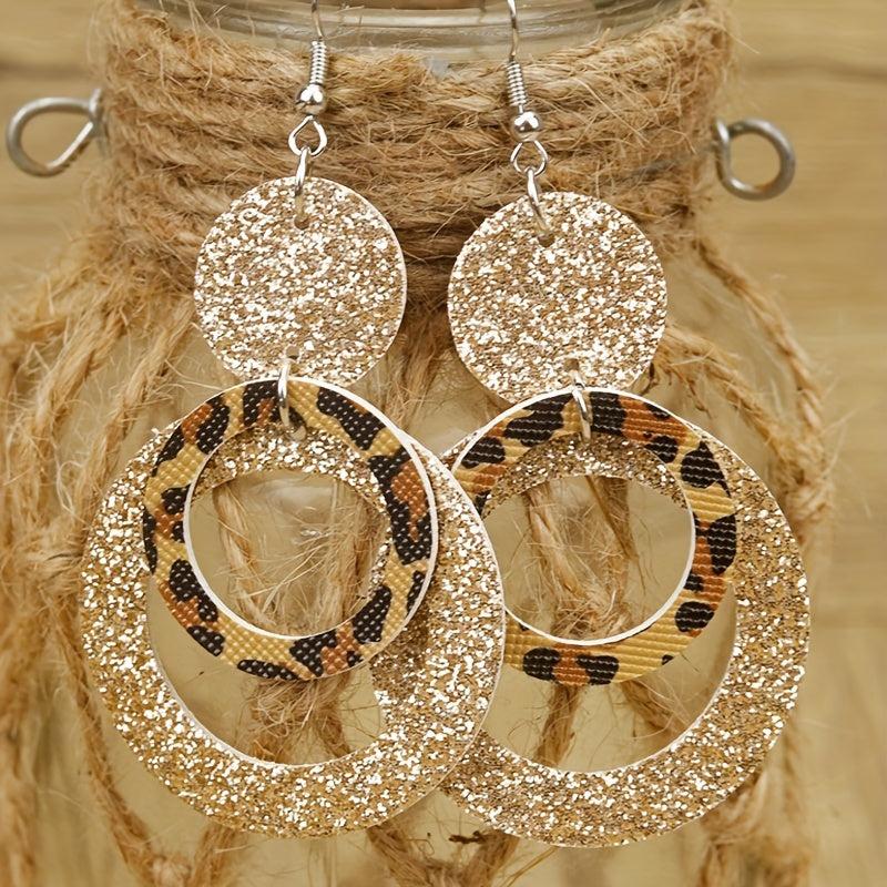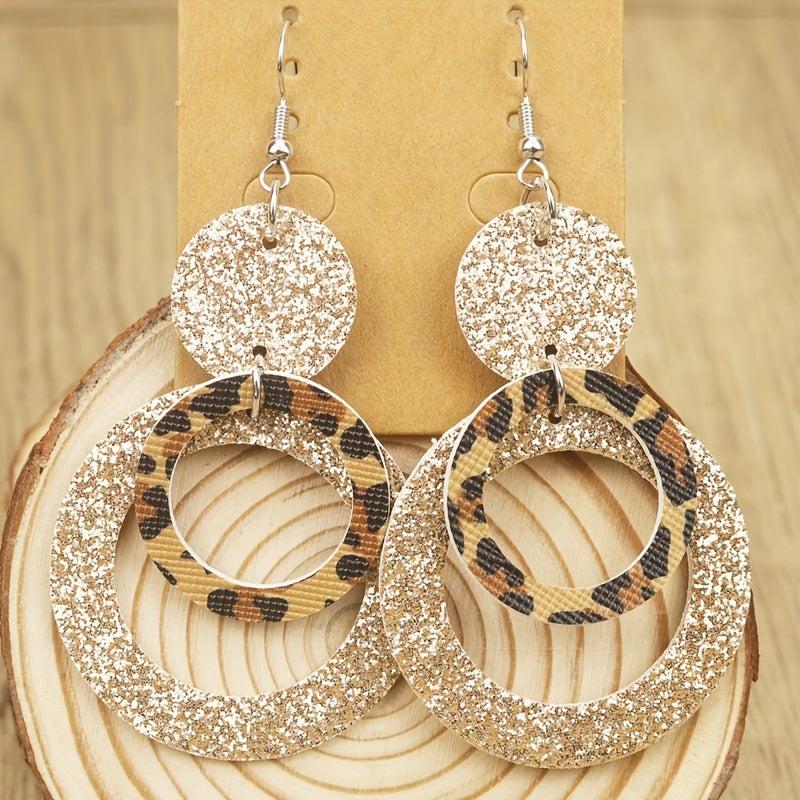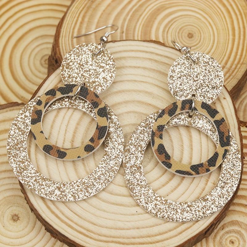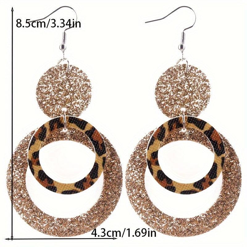 Make a bold statement with these leopard print and glitter layer PU leather dangle earrings. Perfect for adding a touch of style and sparkle to any outfit.