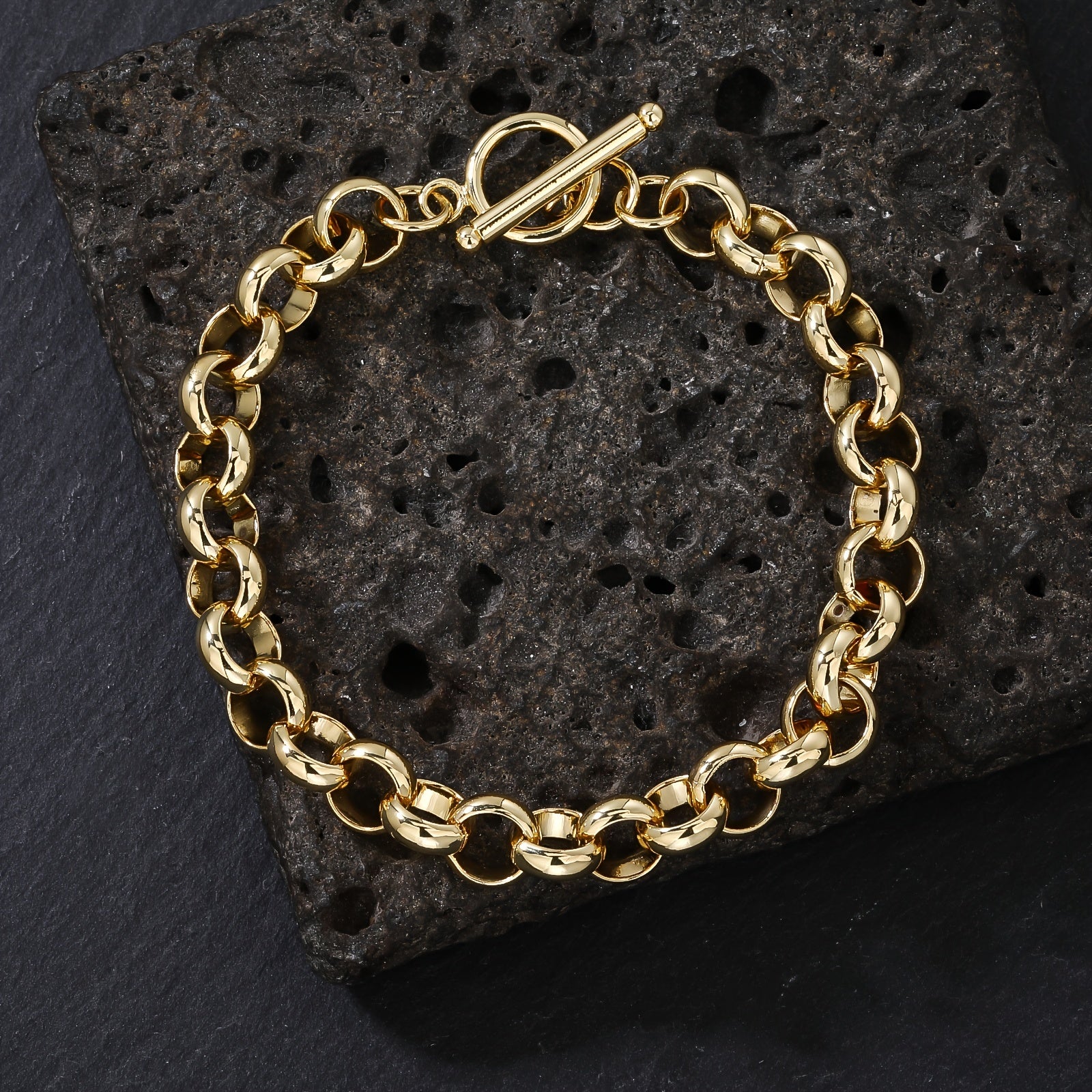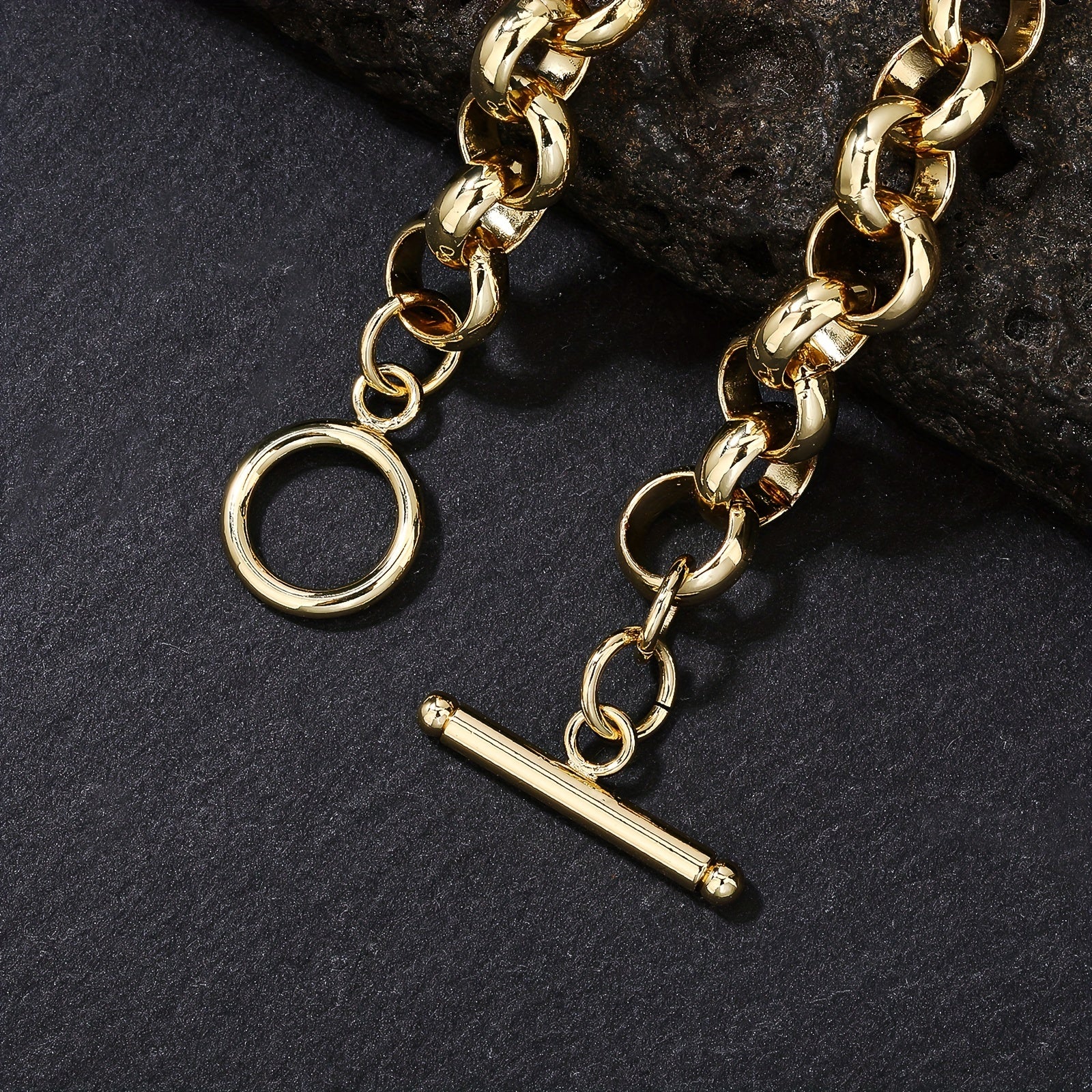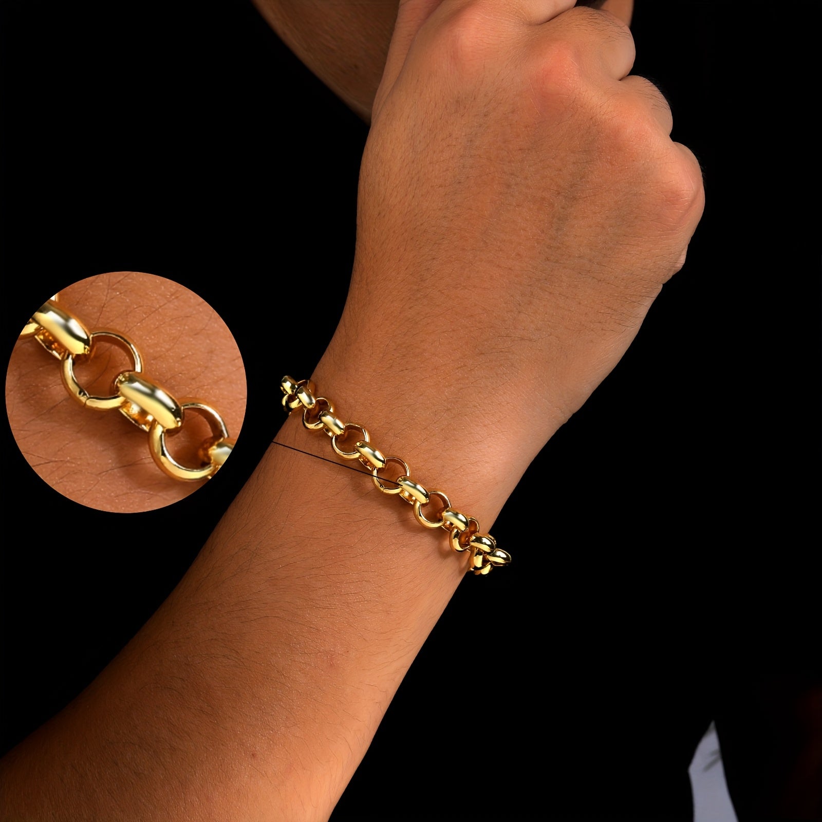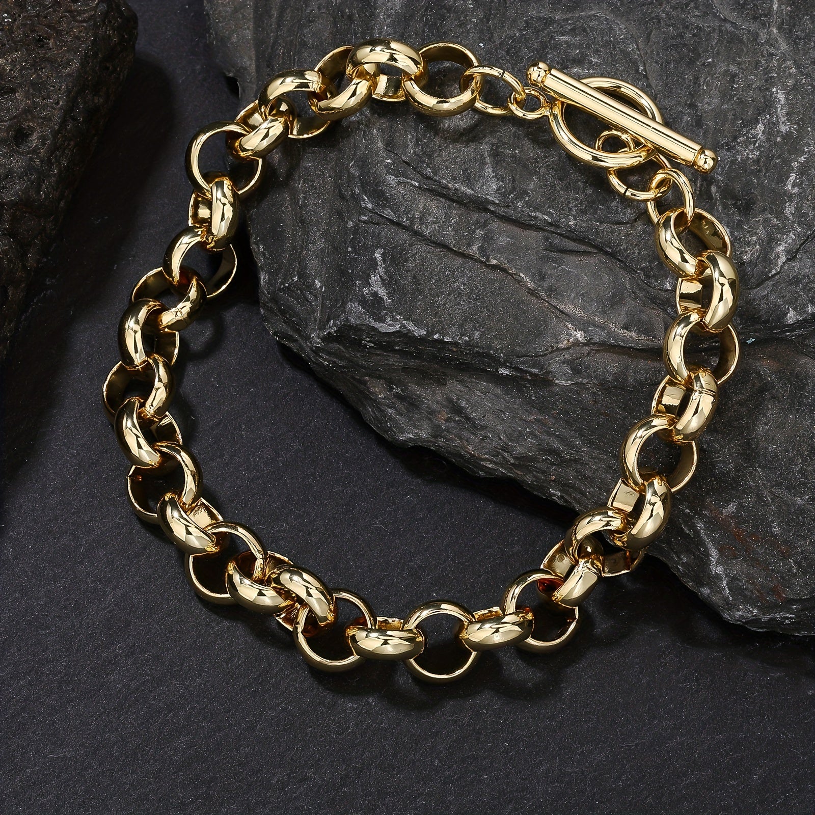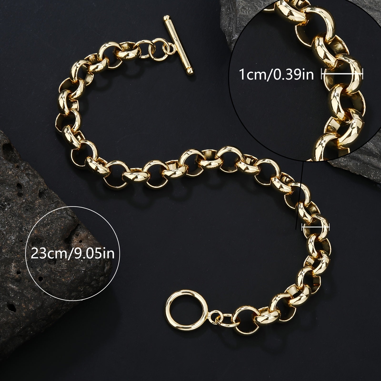 This stylish bracelet features a 10mm round link chain with a clasp. The golden tone and copper plated design make it perfect for casual attire or gifting.