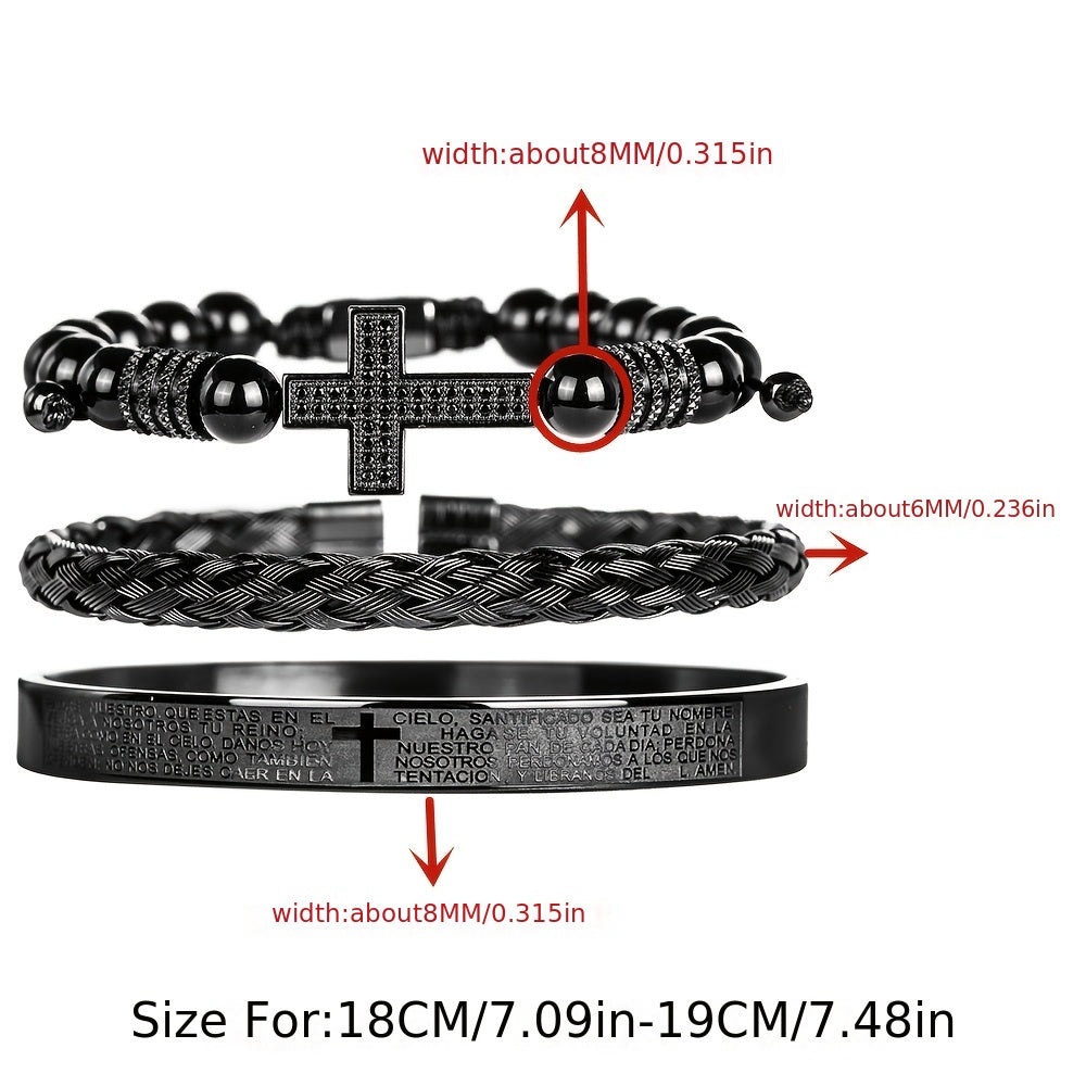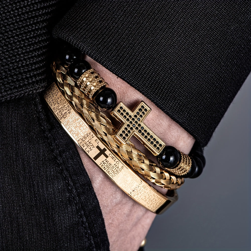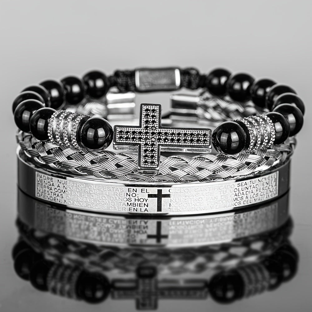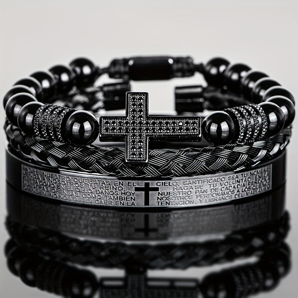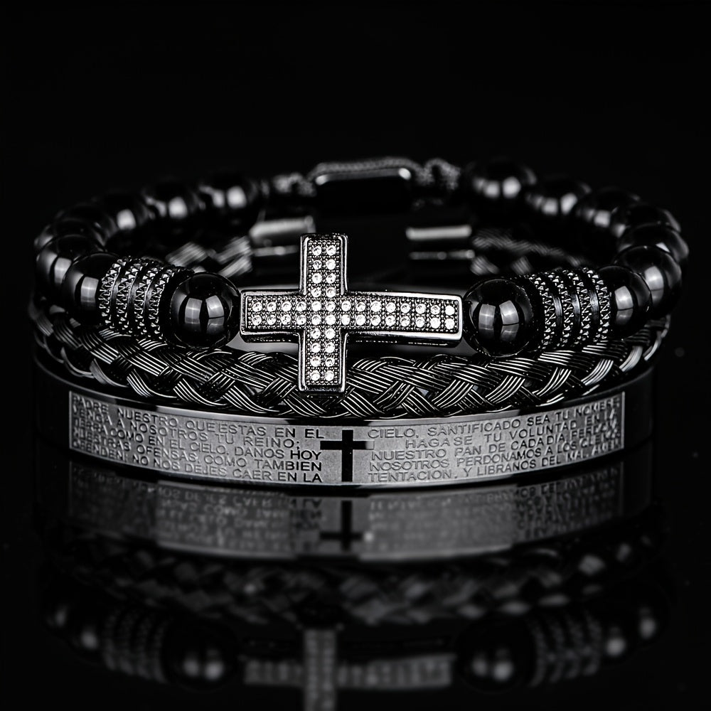 Elegant bracelet set featuring a micro encrusted cross bead and a woven Spanish Bible cross bracelet. Perfect for those who appreciate European vintage style.