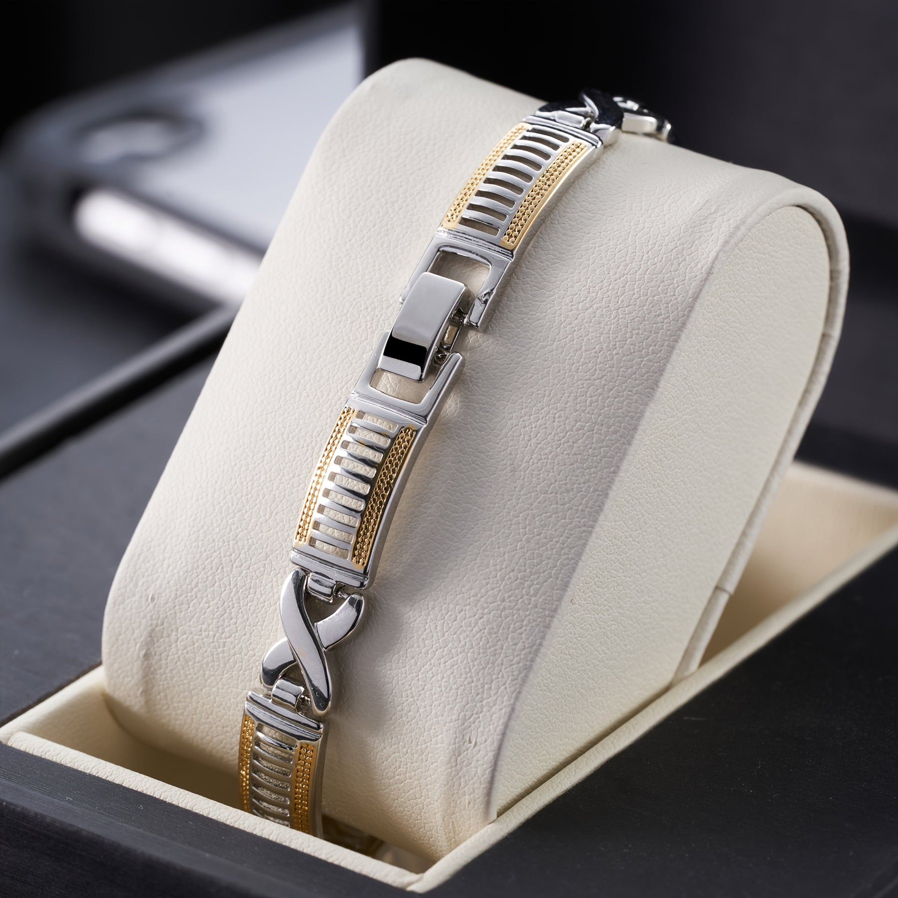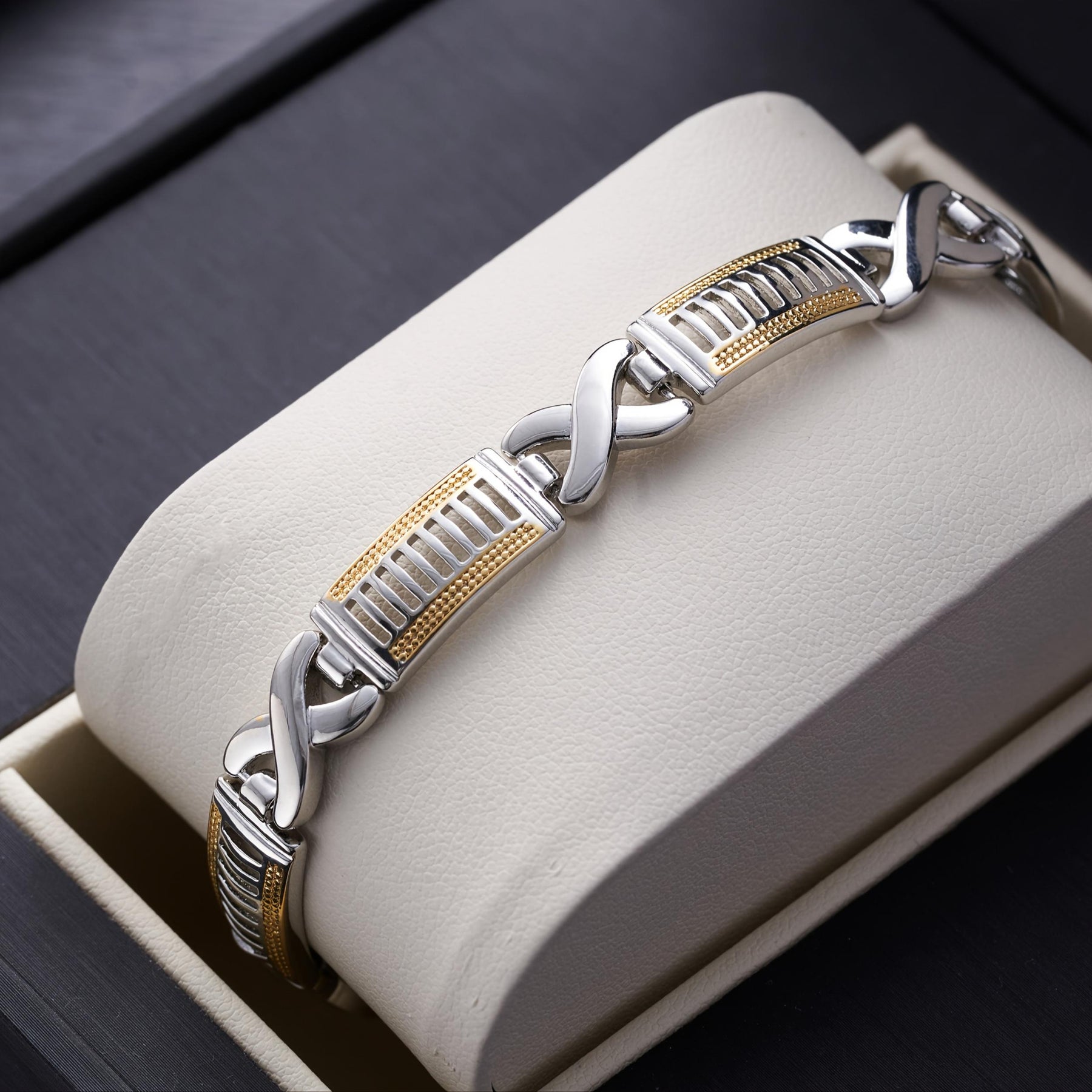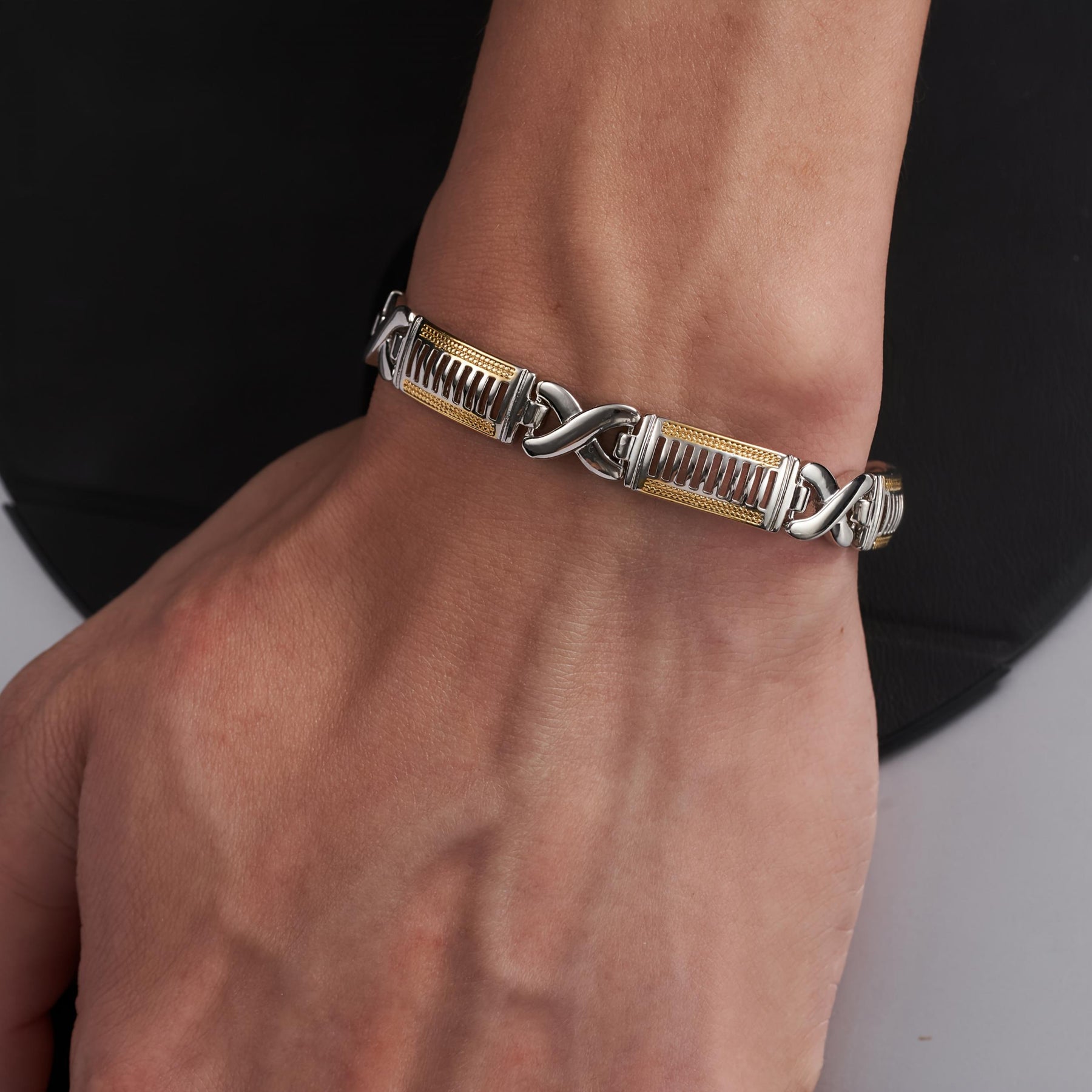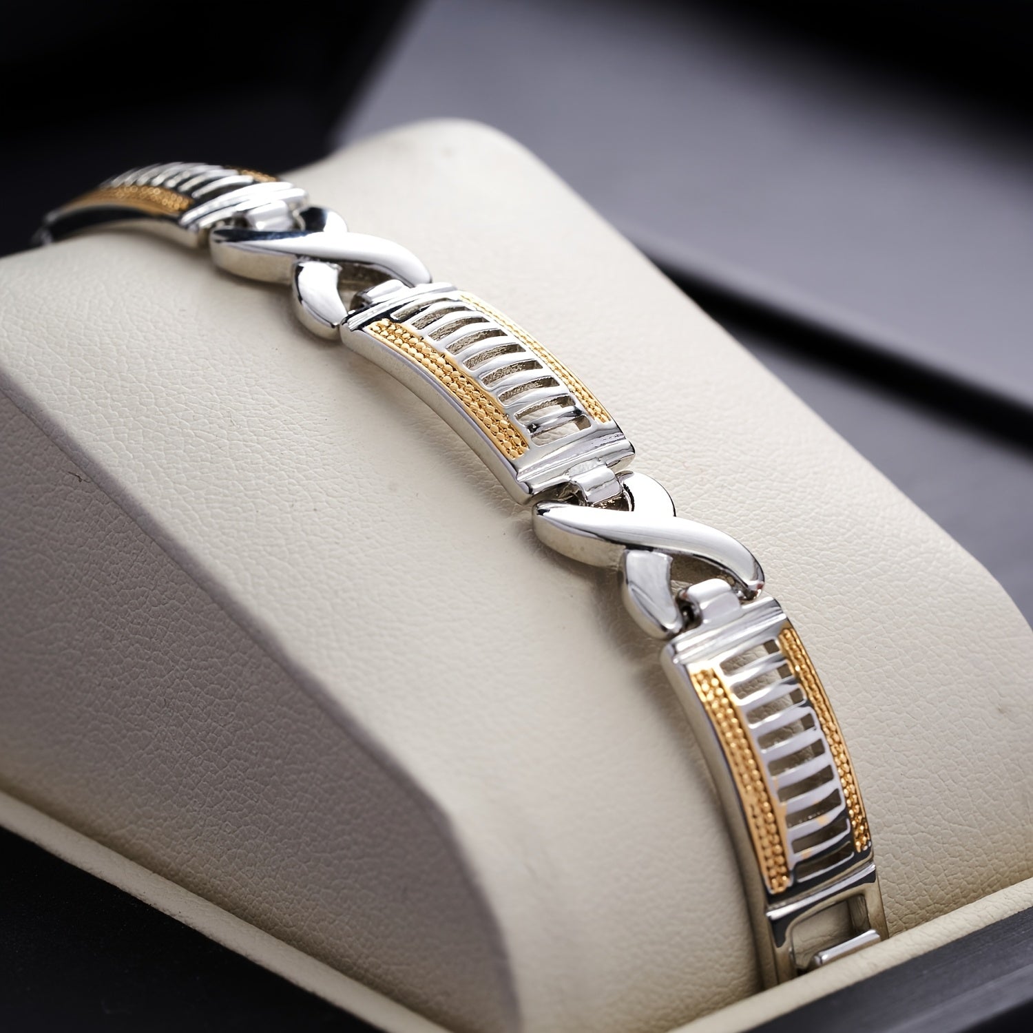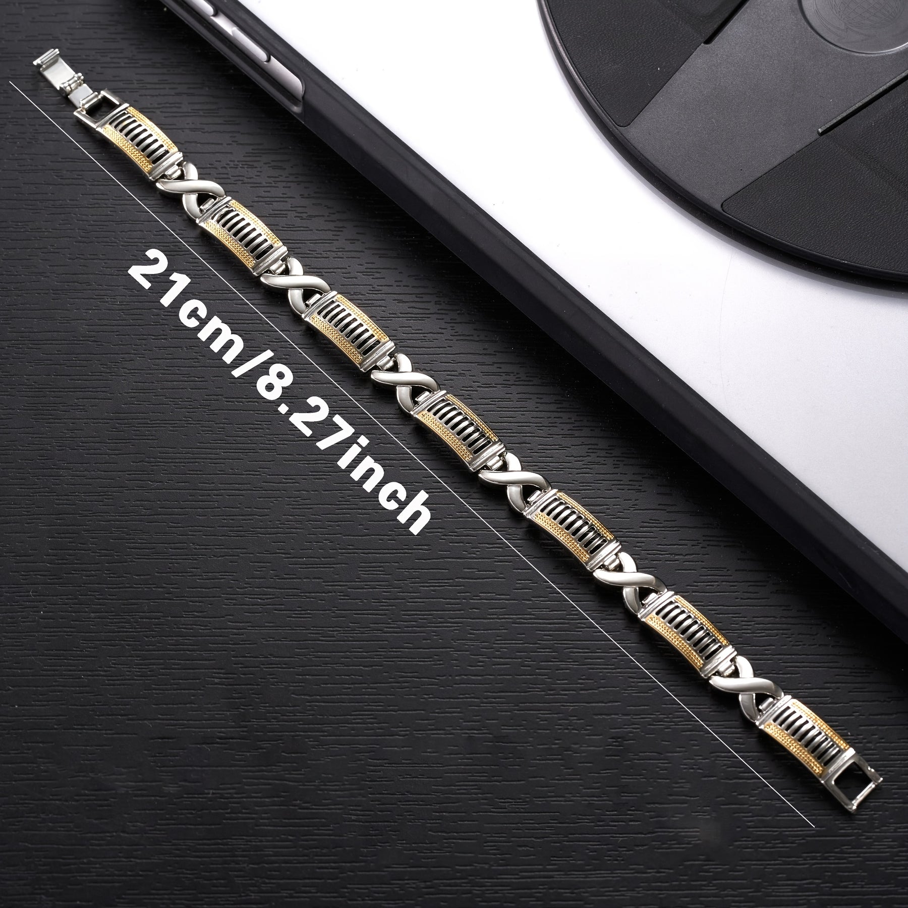 This stylish men's bracelet is made of copper with a golden plated dual rhombus chain design. It is hip hop and Cuban style, perfect for daily wear or as a gift for your boyfriend.